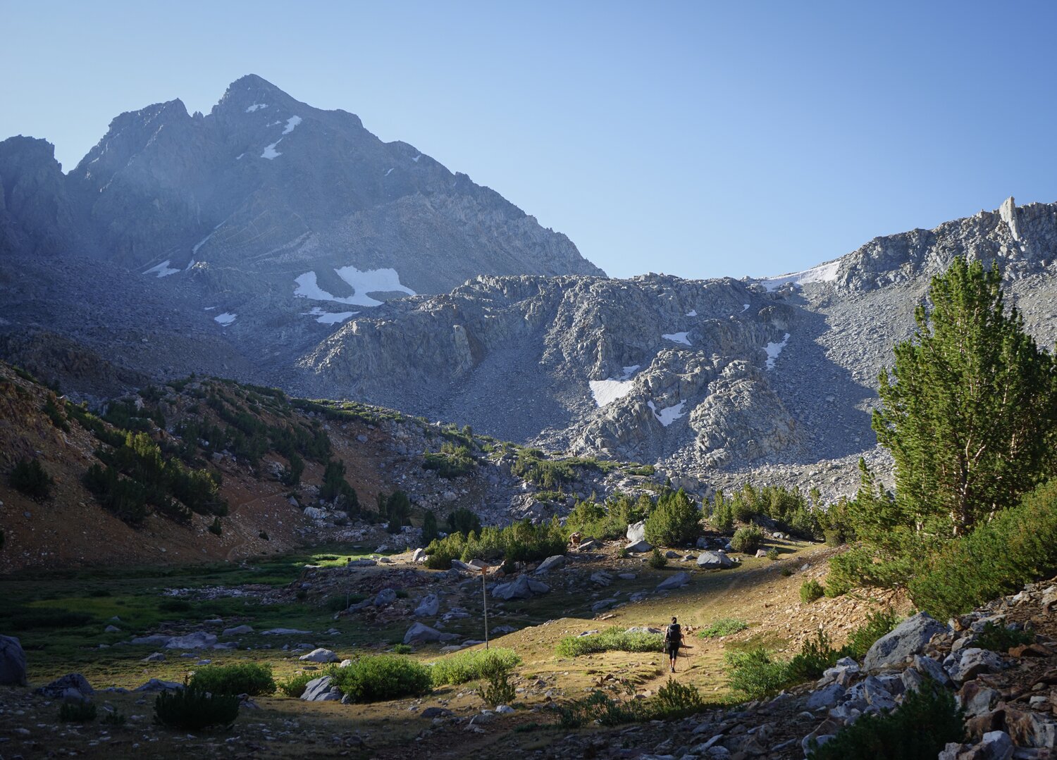 Columbine Peak, Giraud Peak, and the Black Divide rise above the remarkable Dusy Basin. From here, the route descends the Dusy Basin Trail for 1,000 feet before setting off cross country for Knapsack Pass to the South.