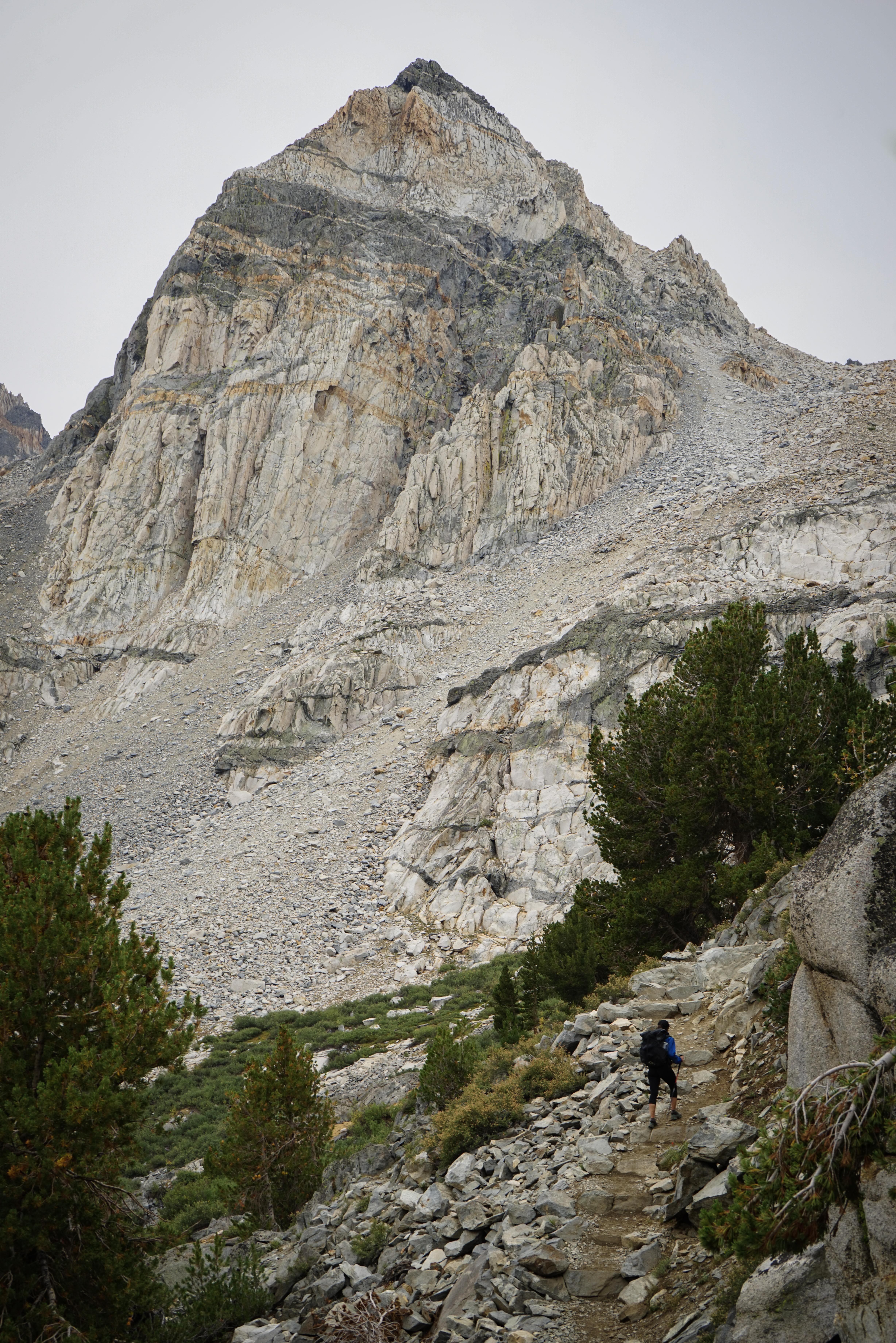 By mid day we reached the Rae Lakes area. Here’s the classic shot of Fin Dome rising above the outlet of Arrowhead Lake, with some of the higher peaks just barely visible in the background.