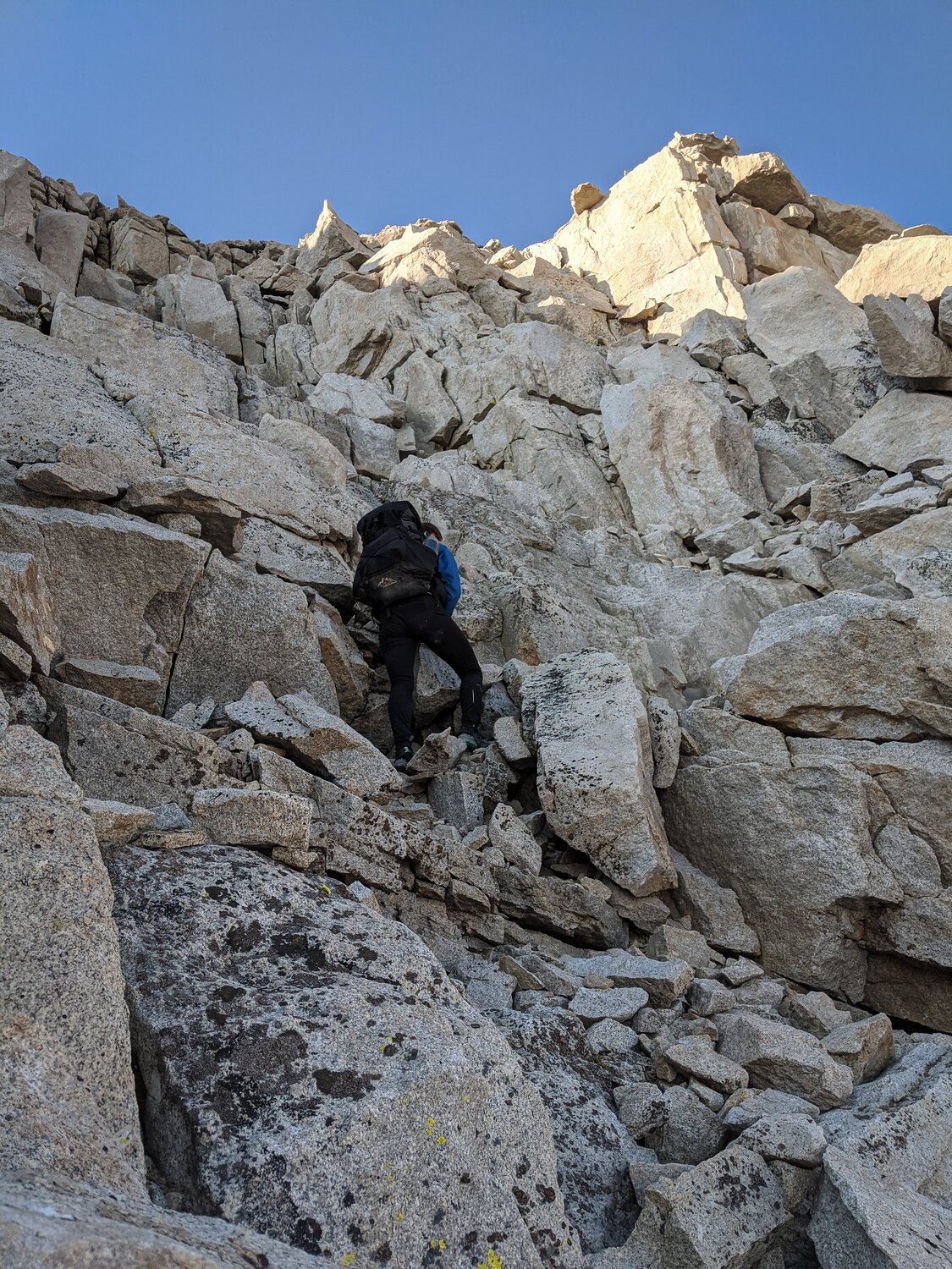 The class 3 section on Mount Muir is not long, but it’s quite tricky with a delicate slab move near the top. Choose the wrong route and you’ll find yourself with 2,000’ of air beneath your feet. There are plenty of useful annotated pictures on the internet.