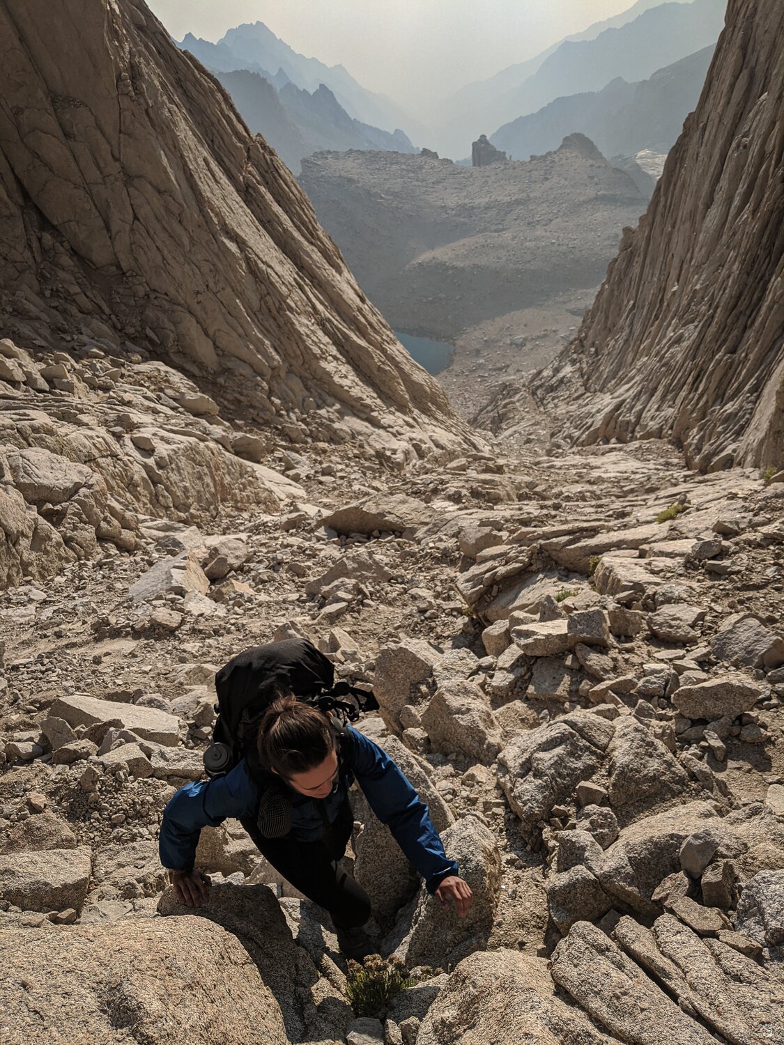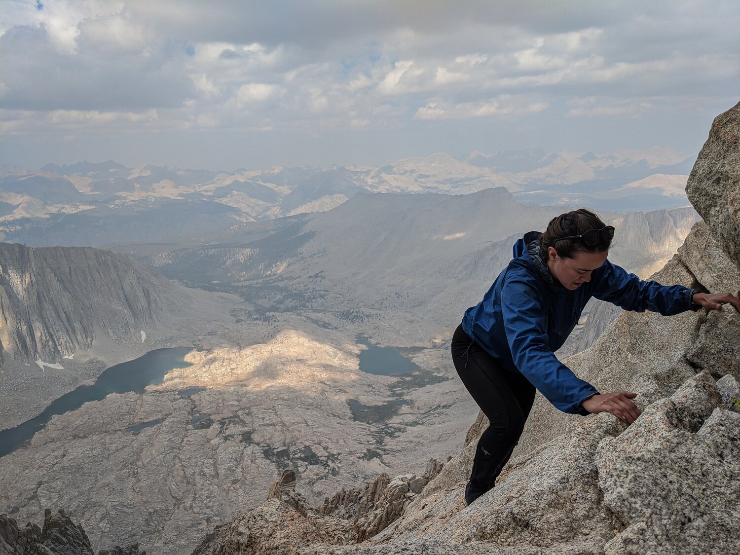 Shannon downclimbing from Mount Whitney. It was almost noon and clouds were building again.