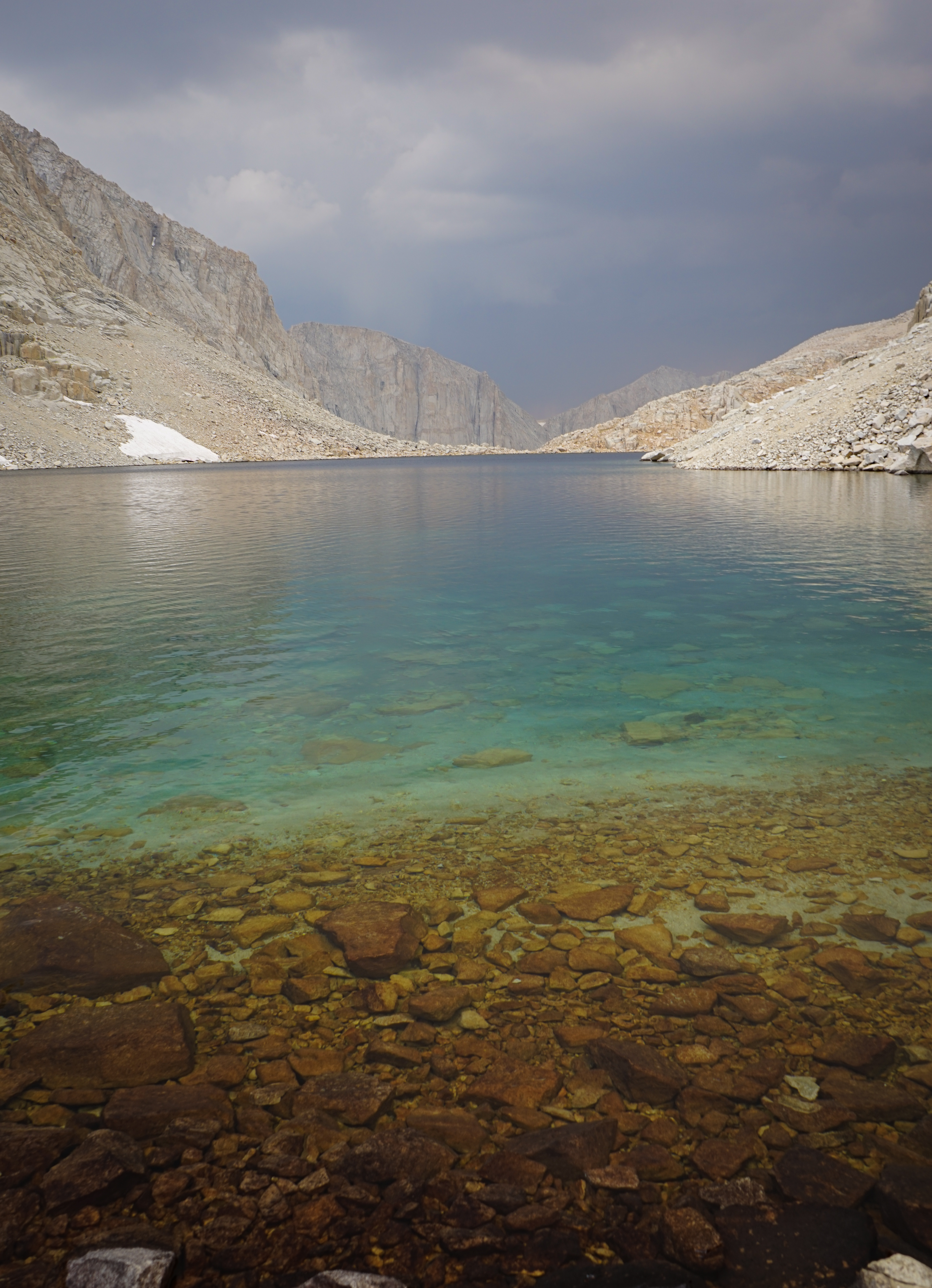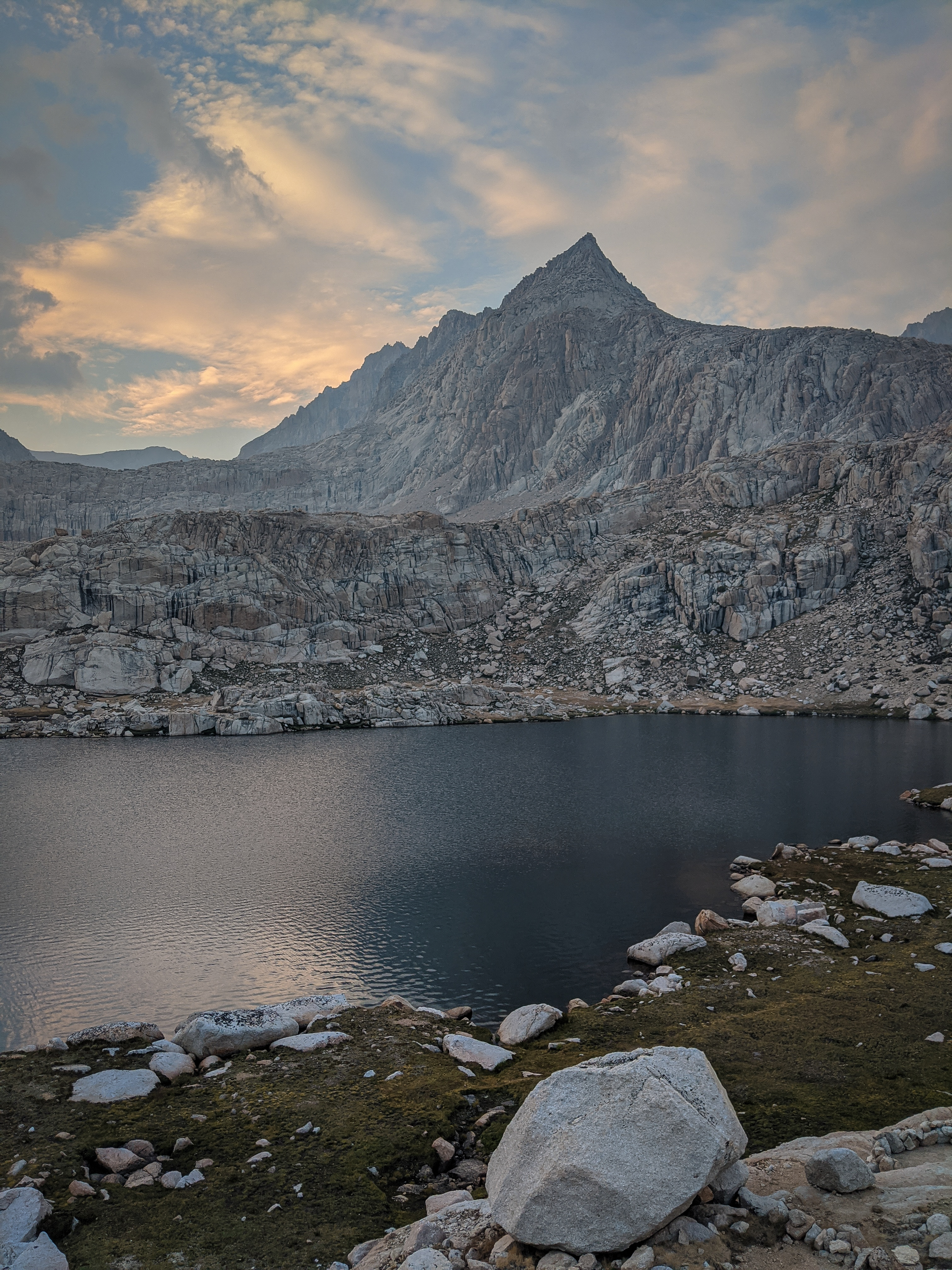 When I was refilling water from the lake, a couple of guys with very small backpacks headed past on the trail. I chatted with them for a while, they were near the tail end of a two week hike linking sections of the Yosemite High Route, the Sierra High Route, and the Southern Sierra High Route. They relayed some stories of difficult terrain crossing from the Merced drainage to Bench Canyon where they took an alternate described by Roper. They also told me about some fairly sketchy travel on the Acrodectes alternate, descending Mount Baxter, which made me happy to have skipped that section. Interestingly, they also decided to skip Junction Pass based on the description.