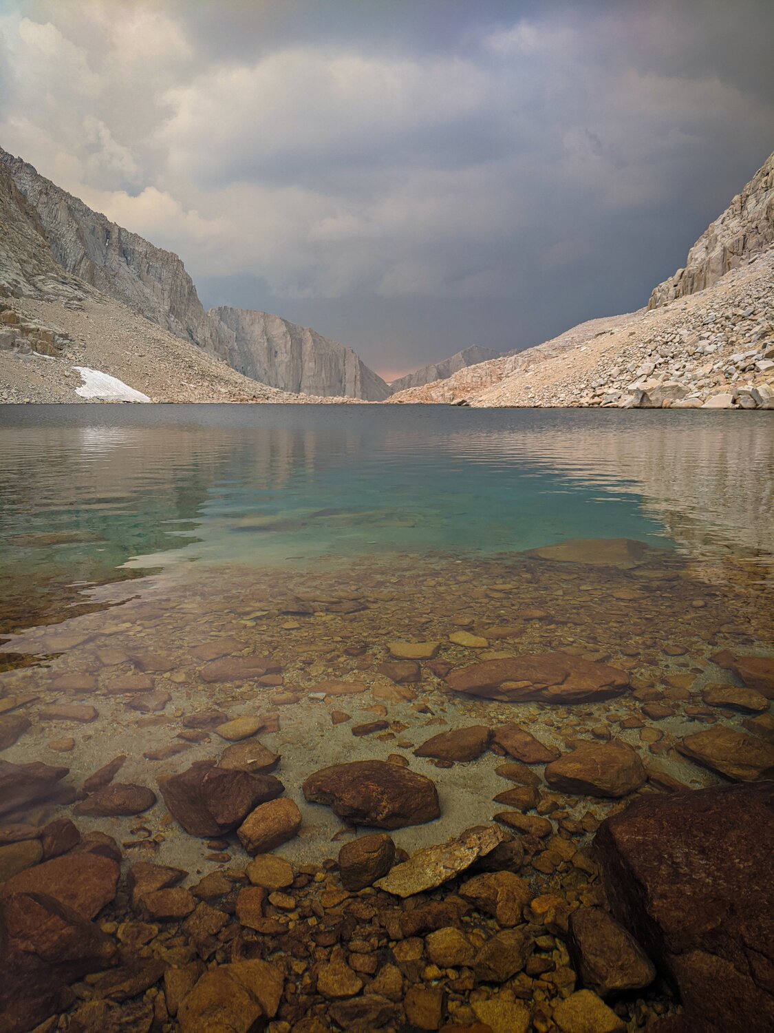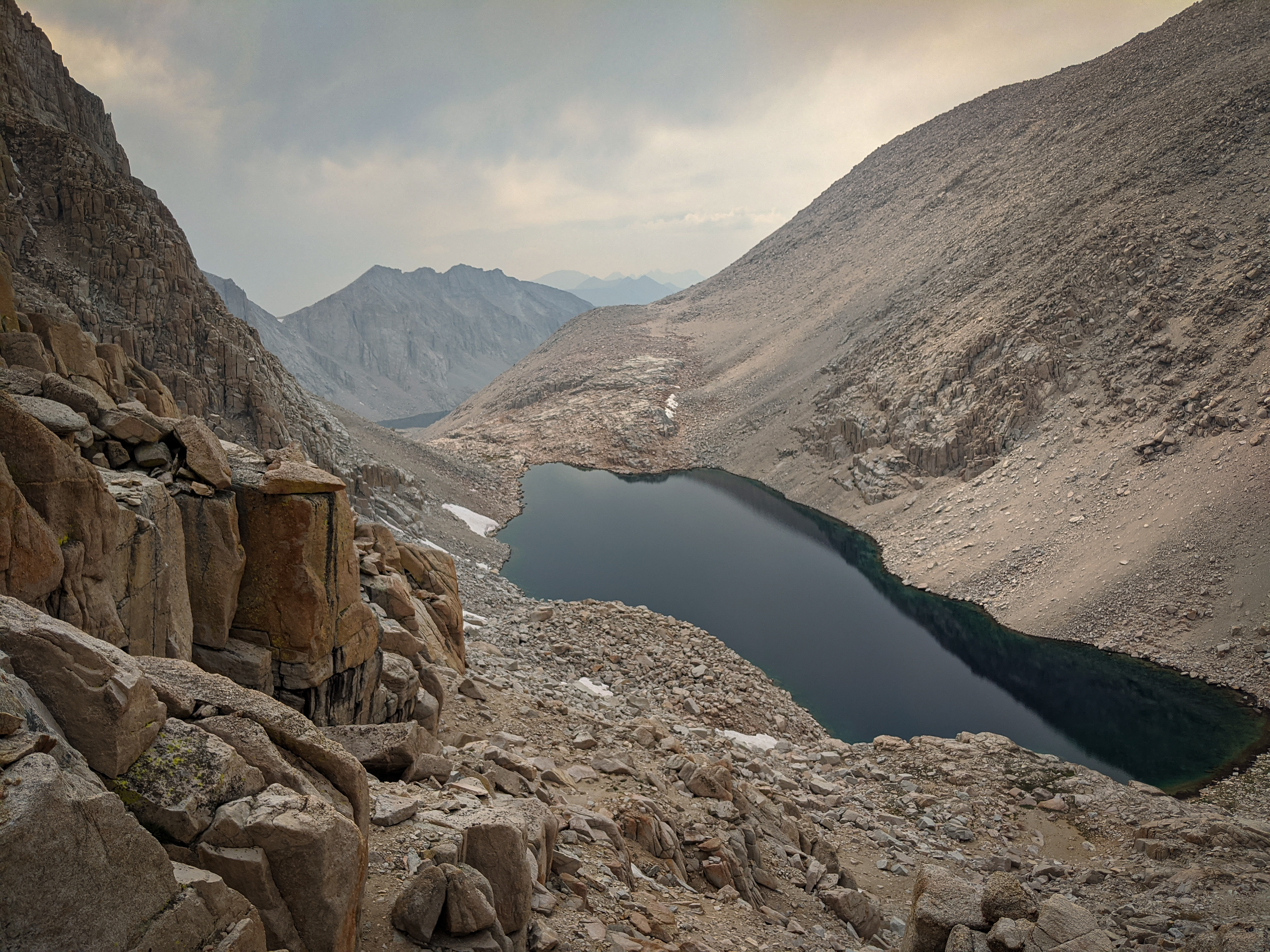 As the sky darkened above us, we noticed an orange glow through the gap between Mount Chamberlain and Crabtree Crags. Given that it was still midday, this was definitely from one of the wildfires. But the location of the glow, which we guessed was near Chagoopa Plateau, didn’t exactly line up with the fires we knew about. Even in retrospect, it’s difficult to determine whether the glow was from a smaller, northern fire like the Shotgun Fire, or the larger Castle Fire (both of these were later renamed the SQF Complex Fire) farther south. But in either case, the glow was close enough to worry us a bit. However, we knew the only hazard in our alpine setting was smoke and made a plan to monitor conditions and hurry out if they deteriorated.