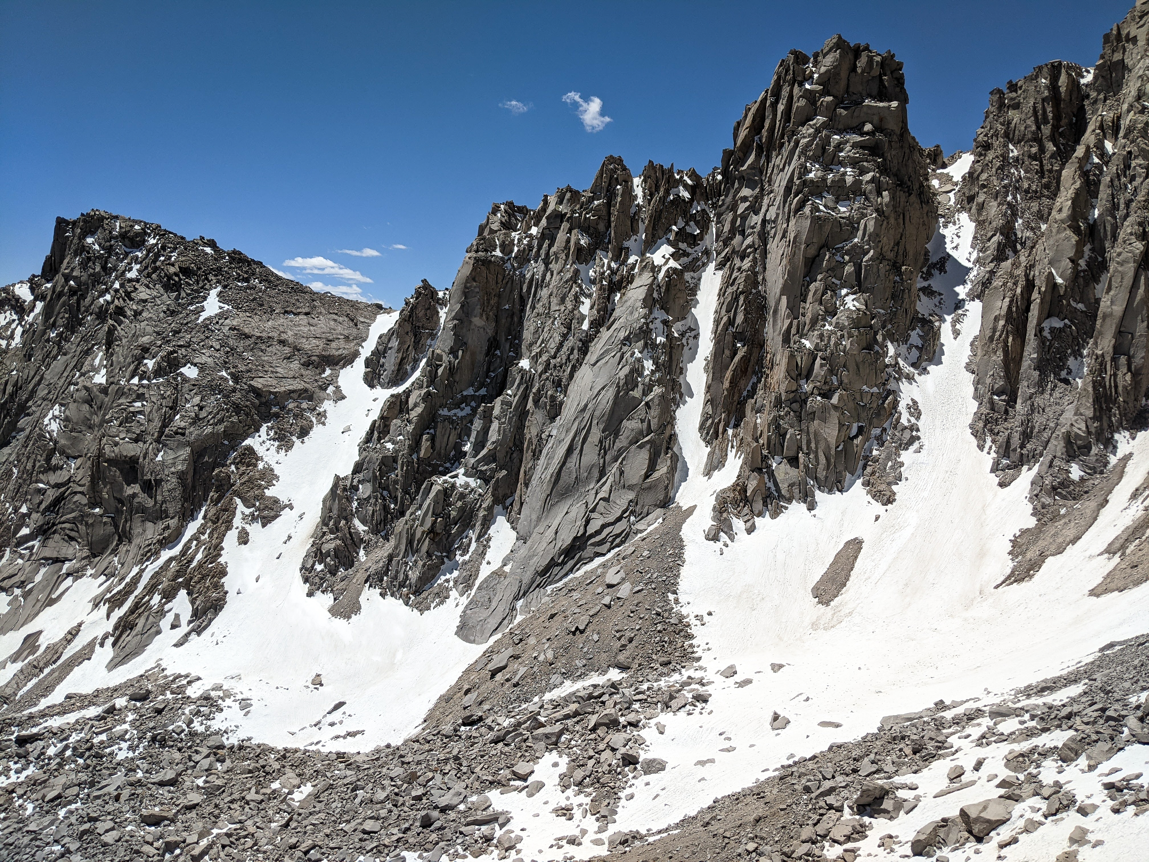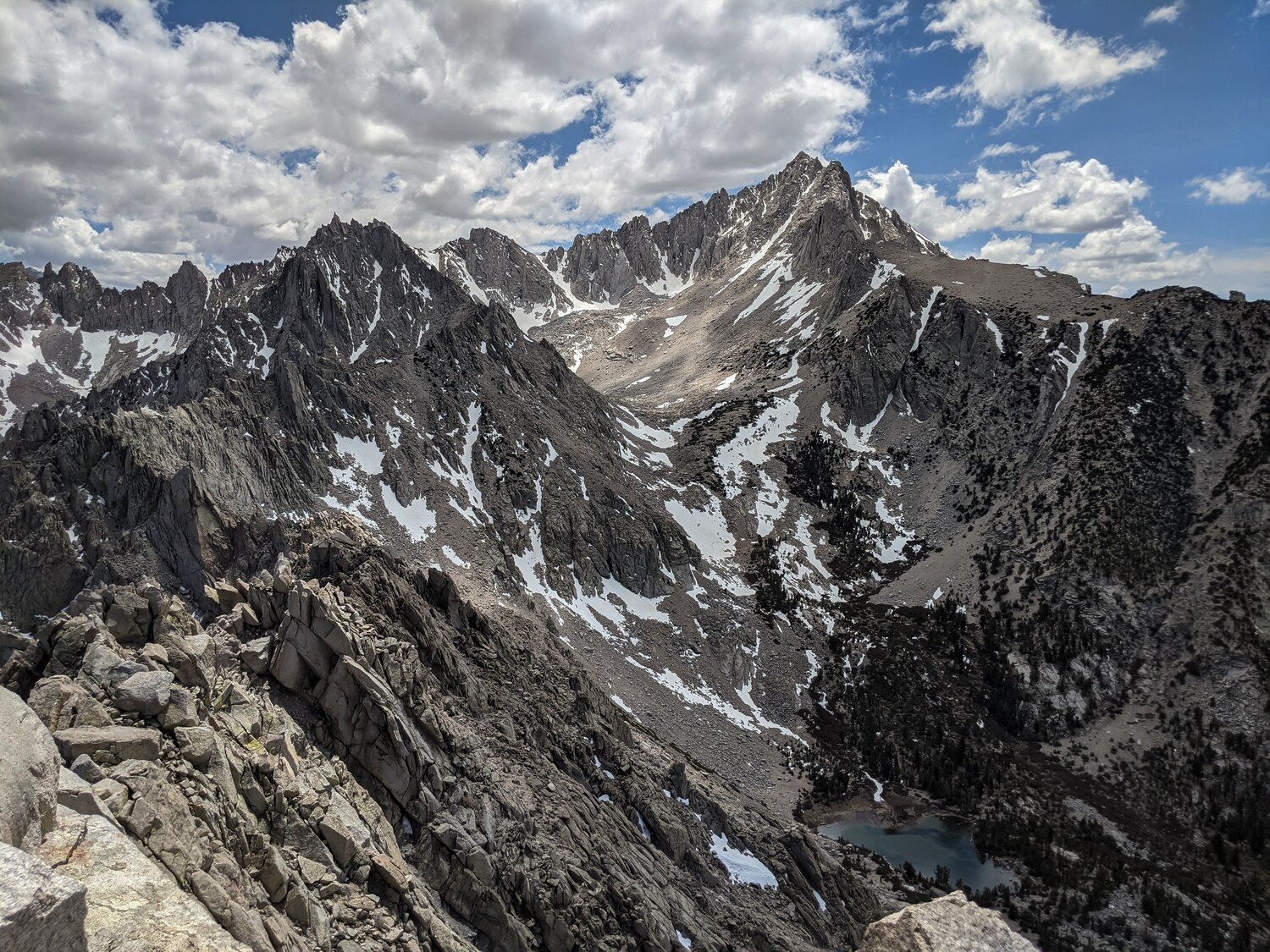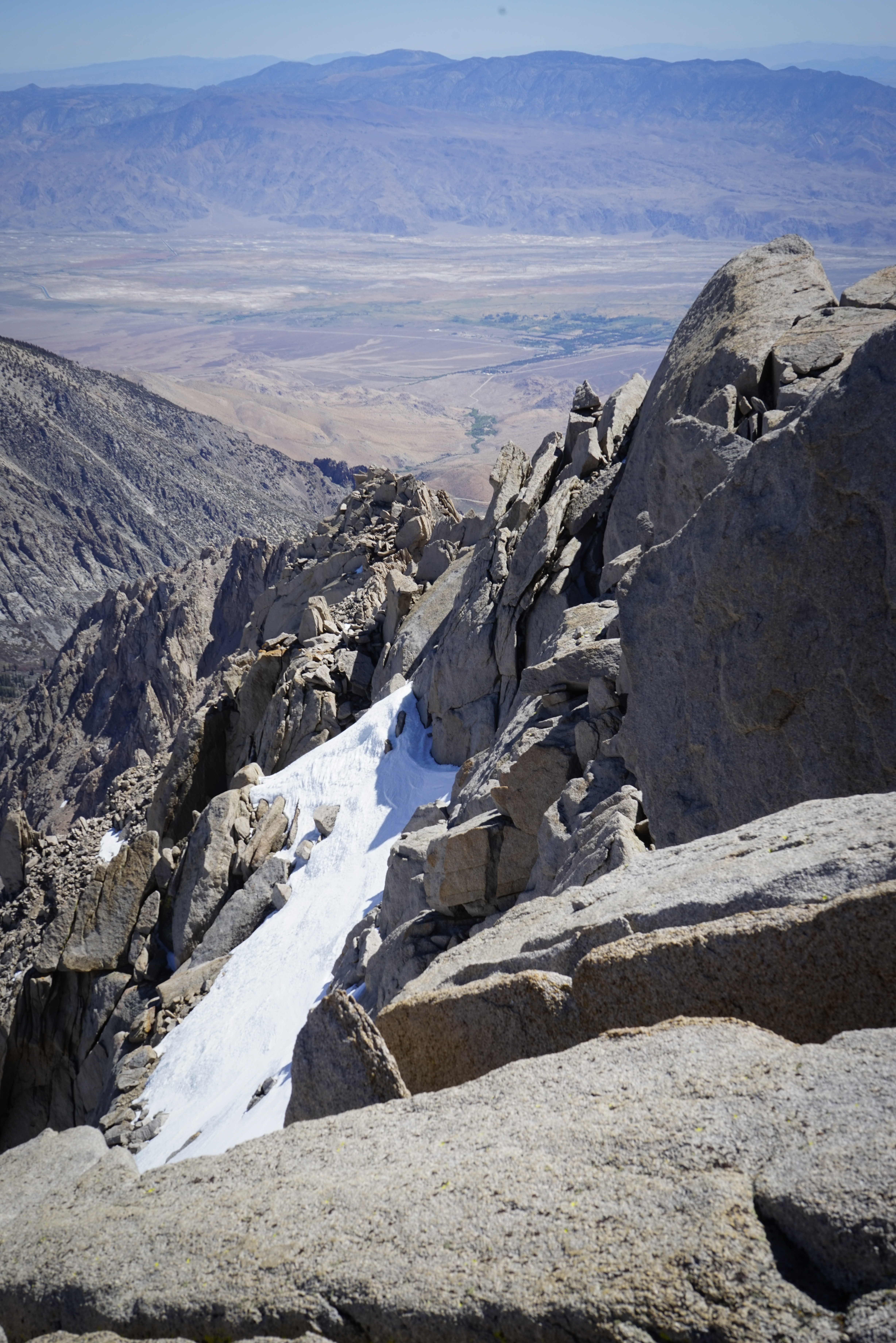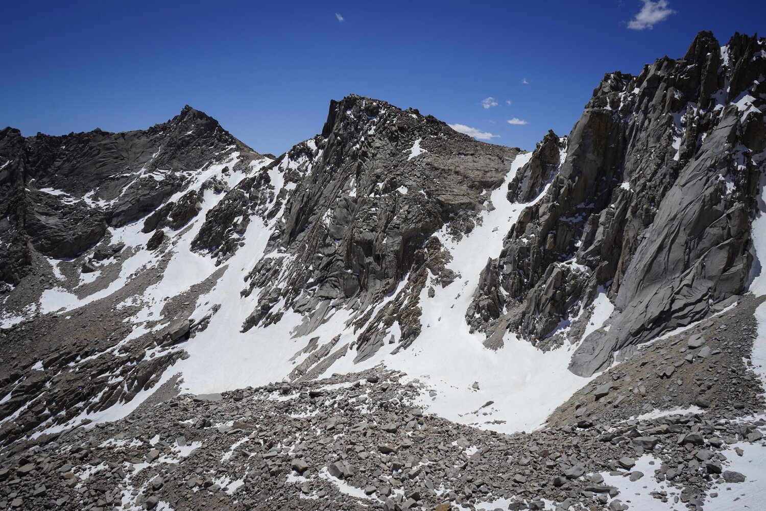 The view of Kearsarge Lakes from near the summit of University Peak. Once I gained the summit ridge, the climbing became much more complicated. There were four small, but invisible from below snowfields that I had to cross to reach the class 3 summit scramble. This was complicated by the fact that this little catwalk is at the top of cliffs that drop off the north face for a hundred or so feet.