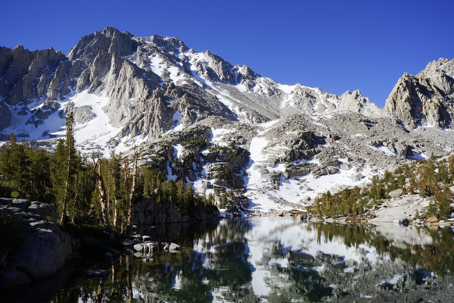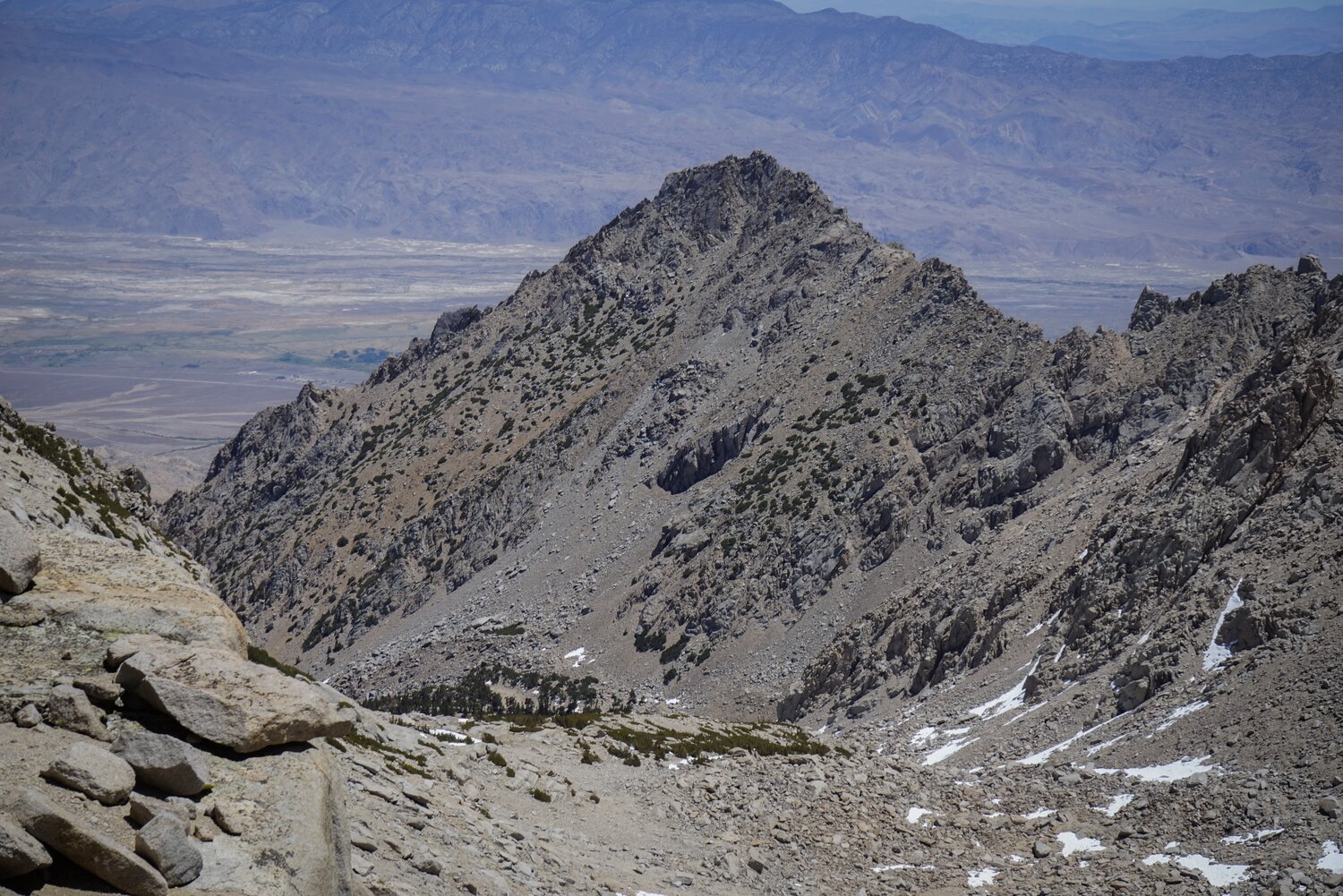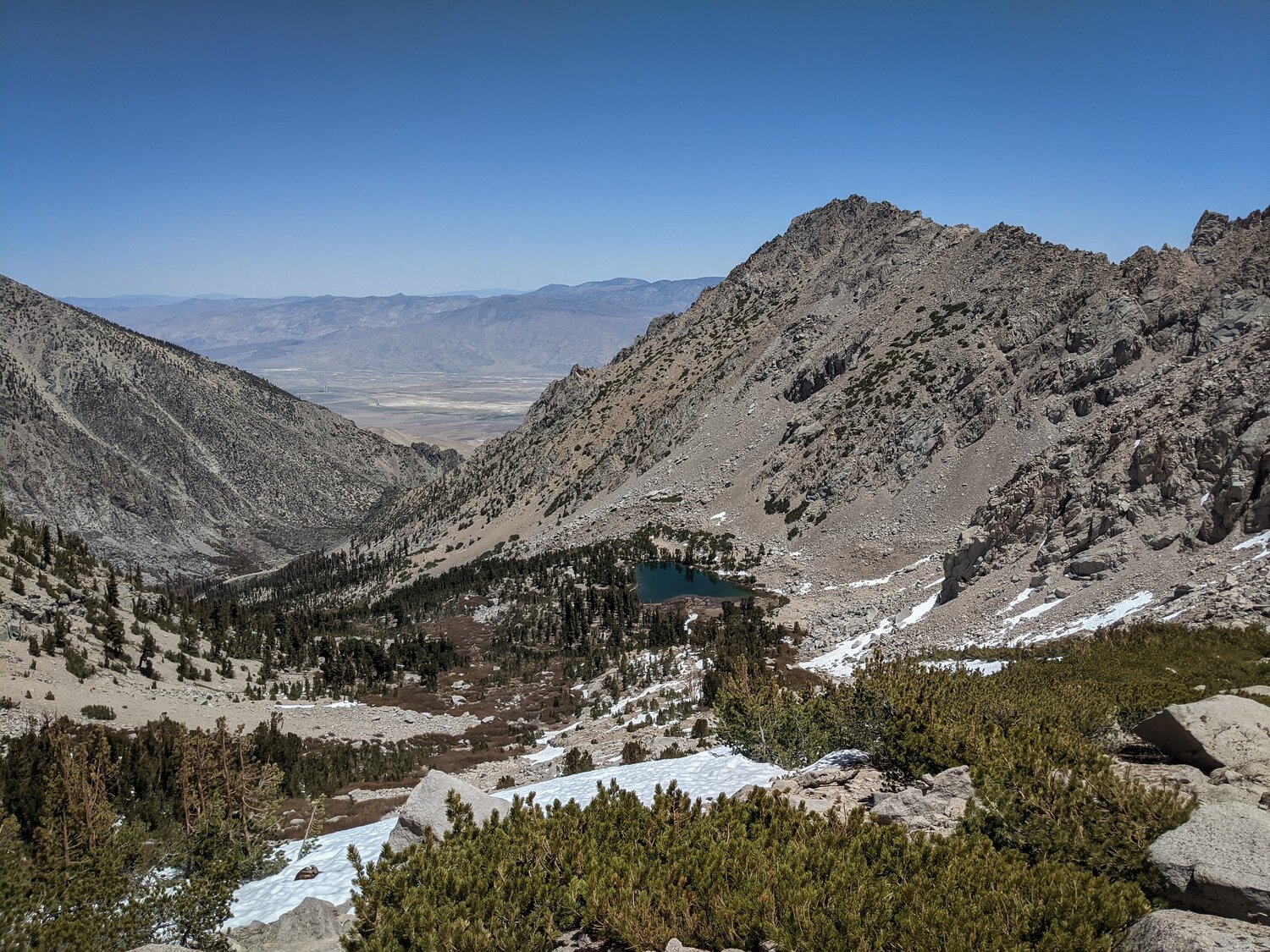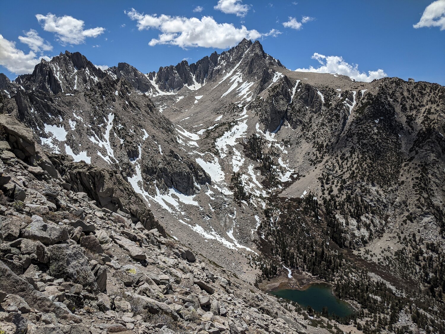 University Peak from the West Face. It was straightforward to get back down to the trail, where I rested again. The trail to Robinson Lake climbs much more steeply than the one to Kearsarge Pass, which wasn’t too welcome on my tired legs, but at least it was a trail. It also never gets near enough to the creek for an inviting foot-soak rest, so I just made my way down, through the campground, and back to the car.