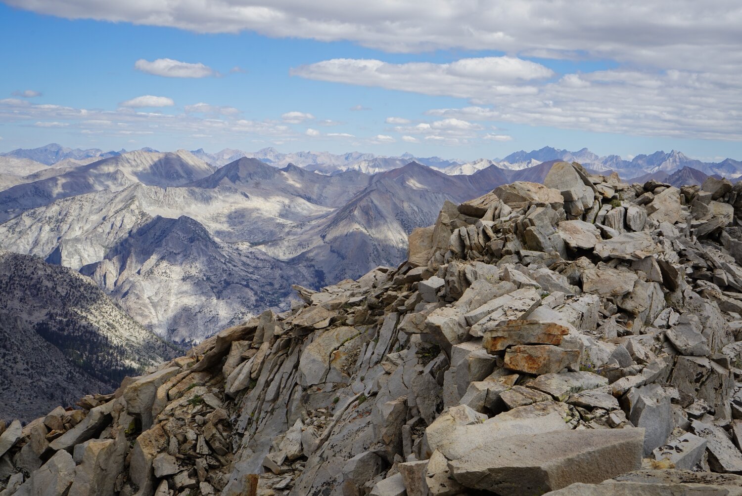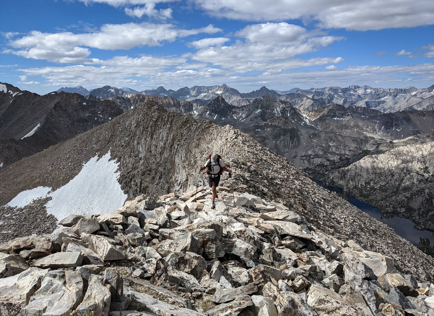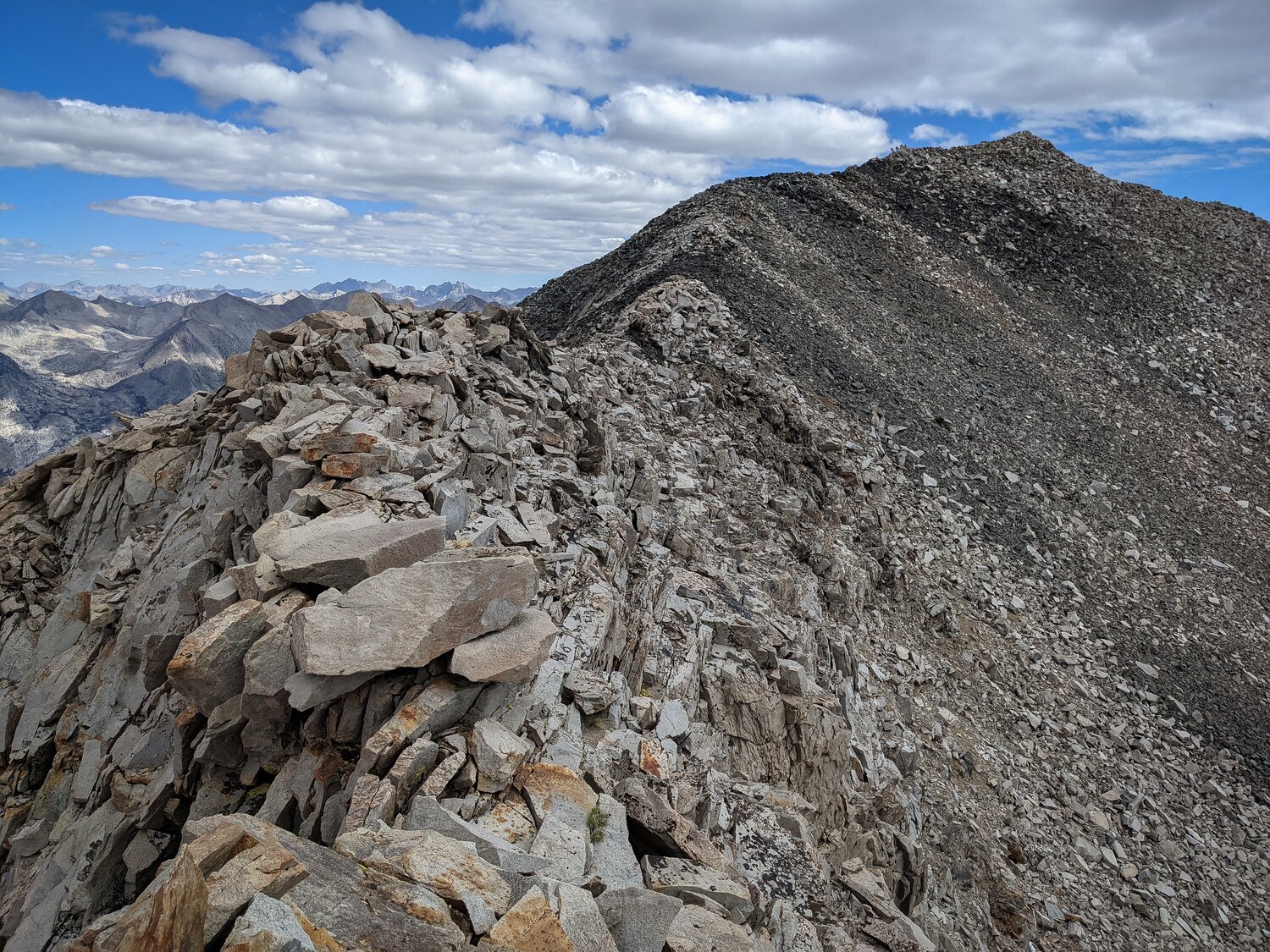 After much struggling, we reached the Sierra Crest by way of some class 3 blocks. Here there was a beautiful sidewalk of talus stretching about a quarter mile to the summit.