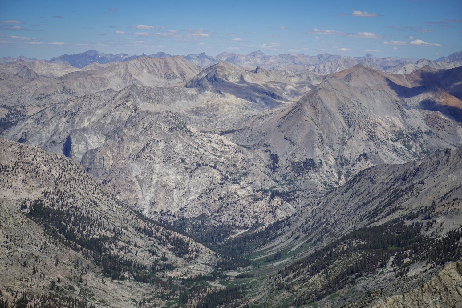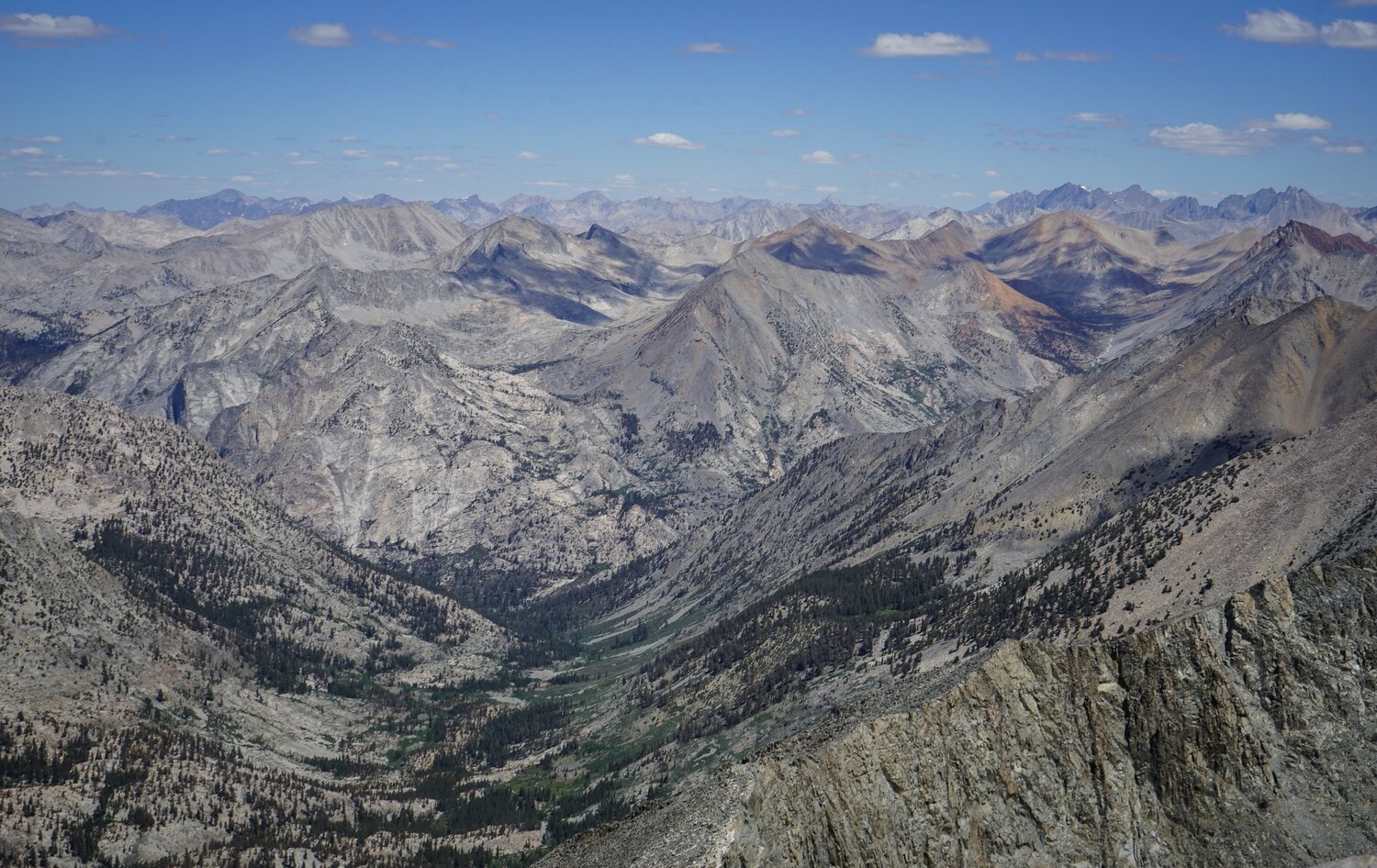 Looking north down the U-shaped valley of the South Fork of Woods Creek with the central High Sierra behind.