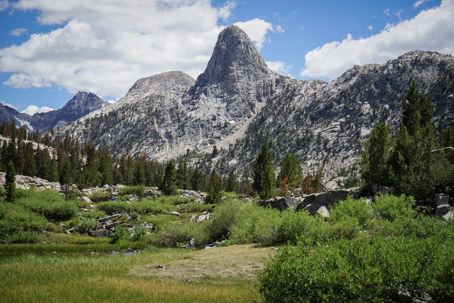 We passed a bunch of hikers going in each direction on the JMT / PCT. We also passed a ranger at Arrowhead Lake who warned of severe thunderstorms to come the next day and for a couple of days after. That wouldn’t be a problem for us as our trip would be over, but some other hikers we saw had to consider their plans a bit more carefully with this information.