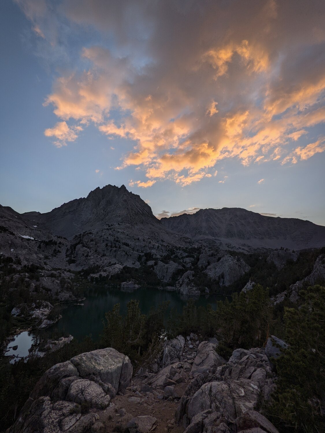 As we hiked higher, the clouds overhead got a bit darker and threatened. We found Third Lake also a bit crowded for our taste, and the views not quite as good, so we continued up to Fifth Lake, reaching a good campsite around 3:30. We lazily set up our camp and snacked on some food, feeling the altitude a little bit.