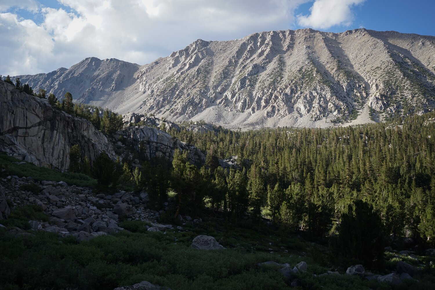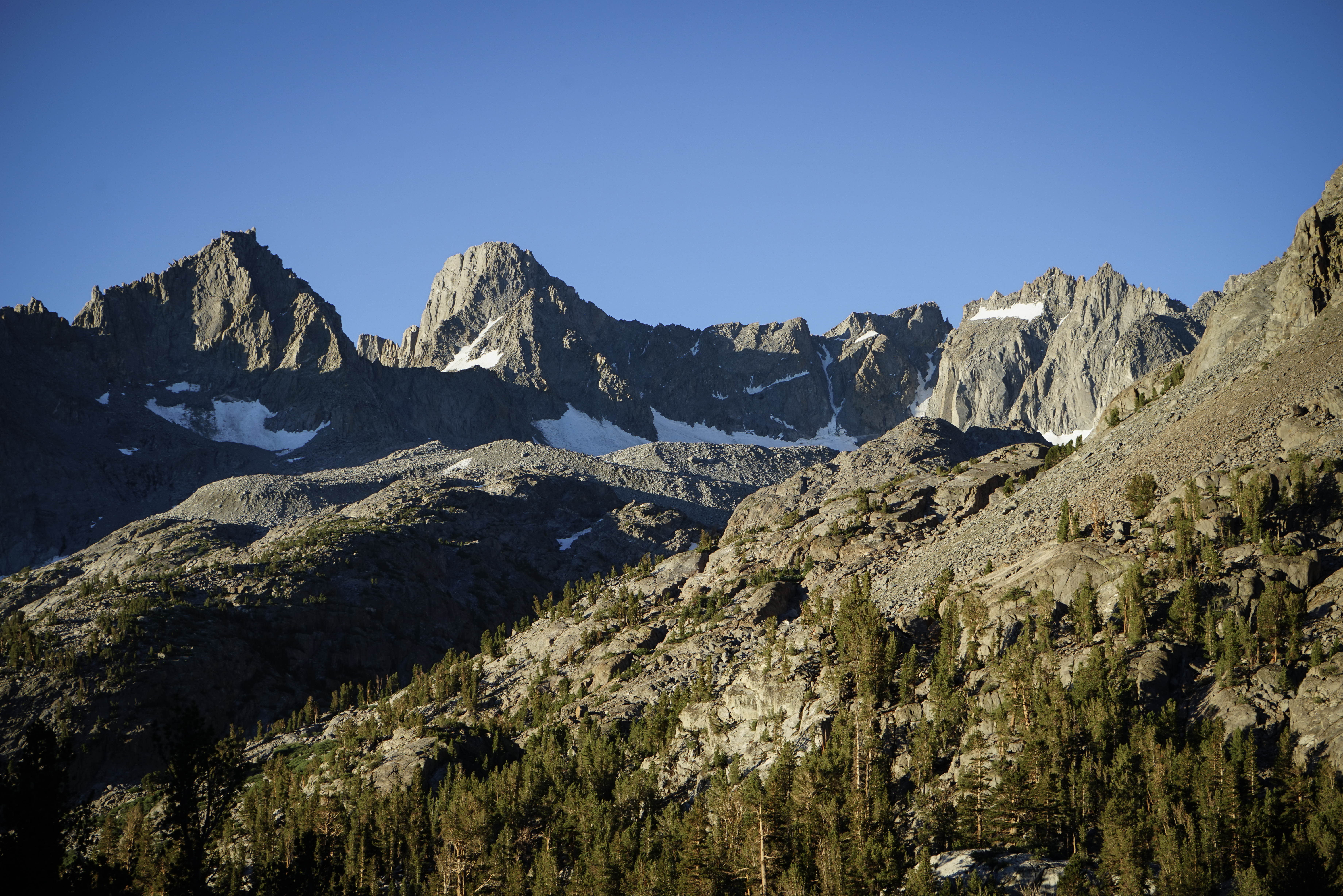 First views of the North Palisade massif from above Sam Mack Meadow.