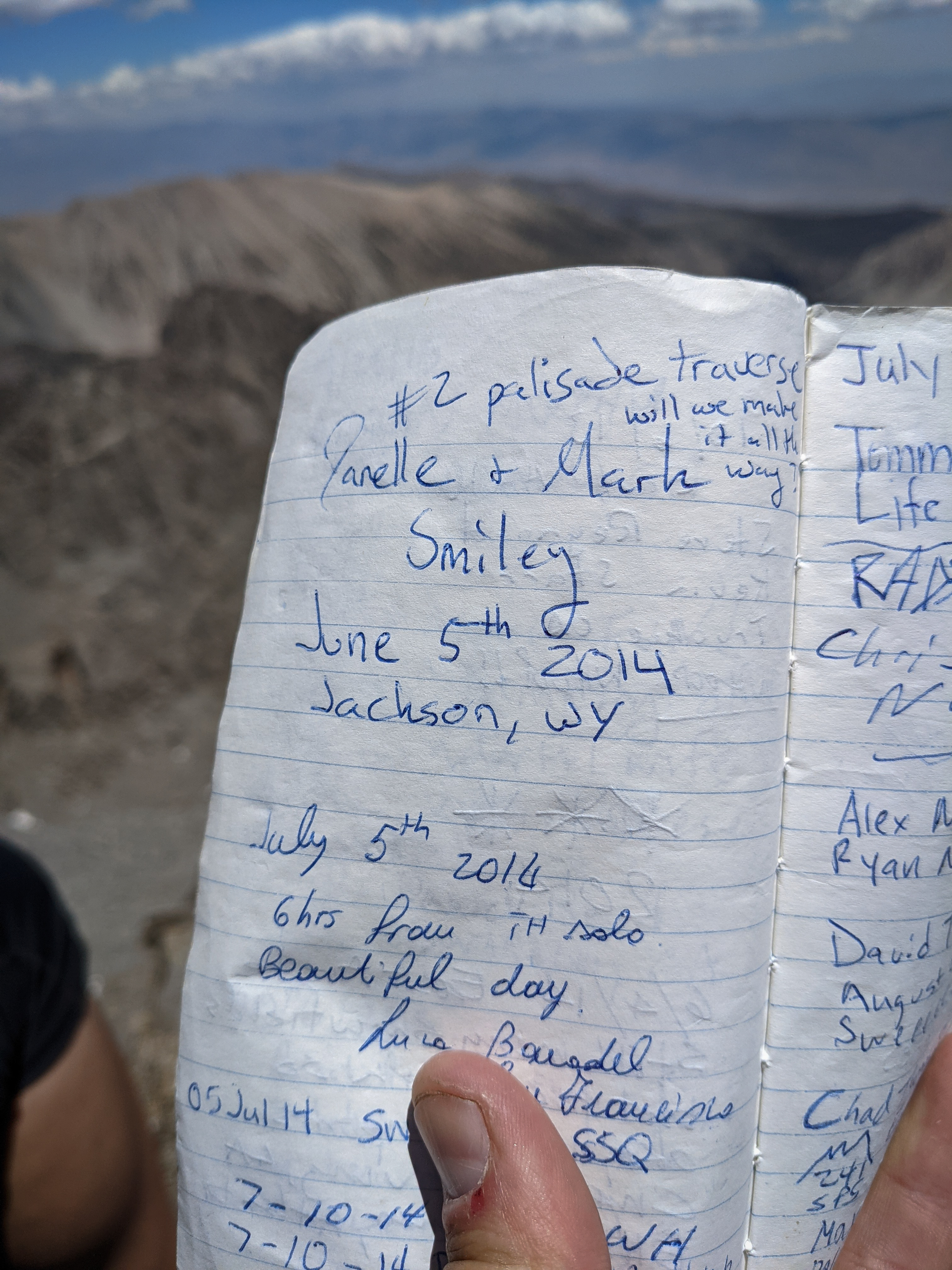 The summit register was not too busy. There were several entries from parties doing a traverse of the Palisades, including the Smileys. After an extended break enjoying the lovely summit, we headed back down.