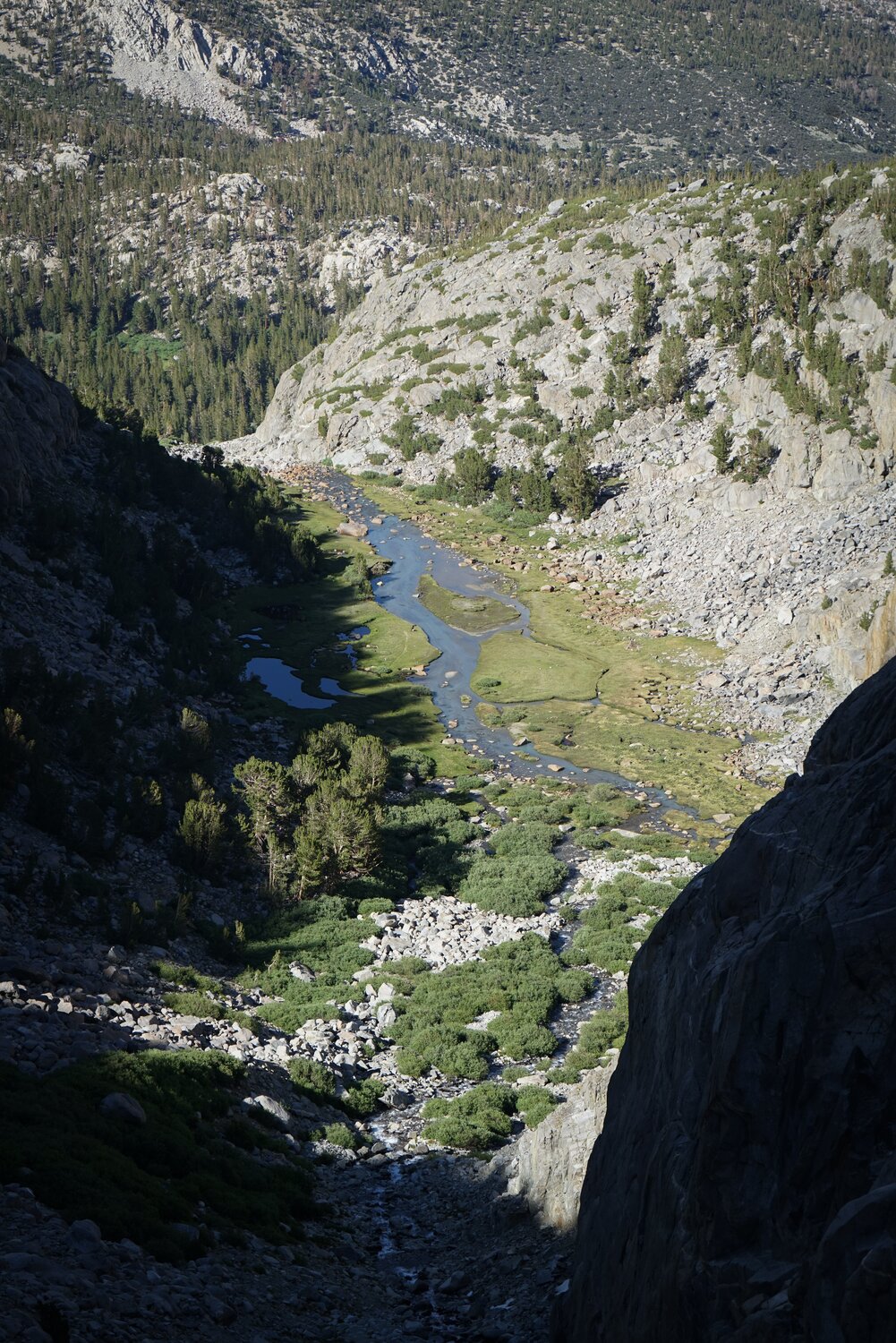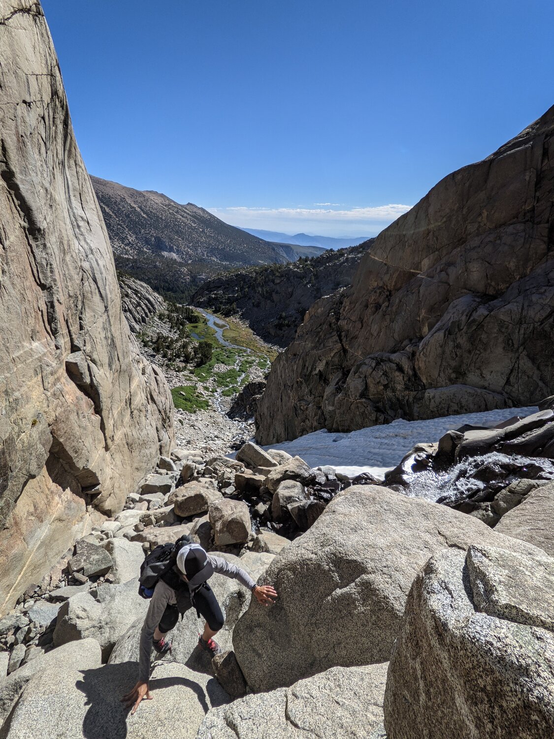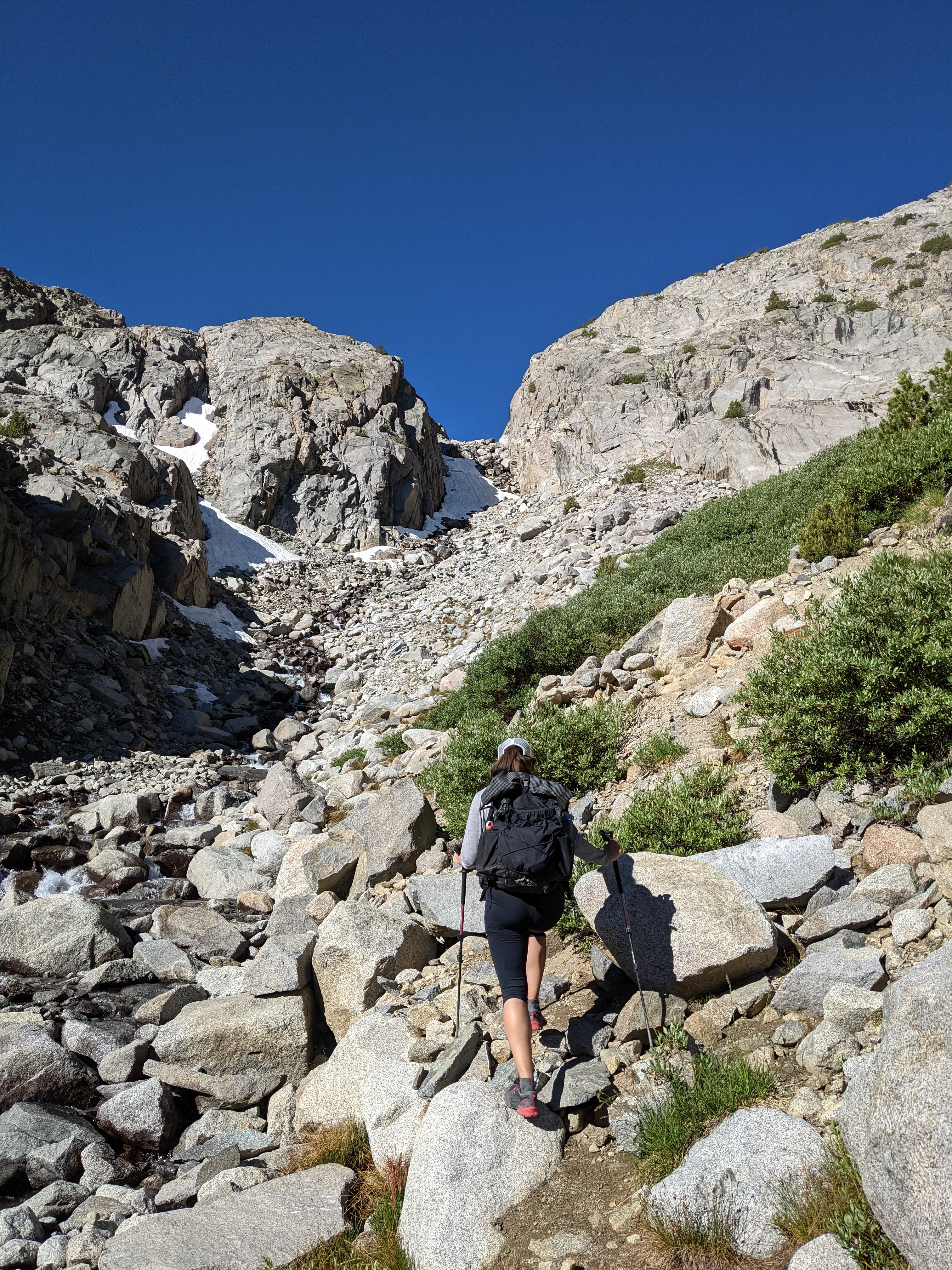 In Sam Mack Meadow, the trail crosses the creek and heads up into talus towards the much more popular Mount Sill and North Palisade. We followed the creek and climbed a talus-filled gully at the southwest end of the meadow towards the small lake just south of Sam Mack Lake.