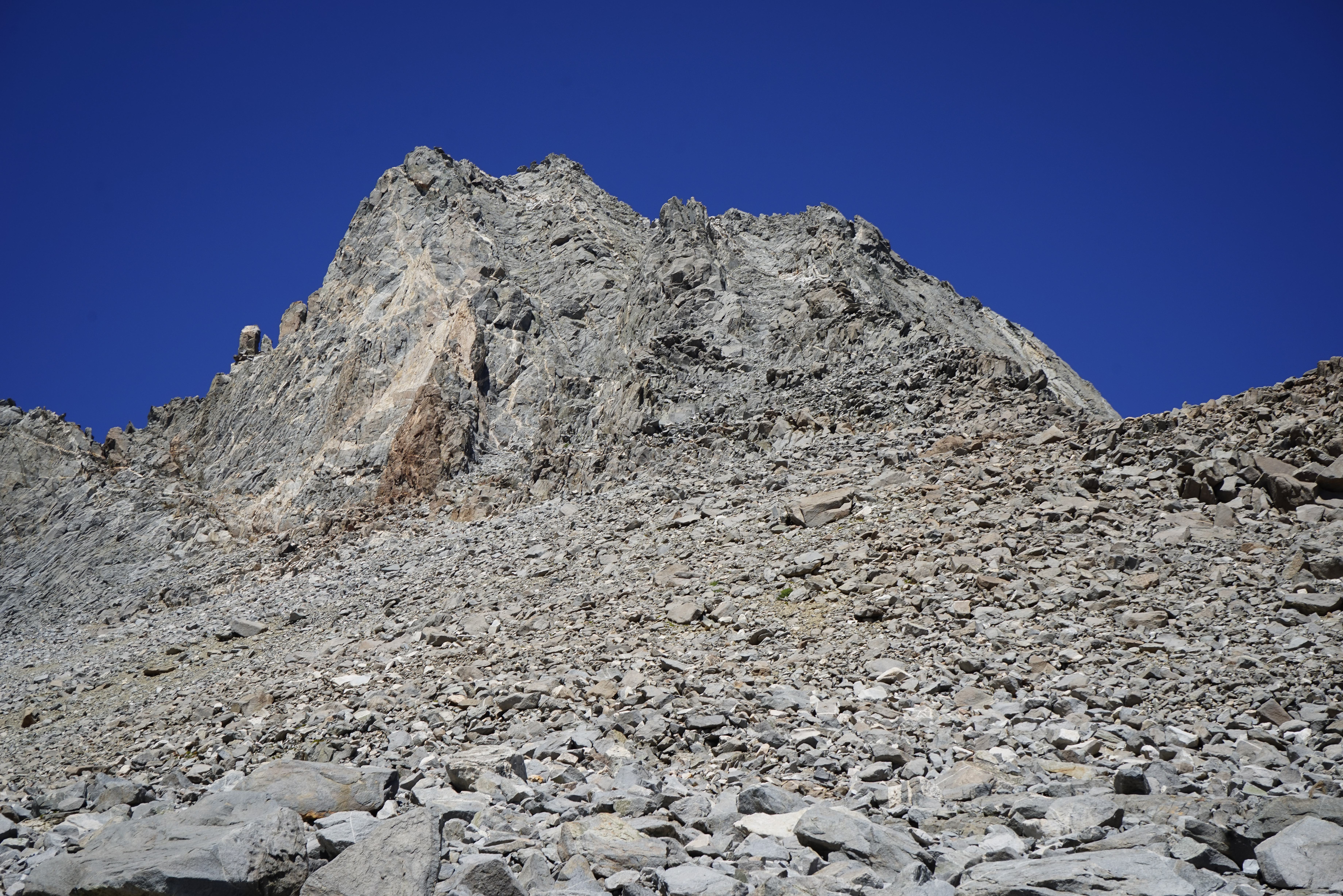 It was almost 11 by the time we reached the base of the correct route, which we confirmed because we saw the other hiker coming down. Between the altitude and the vast sea of large talus, we were not moving particularly fast today. Fortunately, the weather was holding.