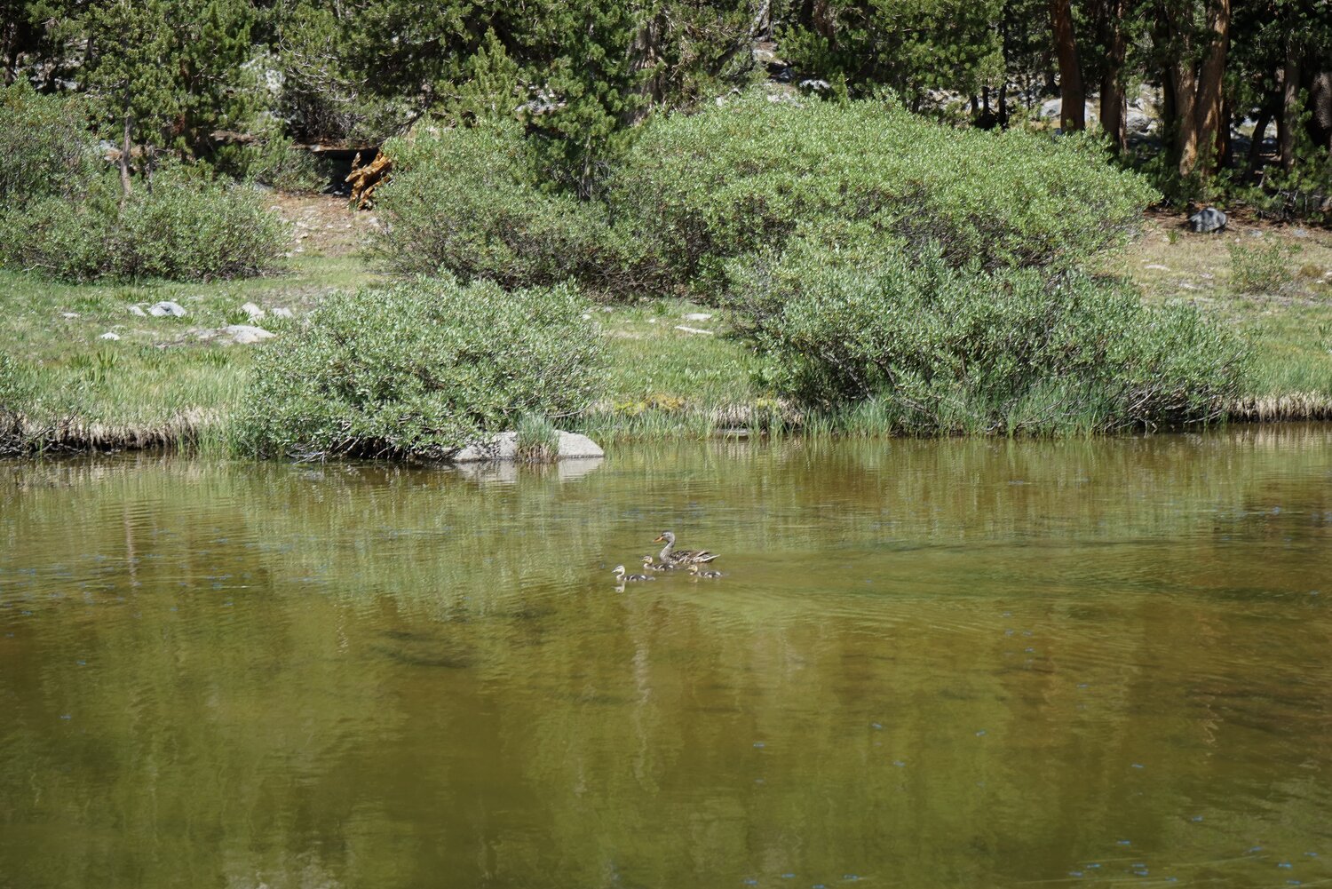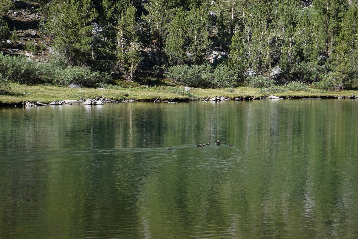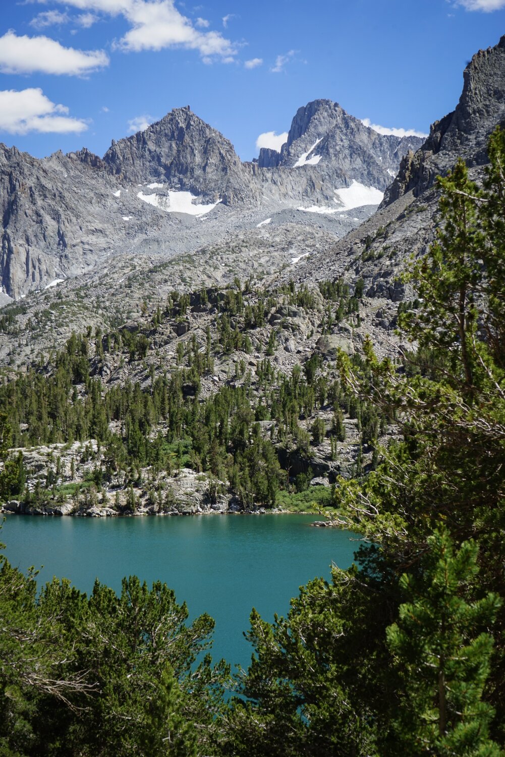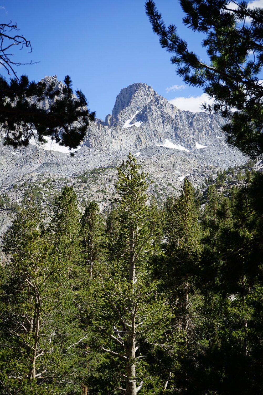 Mount Sill and Mount Gayley through the trees above Fifth Lake. Once at Fifth Lake again we had to cross a small talus field to rejoin the trail, where we headed down and stopped to refill water and have a rest at the lakeshore.