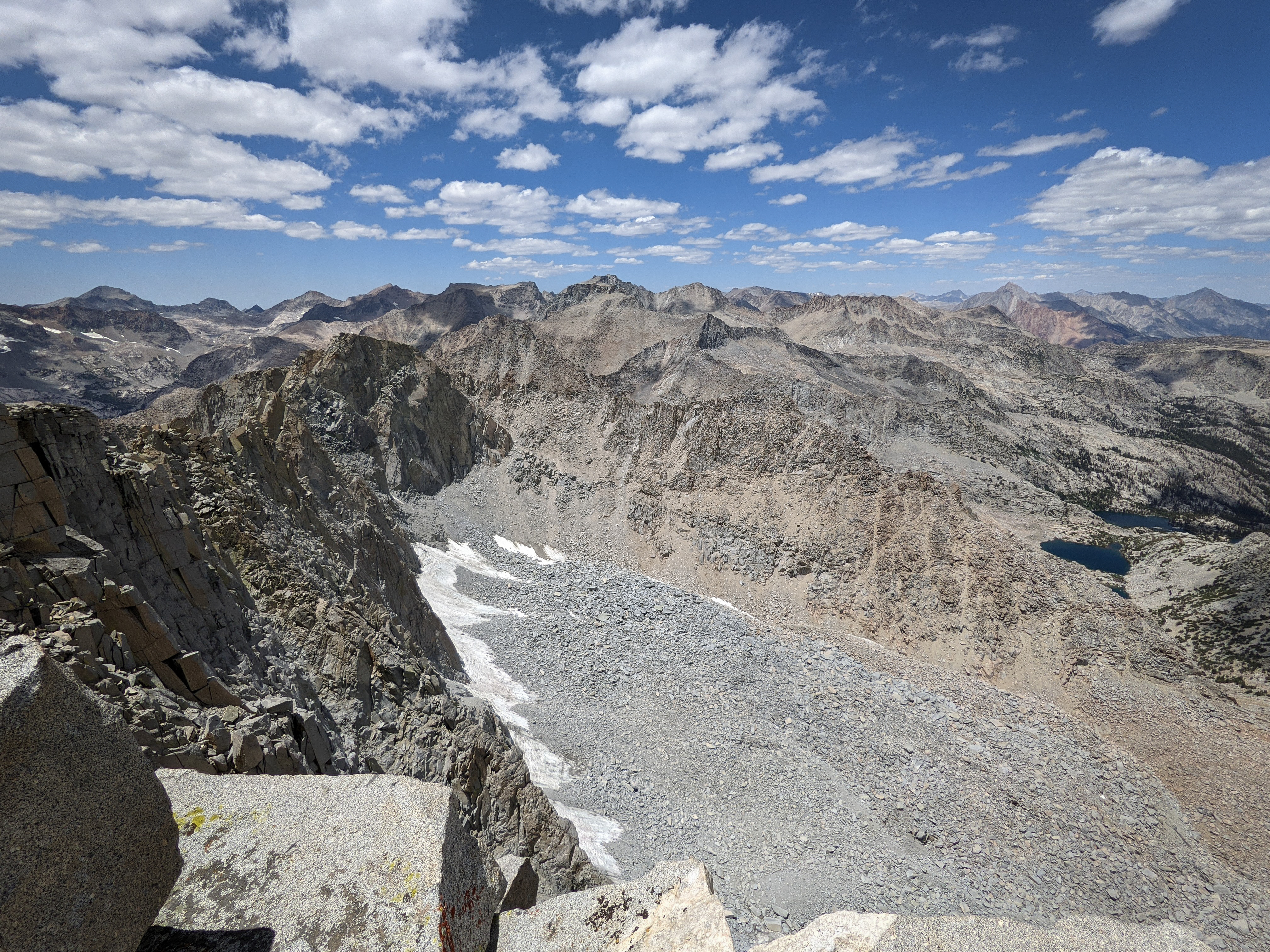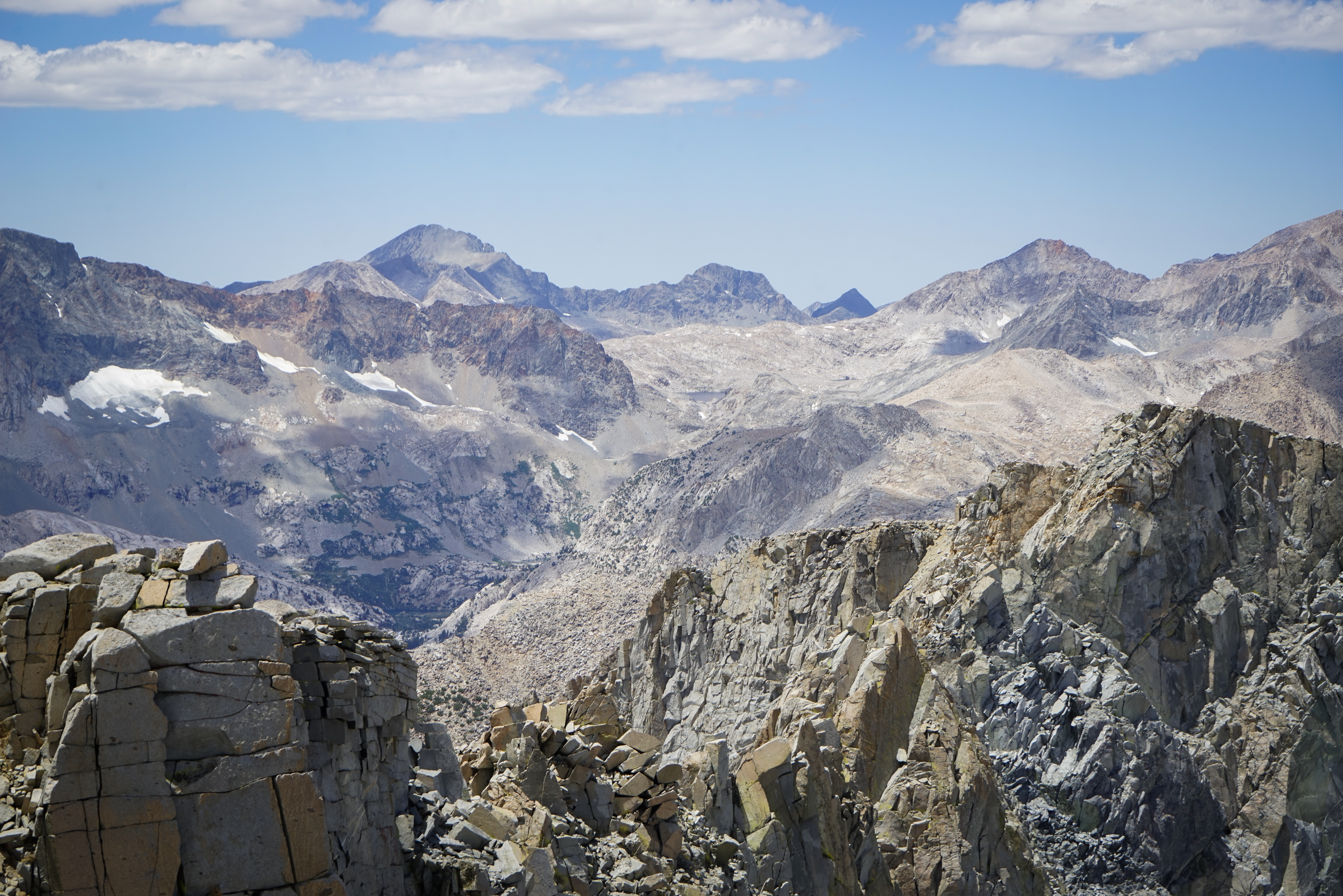 The view south. Mount Williamson and Mount Whitney are visible at left, as is much of the Kings Kern Divide and the Kaweahs at right. The peak in the middle-right is Giraud Peak which is above and southwest of the Dusy Basin.