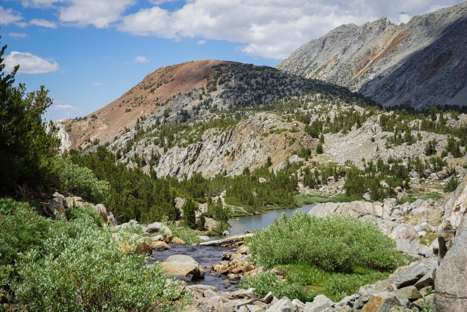 Mount Agassiz above Bishop Lake and Bishop Pass. Some clouds came in, but nothing too concerning. I took a slightly different route down, dropping lower to Saddlerock Lake and stopping to soak my feet for a bit before rejoining the trail.