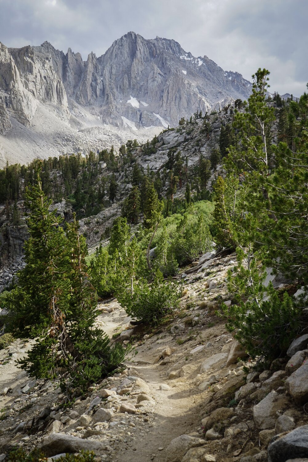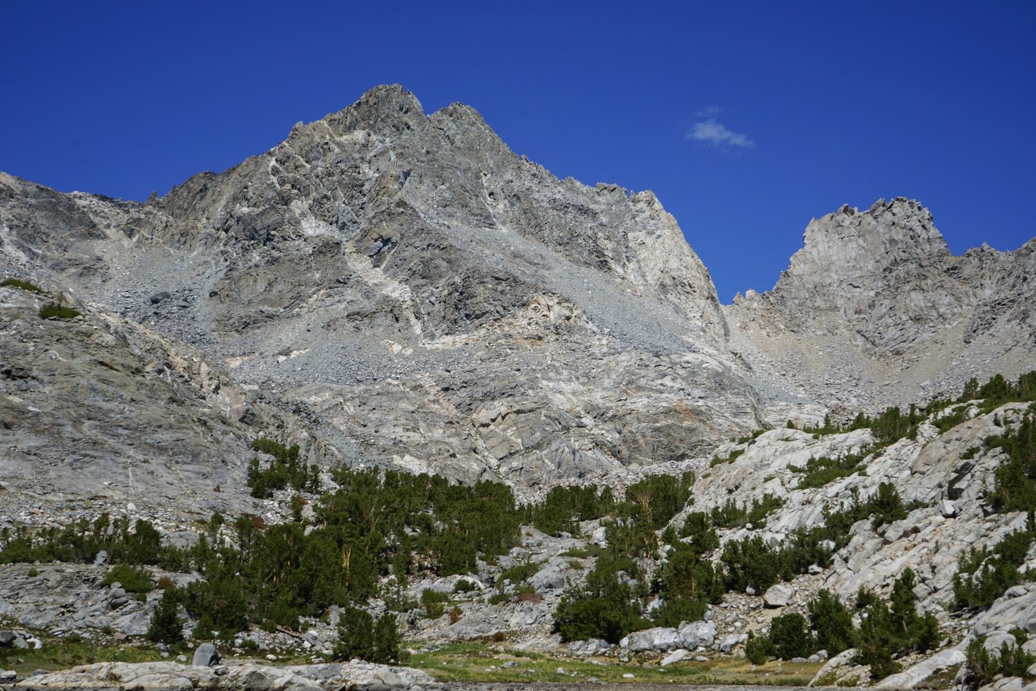 University Peak from somewhere along the Golden Trout Lakes Trail. Almost immediately after leaving the Kearsarge Pass Trail, the trail became much harder to follow. It was overgrown and disappeared under talus now and then. I wasn’t surprised, as this trail dead-ended at a collection of lakes, whereas the other branch was one of the trails most commonly used to access the vast Sequoia-Kings Canyon Wilderness.