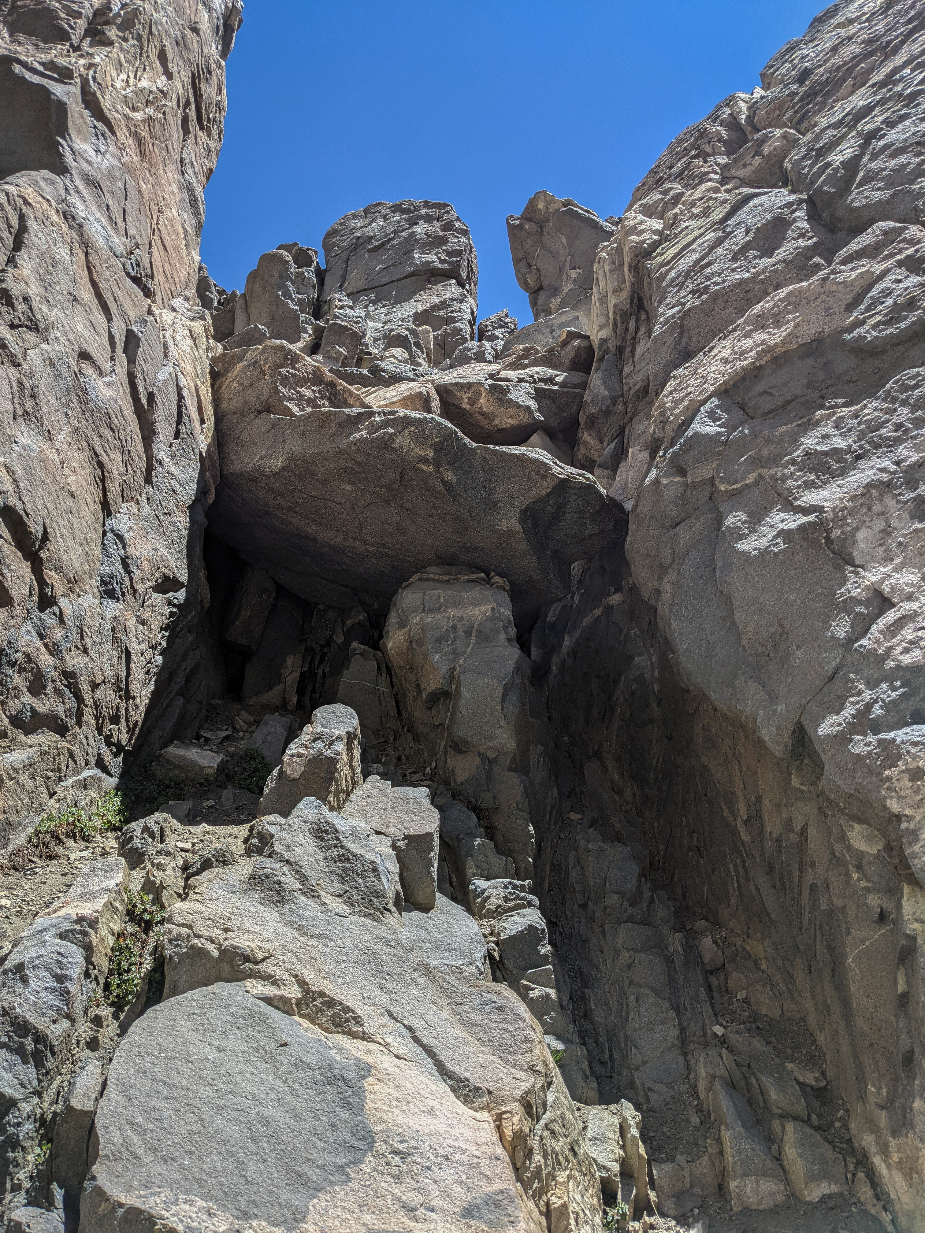 Here’s the awkward class 3 boulder at the top of the chute. I found it about as awkward as advertised but managed to surmount it without incident with a beach-whale mantle move up the right side.