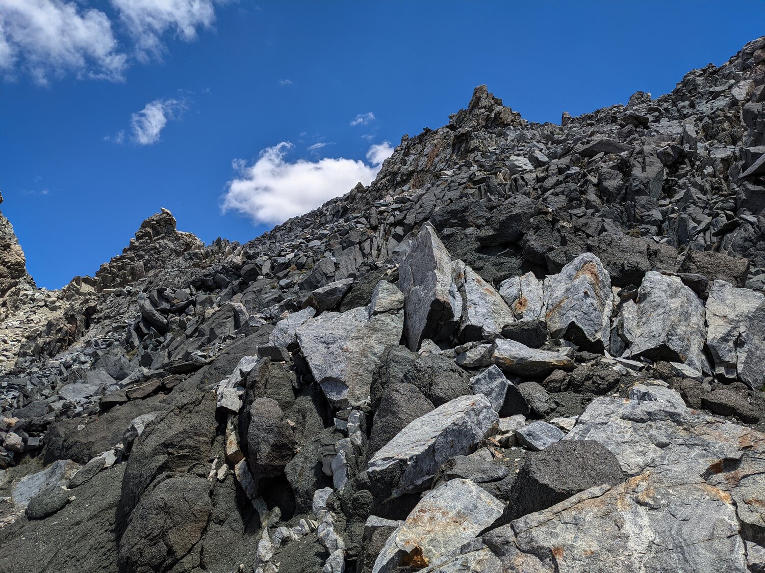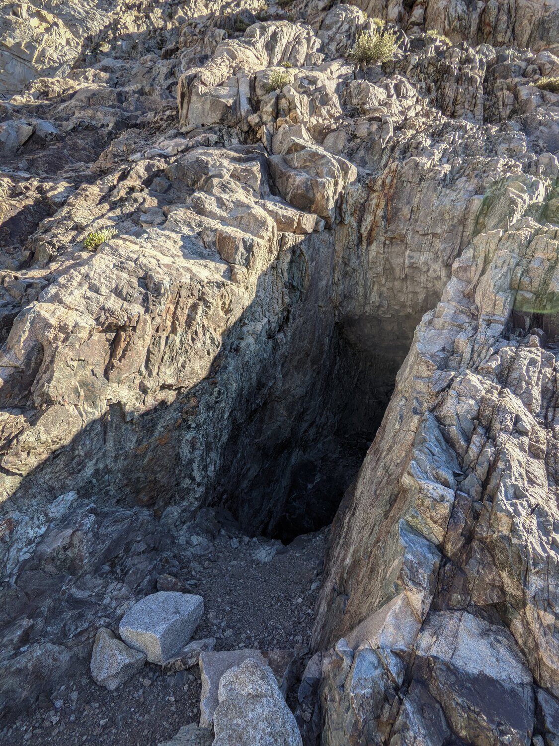 After losing the trail in some talus and wandering for a while I came across this old mineshaft. It was about 10 or 15 feet deep in some cliffs along the south face of the peak. After taking a few photos I headed back across the talus field to try and find the trail. Above here the trail continued to fade now and then, but I was able to mostly follow it until reaching the base of the talus slope below Lilley Pass where I set off through the sand and talus for the pass.
