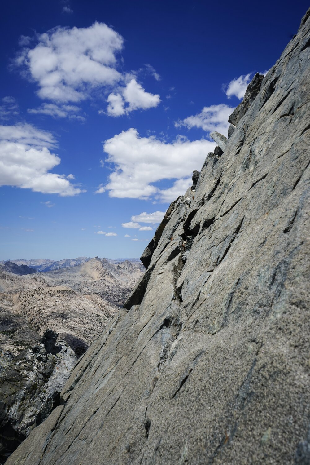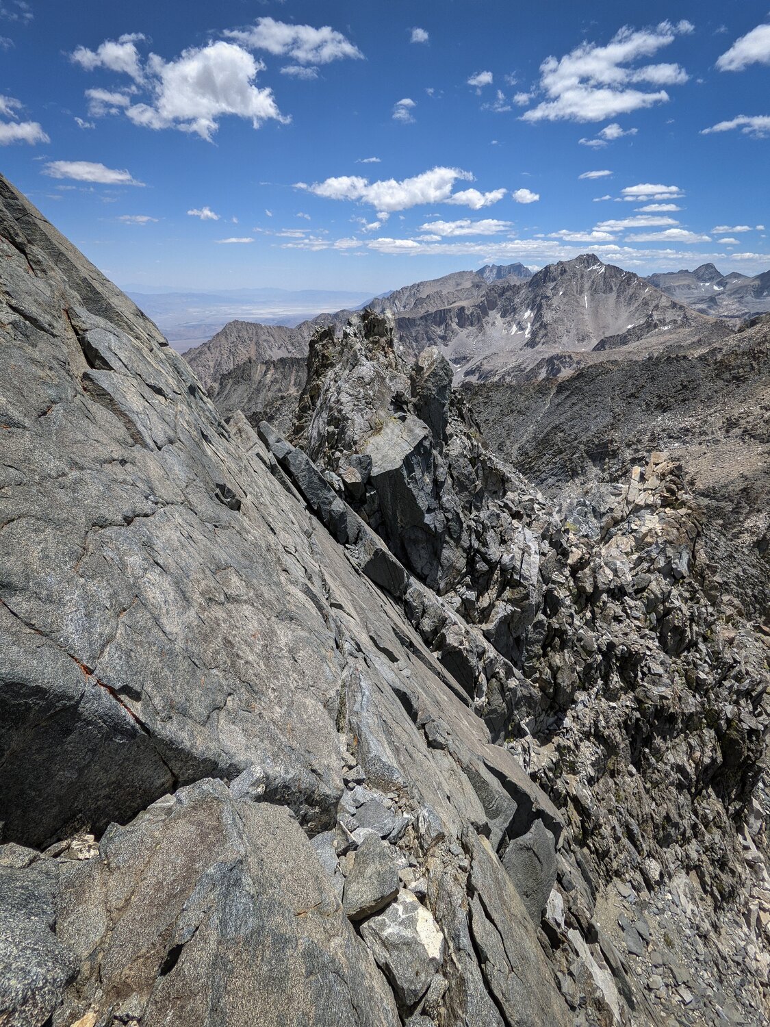 I sat and enjoyed the summit view for a few minutes. The view was particularly nice to the northwest over the Rae Lakes and Mount Clarence King. I also thumbed through the summit register, which contained a lot of nice dragon-themed content. But I was still a bit worried about reversing the crack section. Sometimes those things can be more difficult to get down than up. So after a few minutes I climbed back down to start off towards Mount Gould.