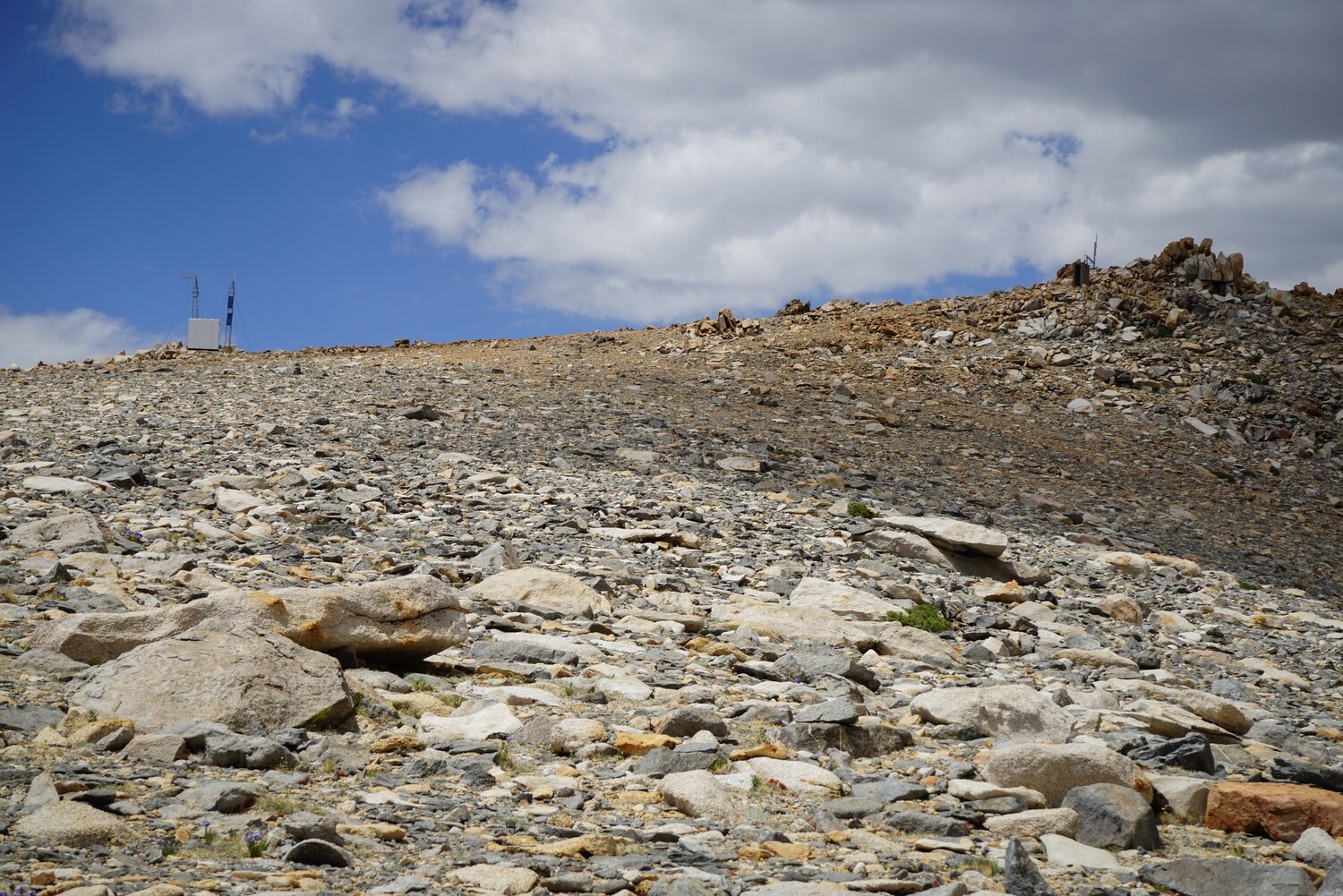 There are a couple of structures on the small peak just north of Mount Gould. I think they’re radio repeaters for the backcountry ranger at Rae Lakes. If you look very carefully from the main campsite at Middle Rae Lake, you can pick them out.