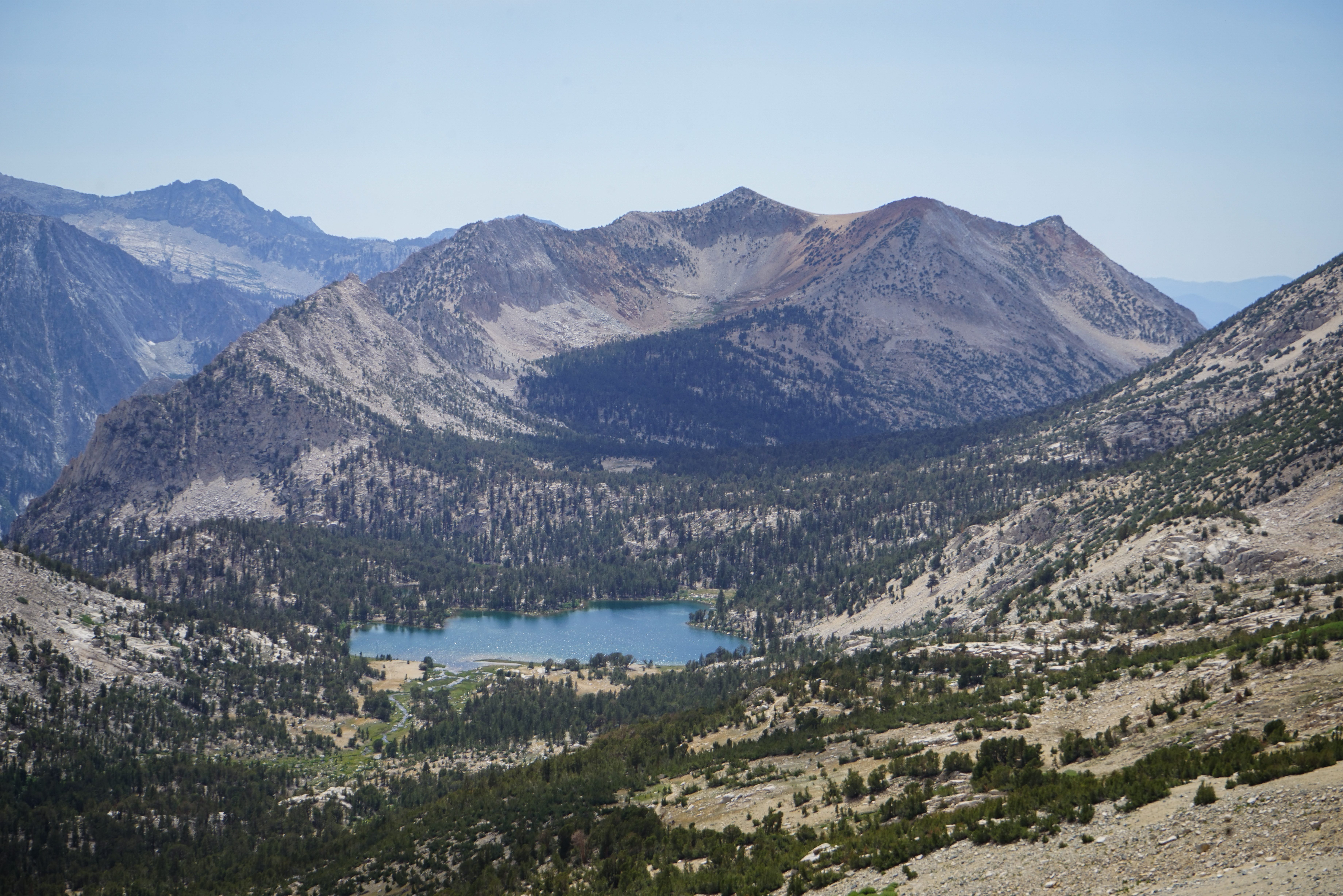 The Kearsarge Lakes and Pinnacles again from lower down. I descended a sandy chute that headed just west of Kearsarge Pass. It was a bit loose in places, but not terrible.