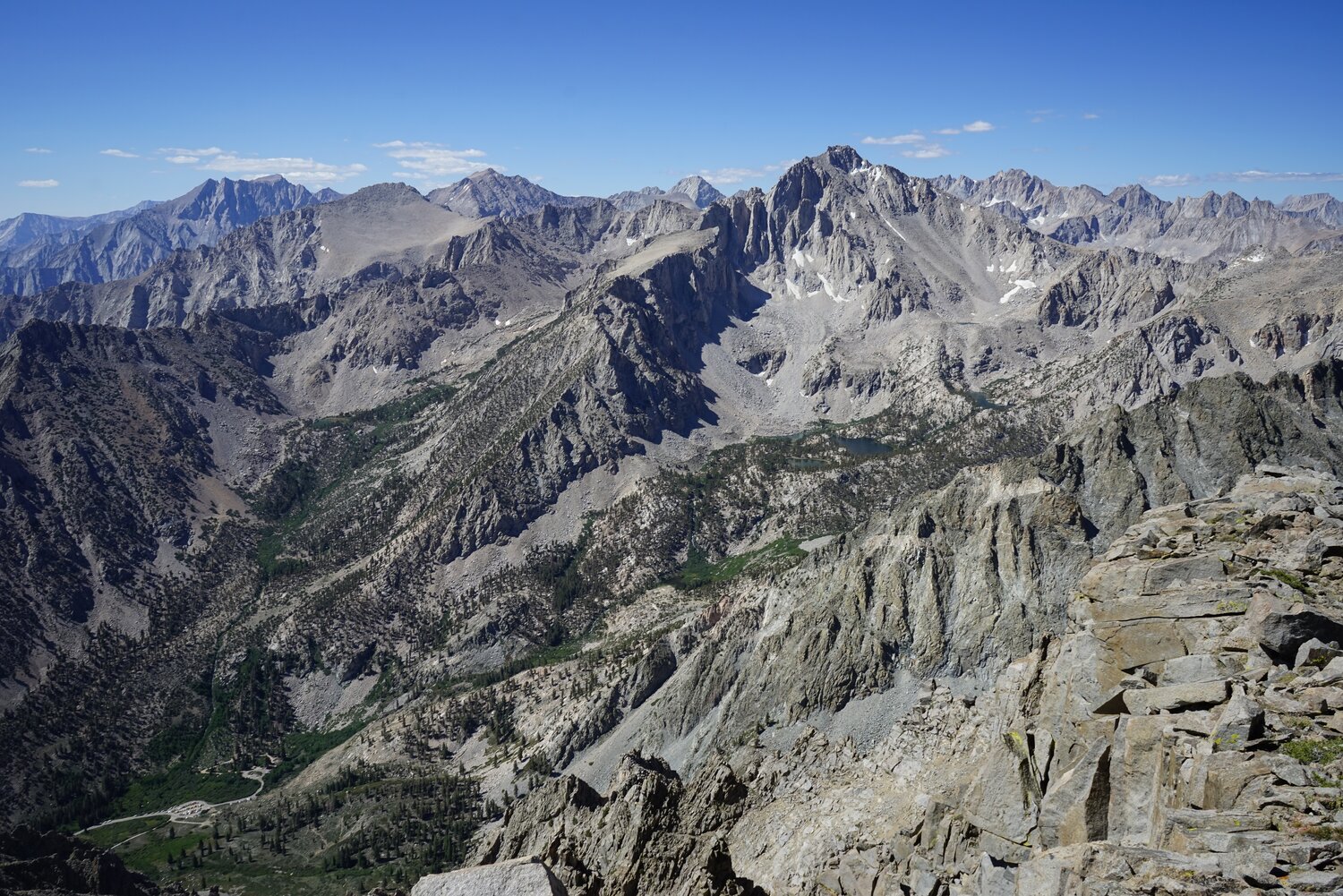 Looking southwest over the Kearsarge Pinnacles, the Videttes, and the Great Western Divide.