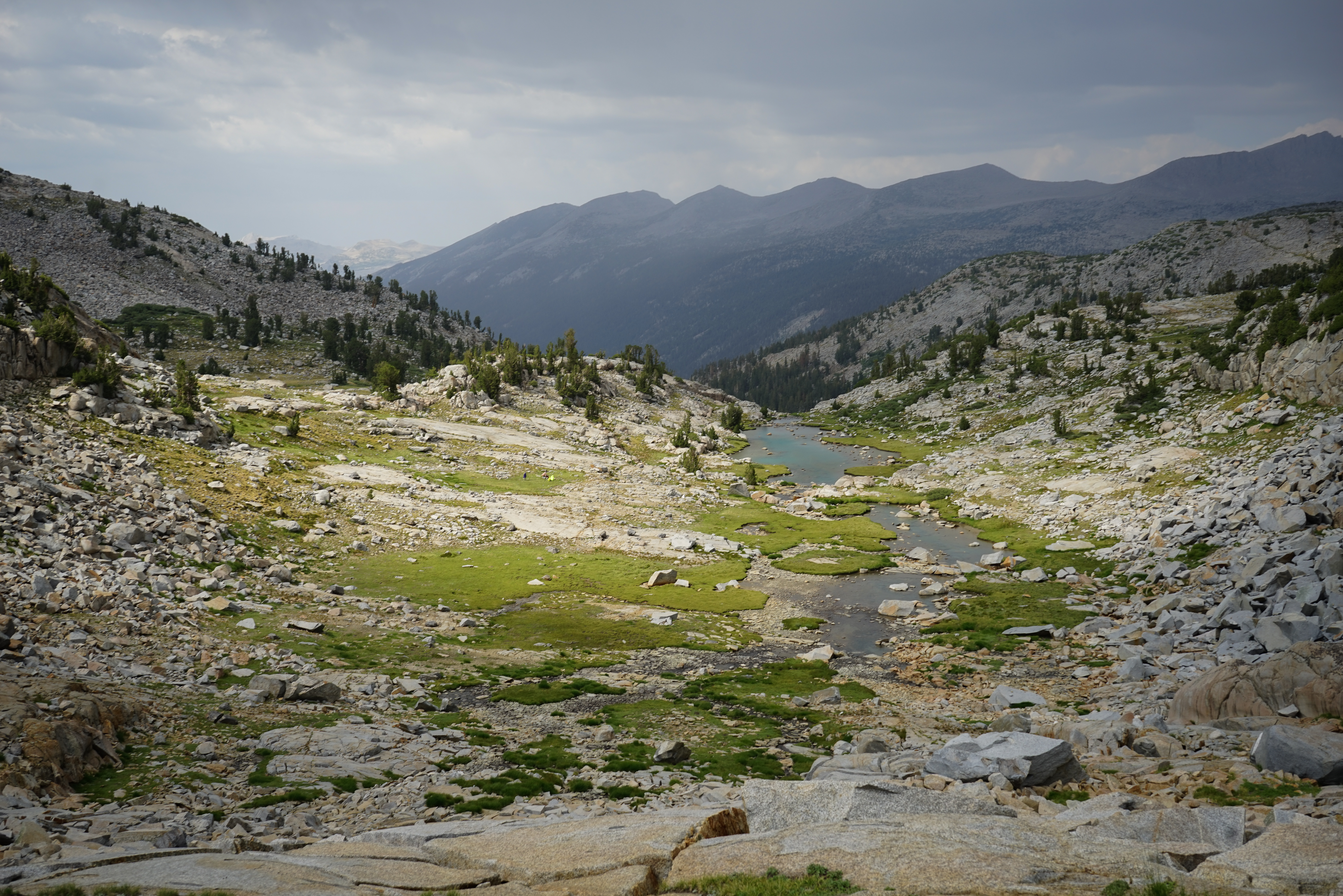 Looking back over the creek under threatening skies. At this point it very much seemed like we weren’t going to have the weather or daylight to climb any mountains today. When we reached the small valley just above the John Muir Trail here, a thunderstorm broke out, forcing us to pitch the tent and crawl inside to wait it out. While we had hoped to make it a bit farther up today, that didn’t seem to be in the cards. We waited out the rain, which abated after about an hour, and then got out and selected a more reasonable campsite then the one we had hurriedly chosen.