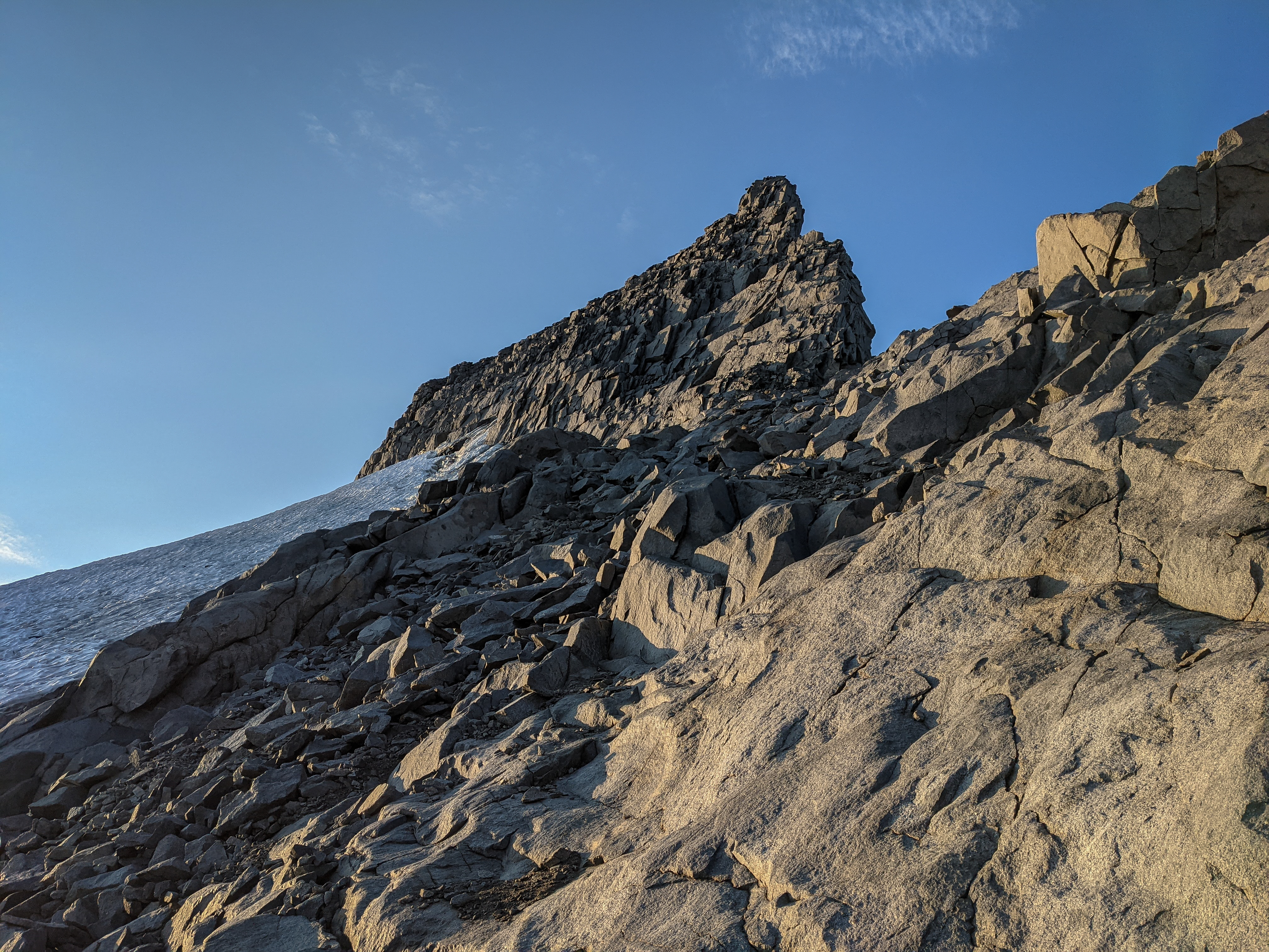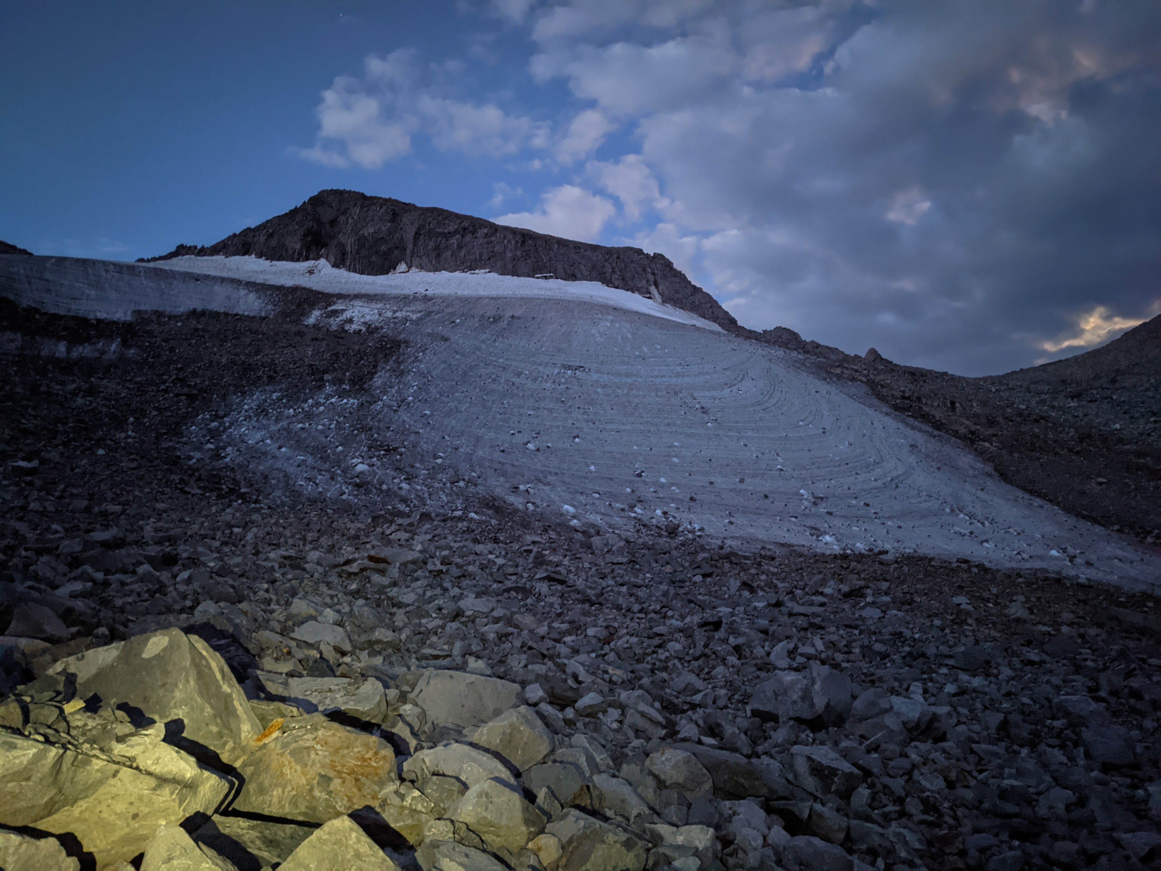 The routefinding was not easy in the dark. Fortunately it was very easy travel over large slabs and if we just went up we were mostly heading in the right direction. We zigged and zagged up towards the glacier, looking for the easiest routes that we could see in the limited light. Eventually we made it to about 11,800’ where the easy climbing transitioned to talus and we began hopping from rock to rock in the predawn light.