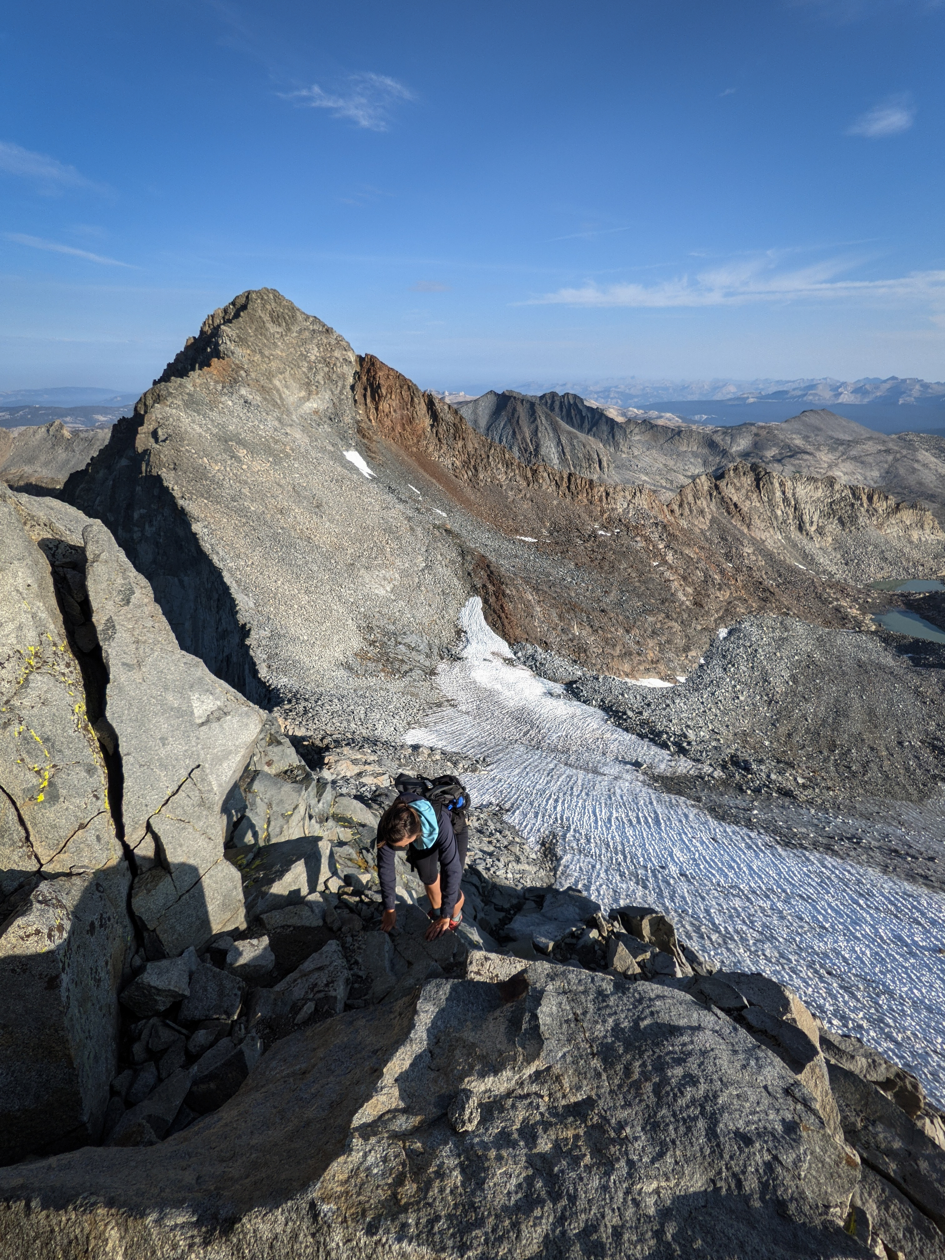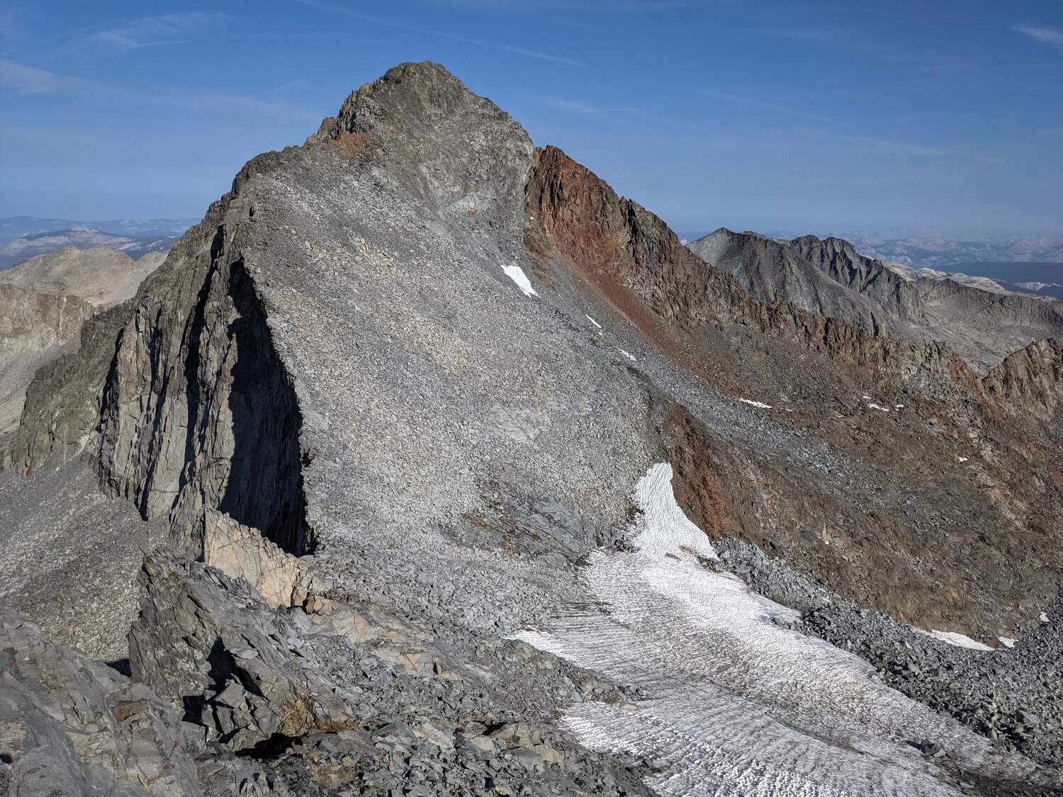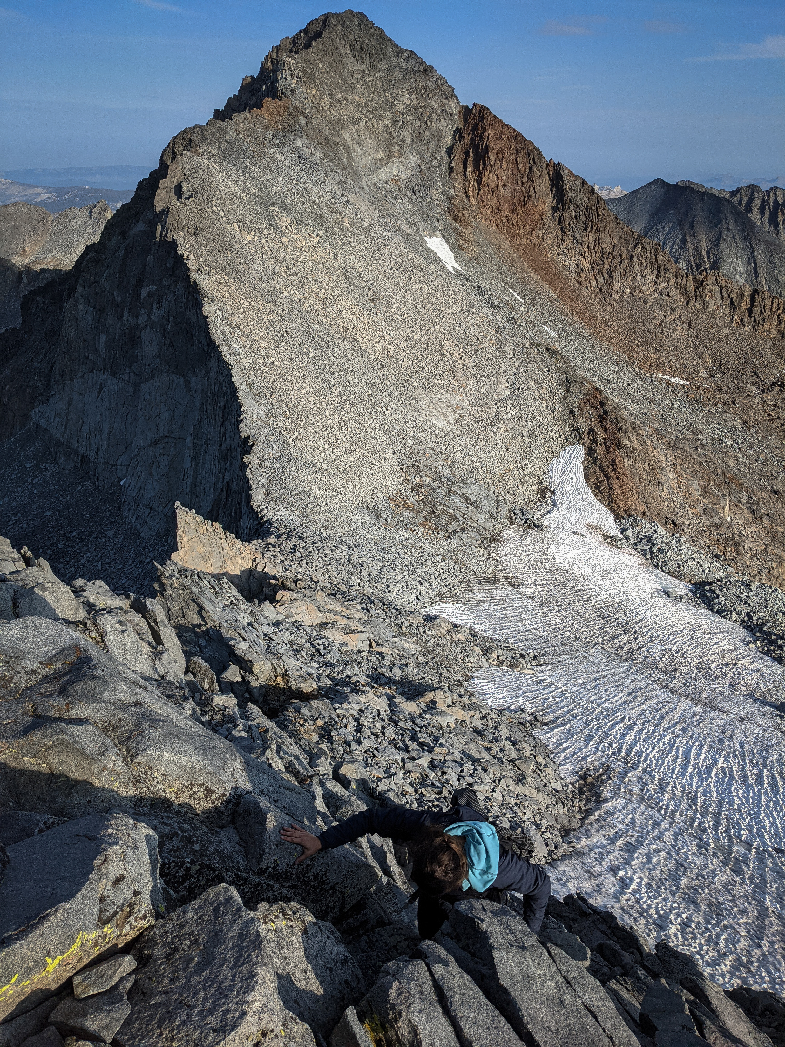In contrast to Mount Lyell, Mount Maclure was made up of a more friable red, black, and white rock that one finds in some parts of the Sierra. It tends to break into small, sharp scree that litters the slopes below. We were very cautious on the trickier parts of this route, testing all of the hand and foot holds before weighting them. While the first portion of the route had been straightforward, there was a 200’ section in the middle where we had to traverse across some broken ledges and cut back to gain the ridgeline towards the summit, which was a little bit more challenging. Fortunately, it was pretty easy to read the terrain.