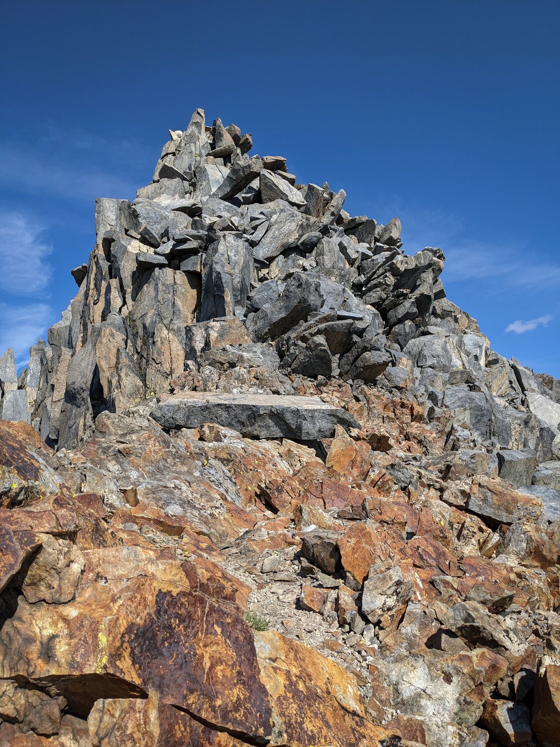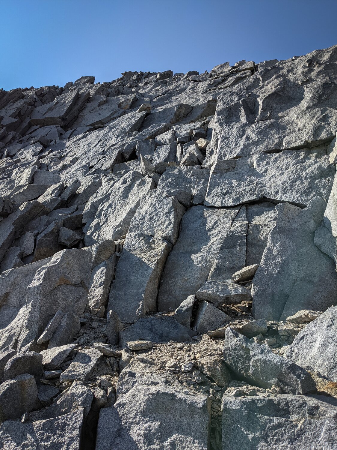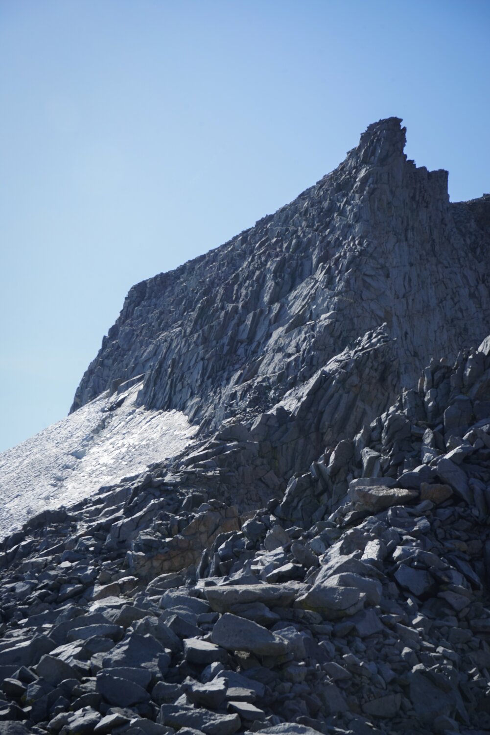 In contrast to Mount Lyell, Mount Maclure was made up of a more friable red, black, and white rock that one finds in some parts of the Sierra. It tends to break into small, sharp scree that litters the slopes below. We were very cautious on the trickier parts of this route, testing all of the hand and foot holds before weighting them. While the first portion of the route had been straightforward, there was a 200’ section in the middle where we had to traverse across some broken ledges and cut back to gain the ridgeline towards the summit, which was a little bit more challenging. Fortunately, it was pretty easy to read the terrain.