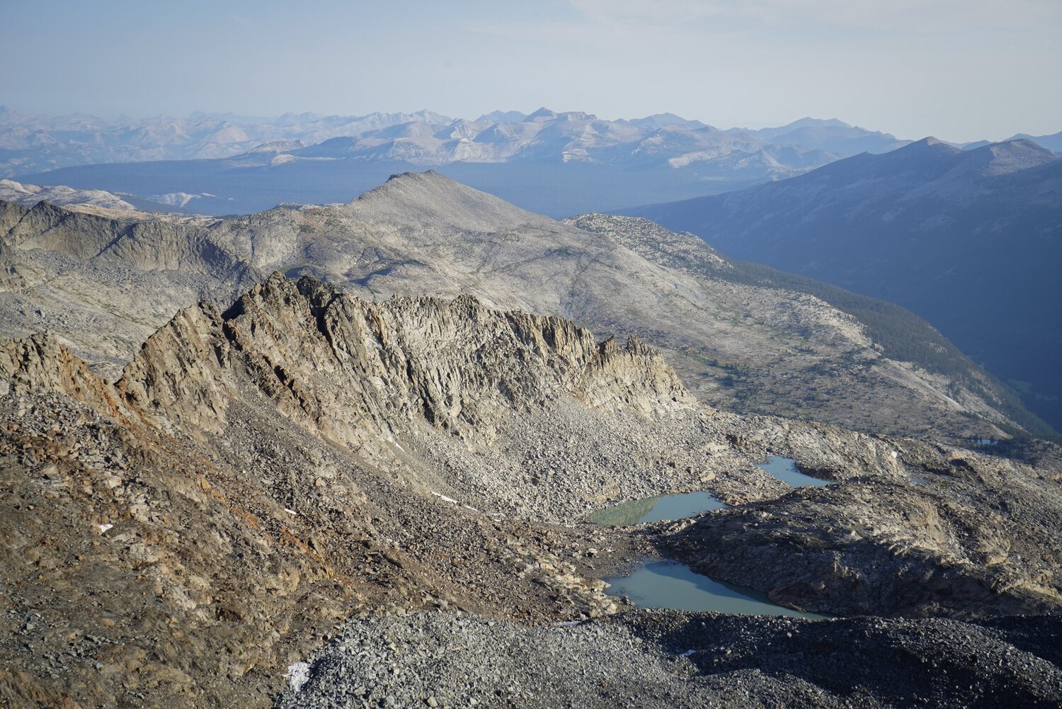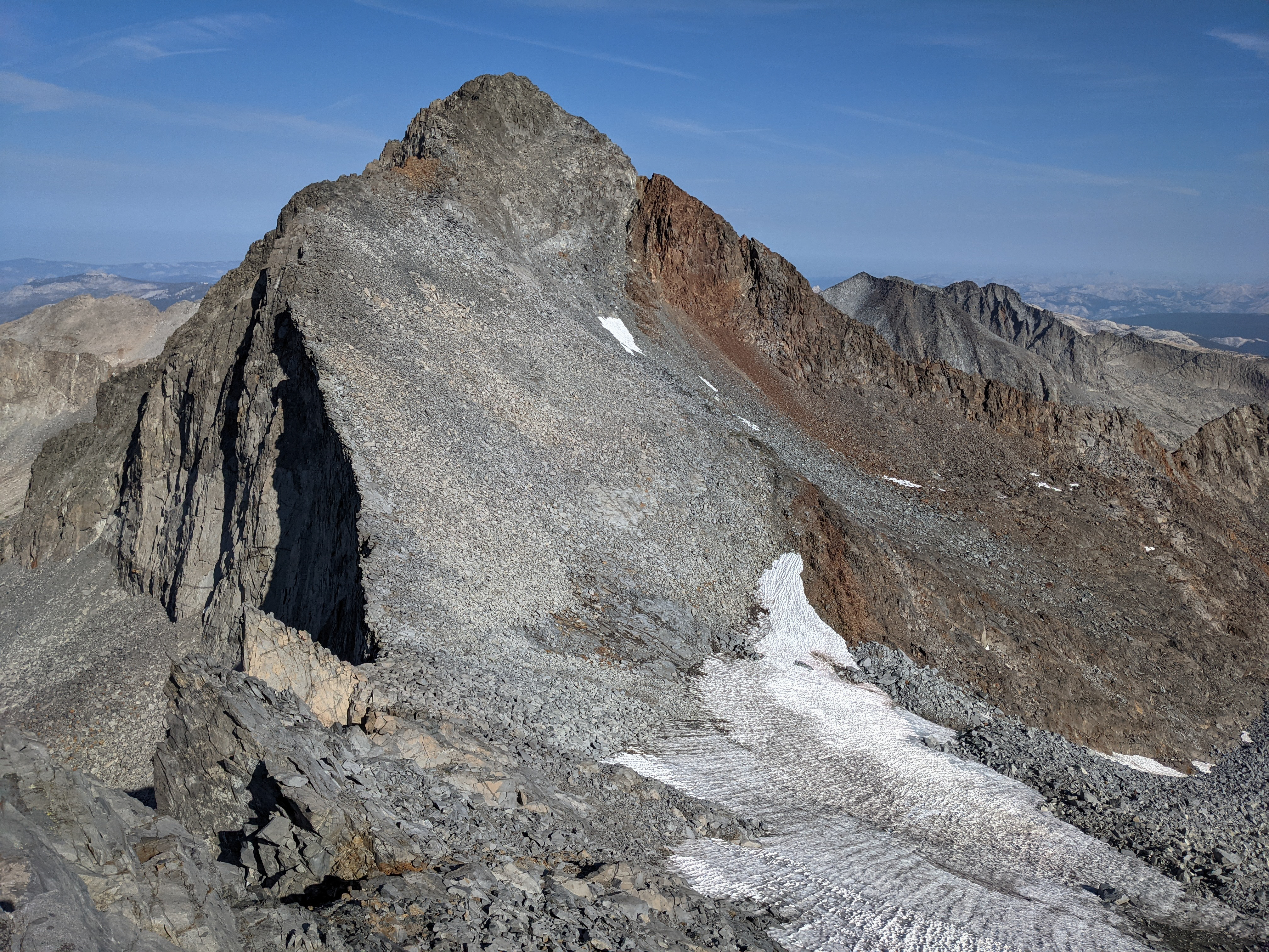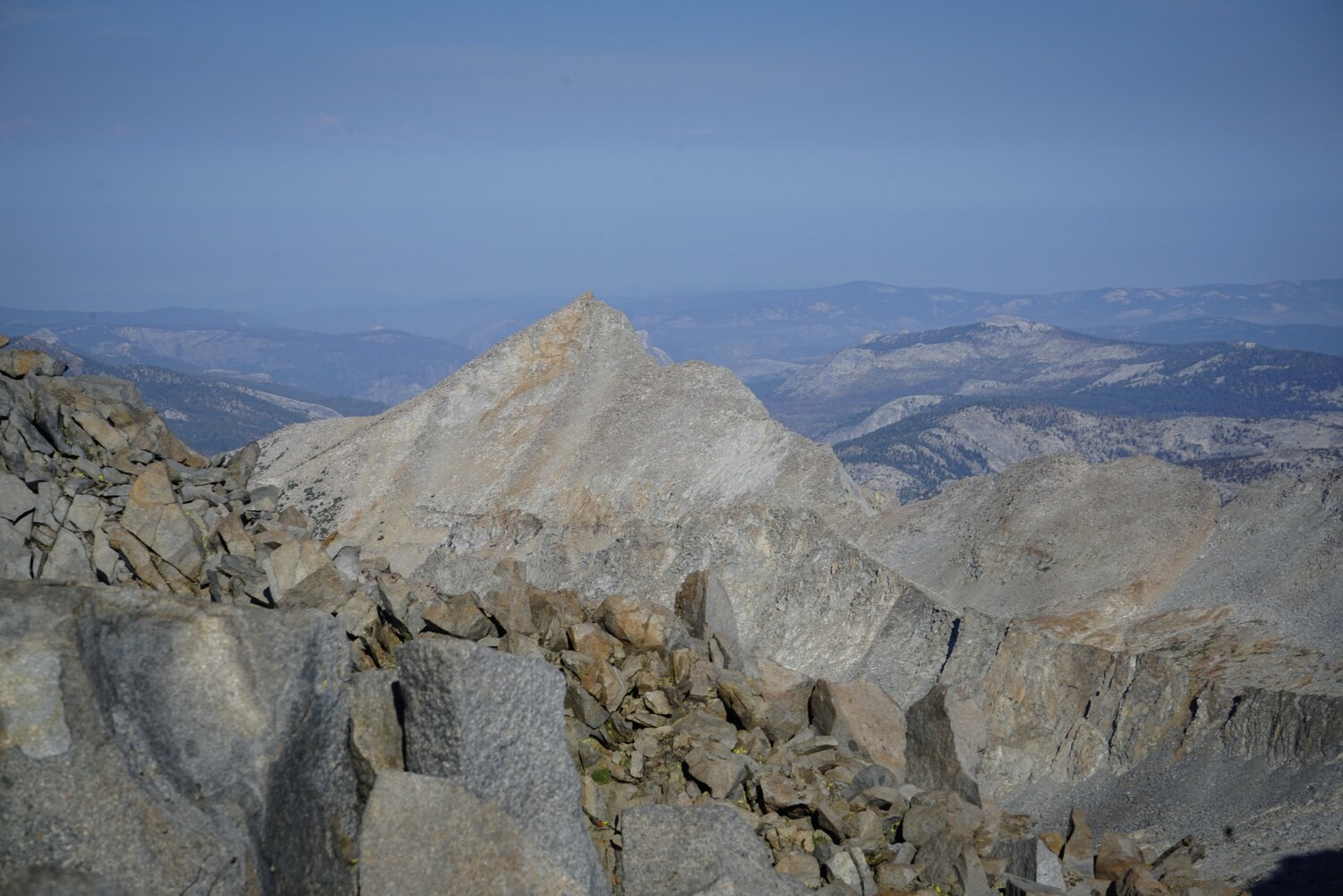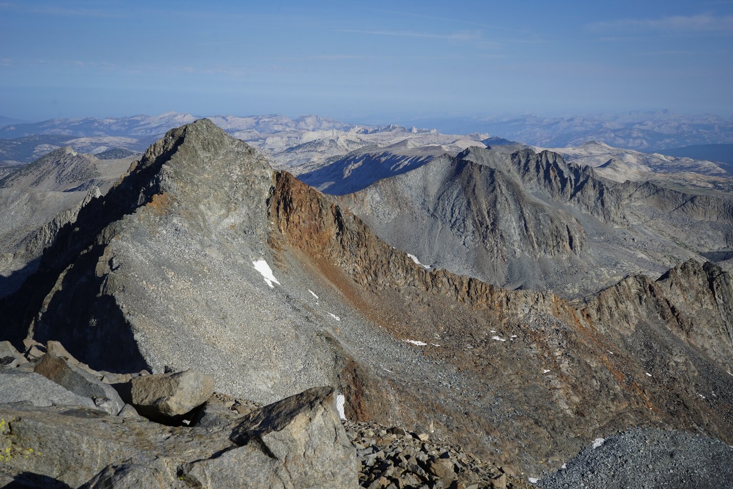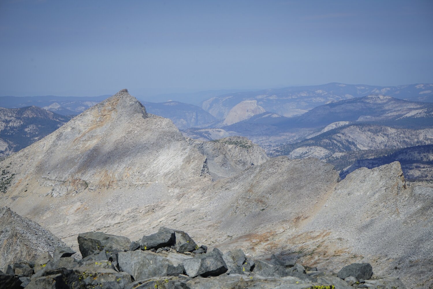 Looking north over Lyell Canyon and towards Mount Conness. After negotiating the difficult rock section, we gained a talus-covered summit plateau and boulder-hopped to the summit where we were treated with an incredible view in all directions.