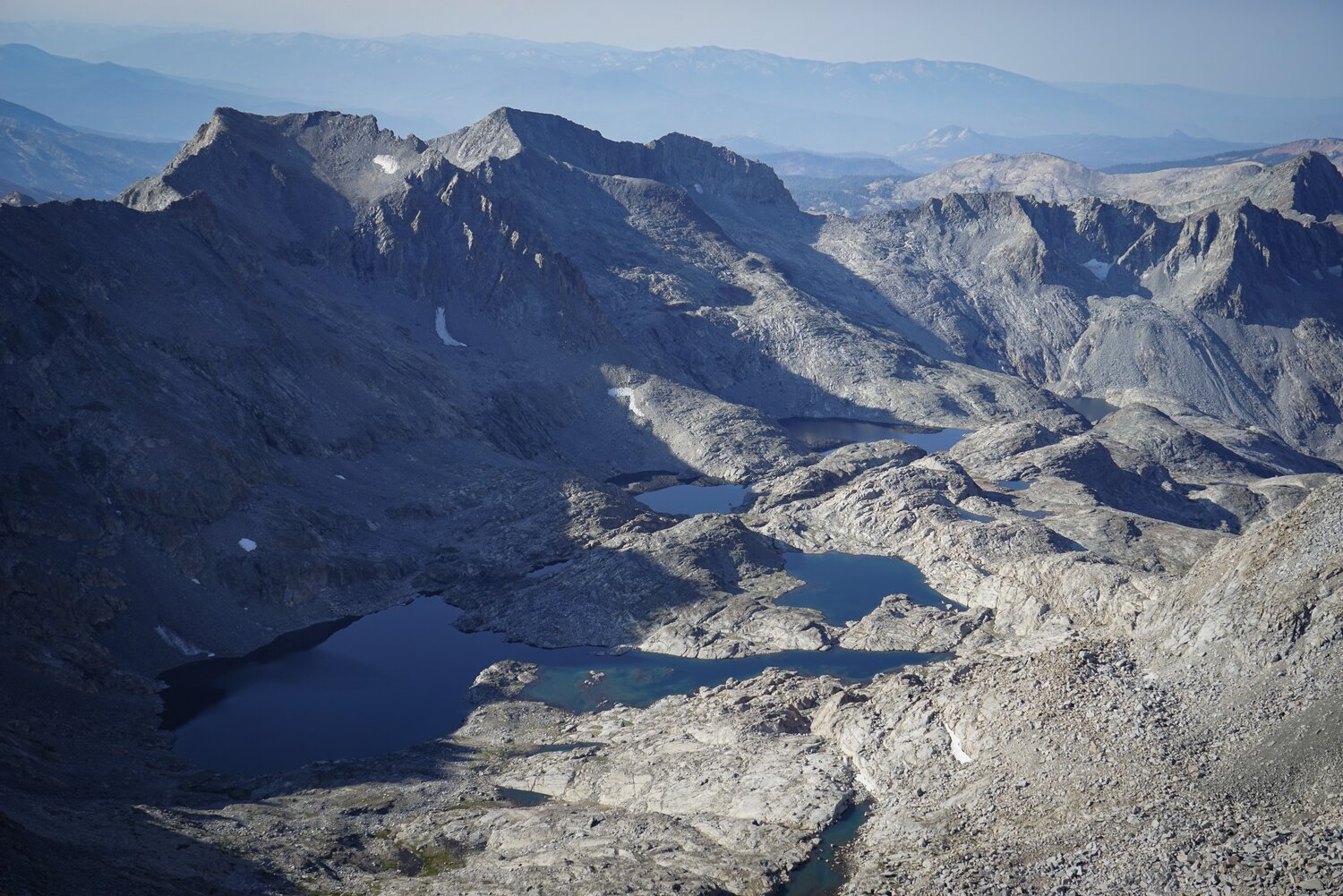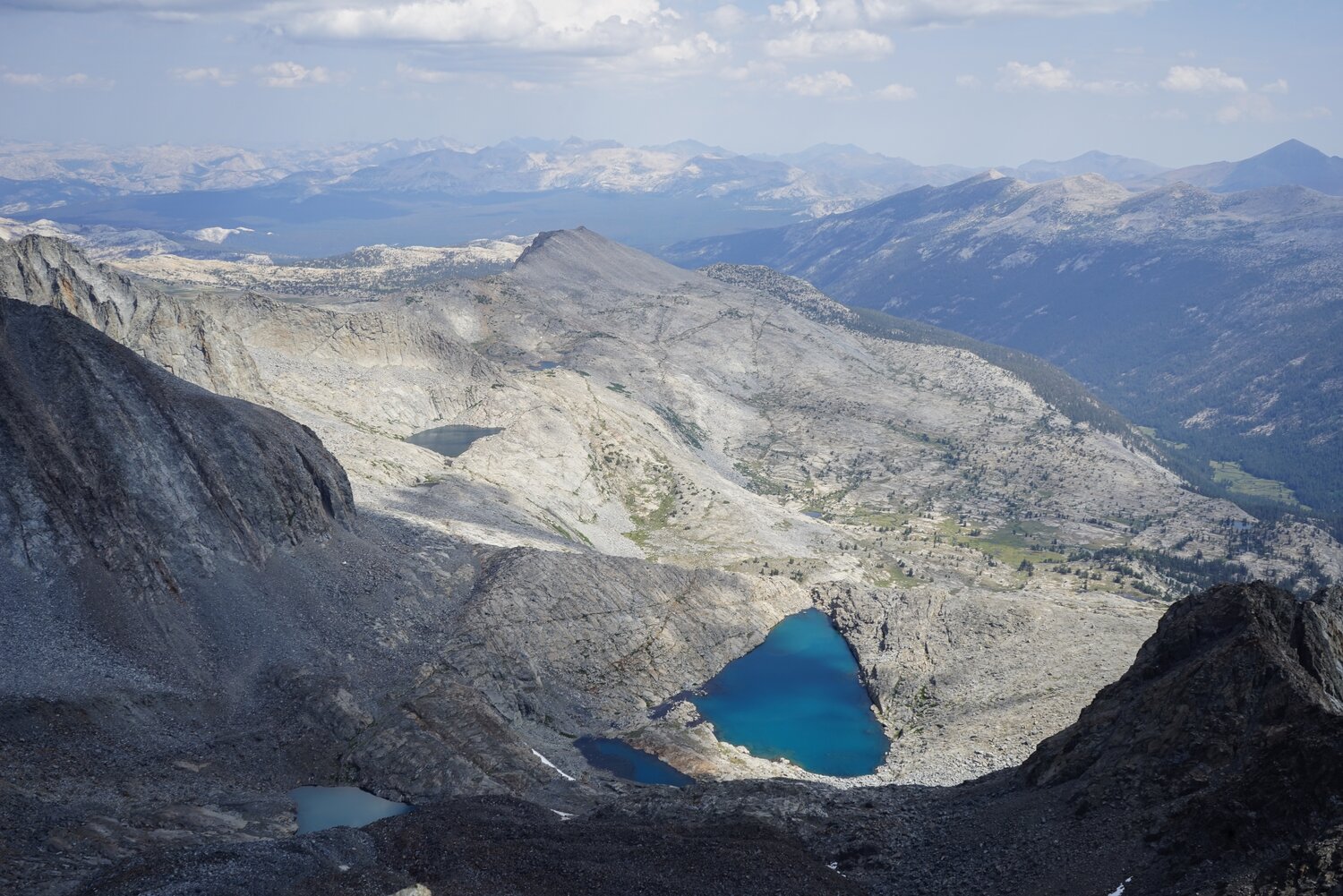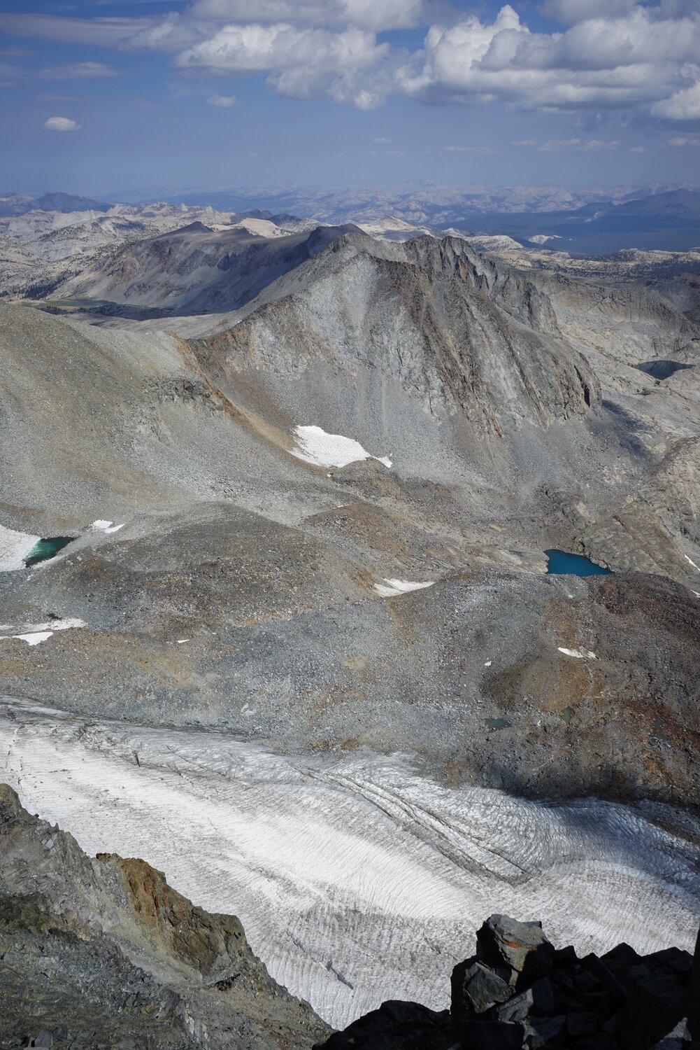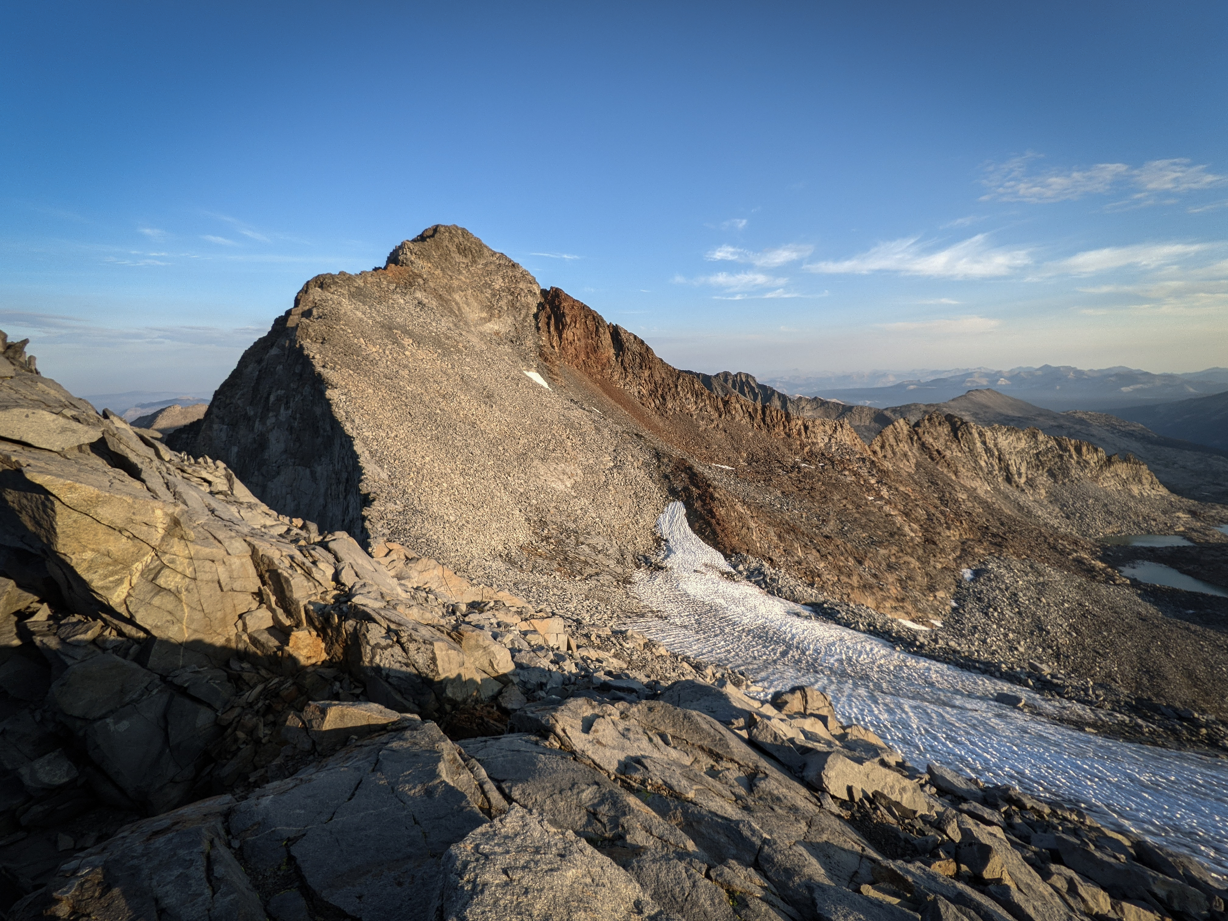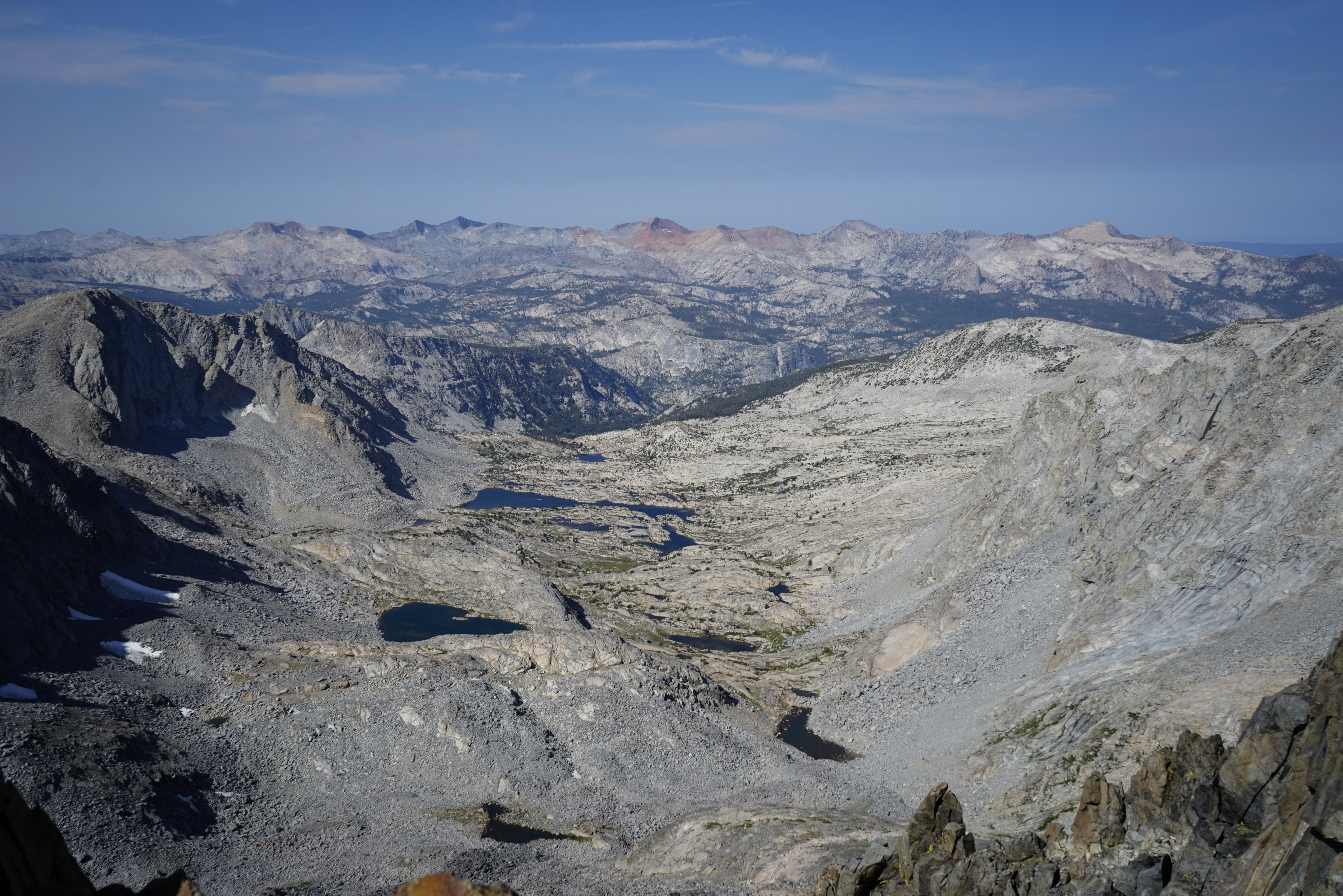Looking north over Lyell Canyon and towards Mount Conness. After negotiating the difficult rock section, we gained a talus-covered summit plateau and boulder-hopped to the summit where we were treated with an incredible view in all directions.