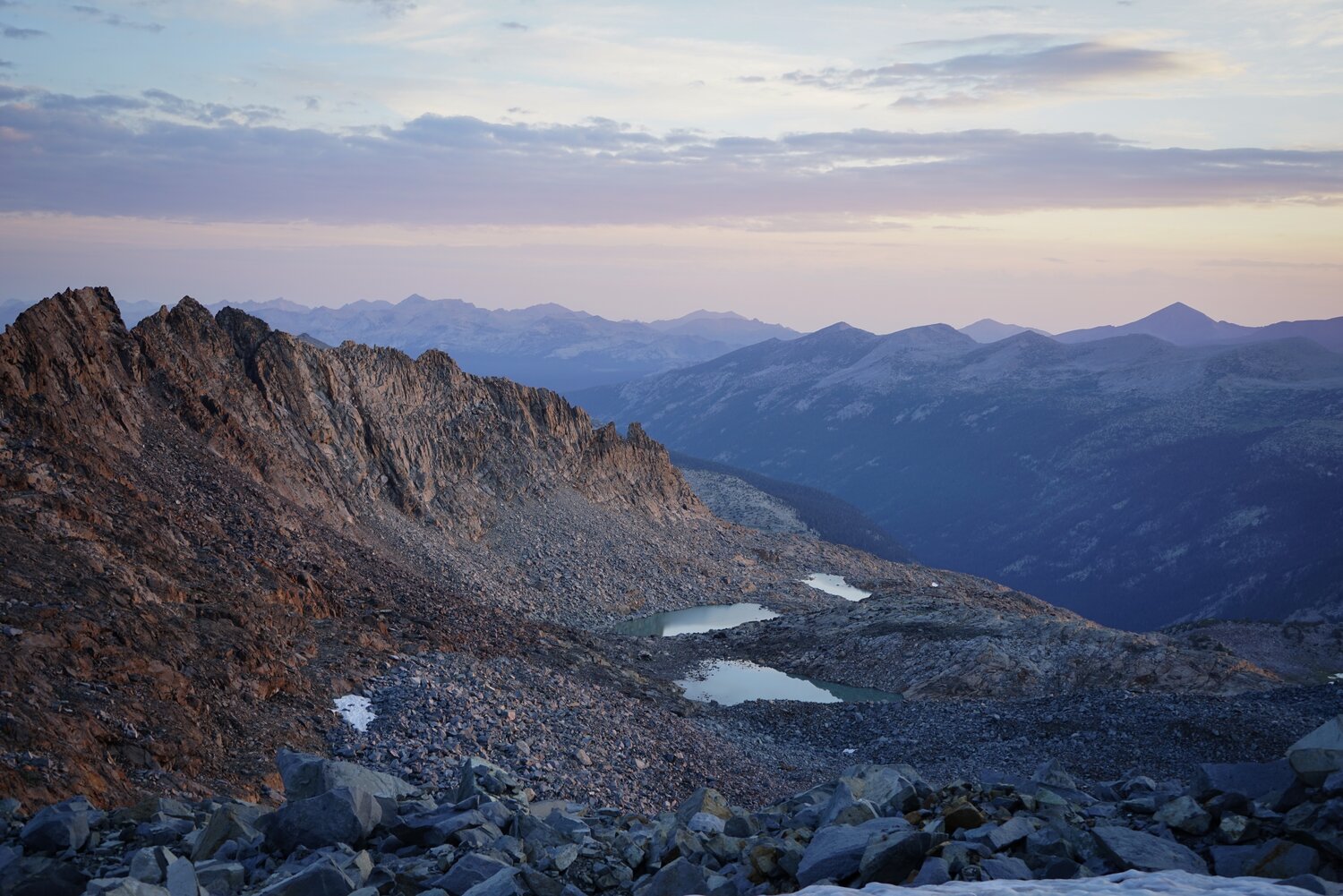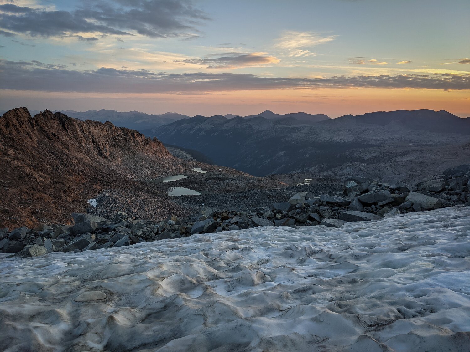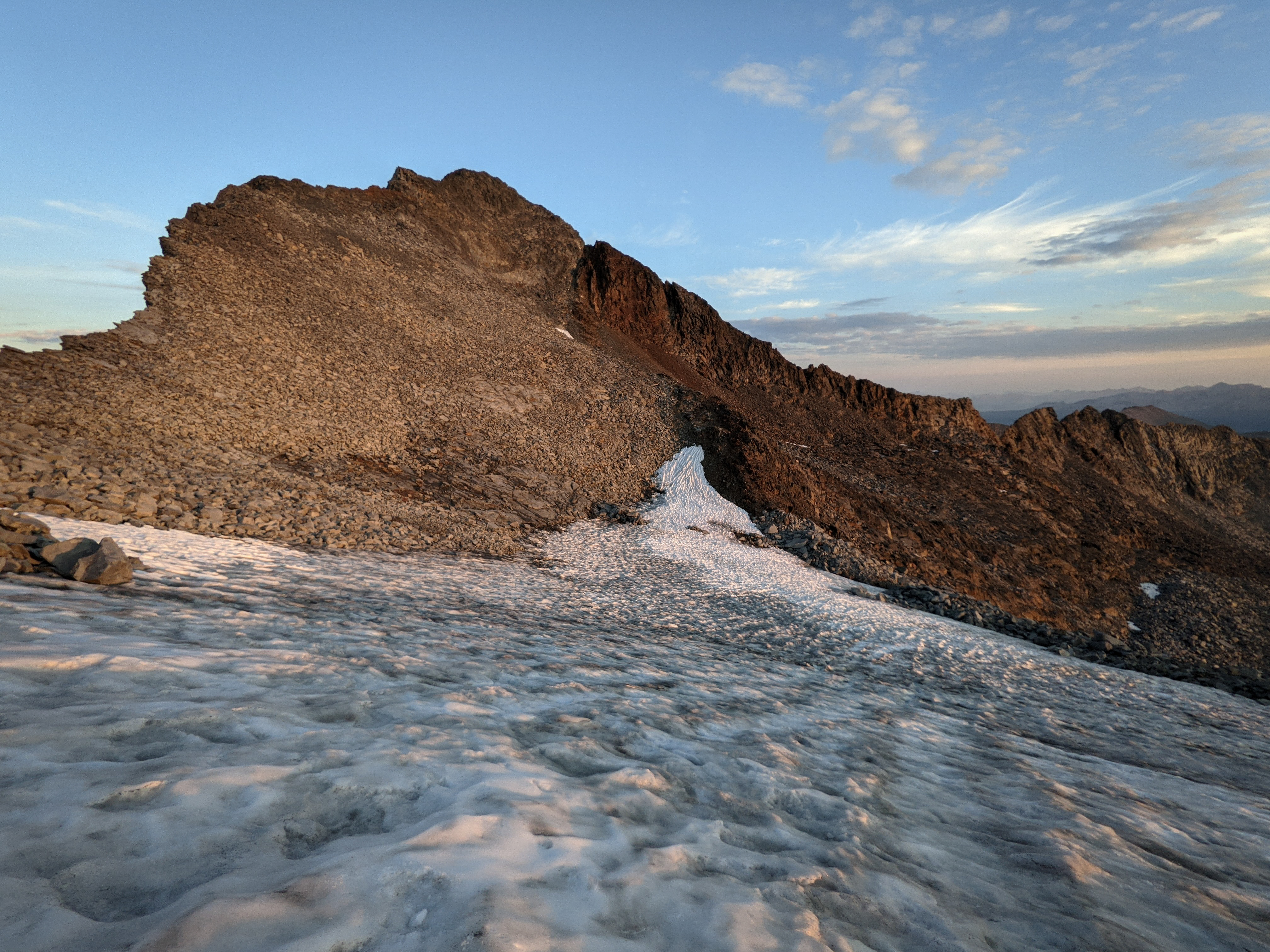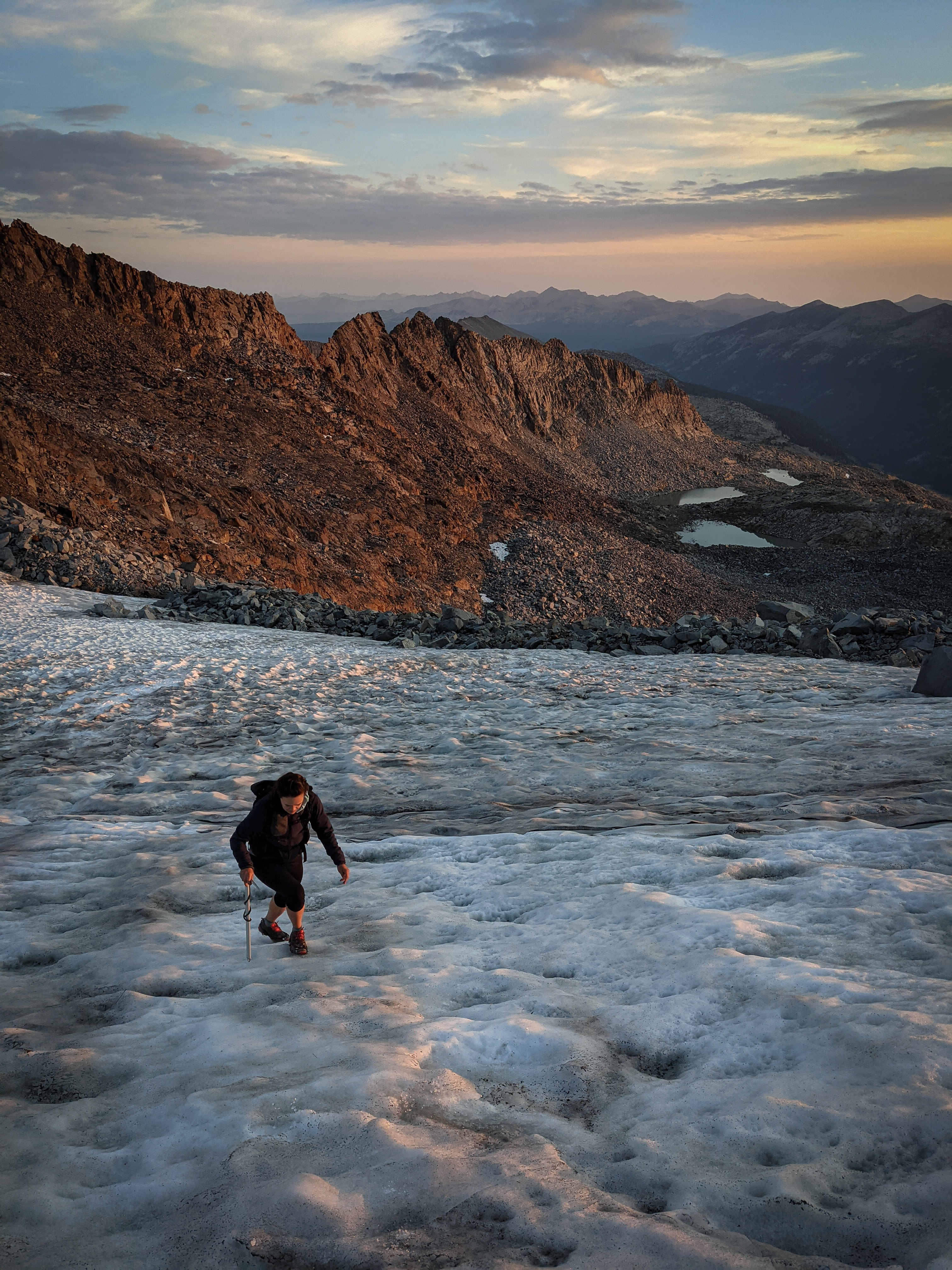 We continued climbing as the sun rose a beautiful pink and purple. It was light enough to switch off the headlamps when we reached the button of the glacier, and light enough for photos when we were maybe 100’ below Lyell-Maclure Col. We had managed to completely avoid the snow and ice, sticking to the rocks. As we climbed up beside the glacier we saw a few large rocks fall down a chute near the middle of the glacier. They would fall down the chute and hit the snow hard, falling several hundred more feet down the glacier. We were glad to not be climbing directly up below the loose gully.