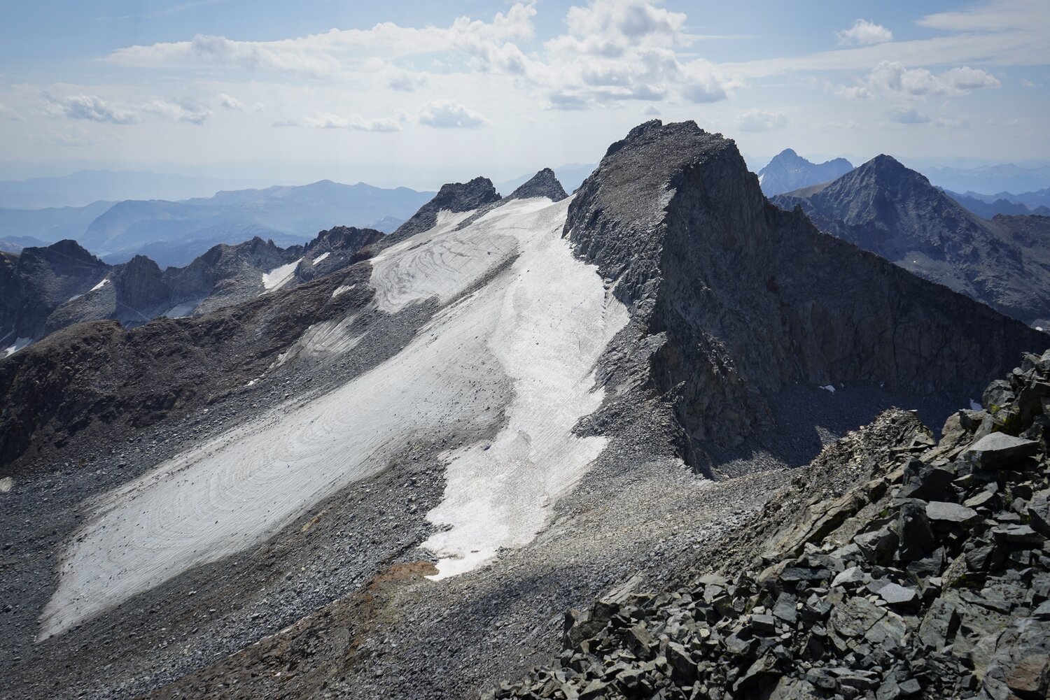 We were headed down again after a snack and drink, traversing across the ridgeline, and then carefully downclimbing the loose sections back towards Lyell-Maclure Col. We headed a little bit more directly down, when we thought the terrain looked easy enough.