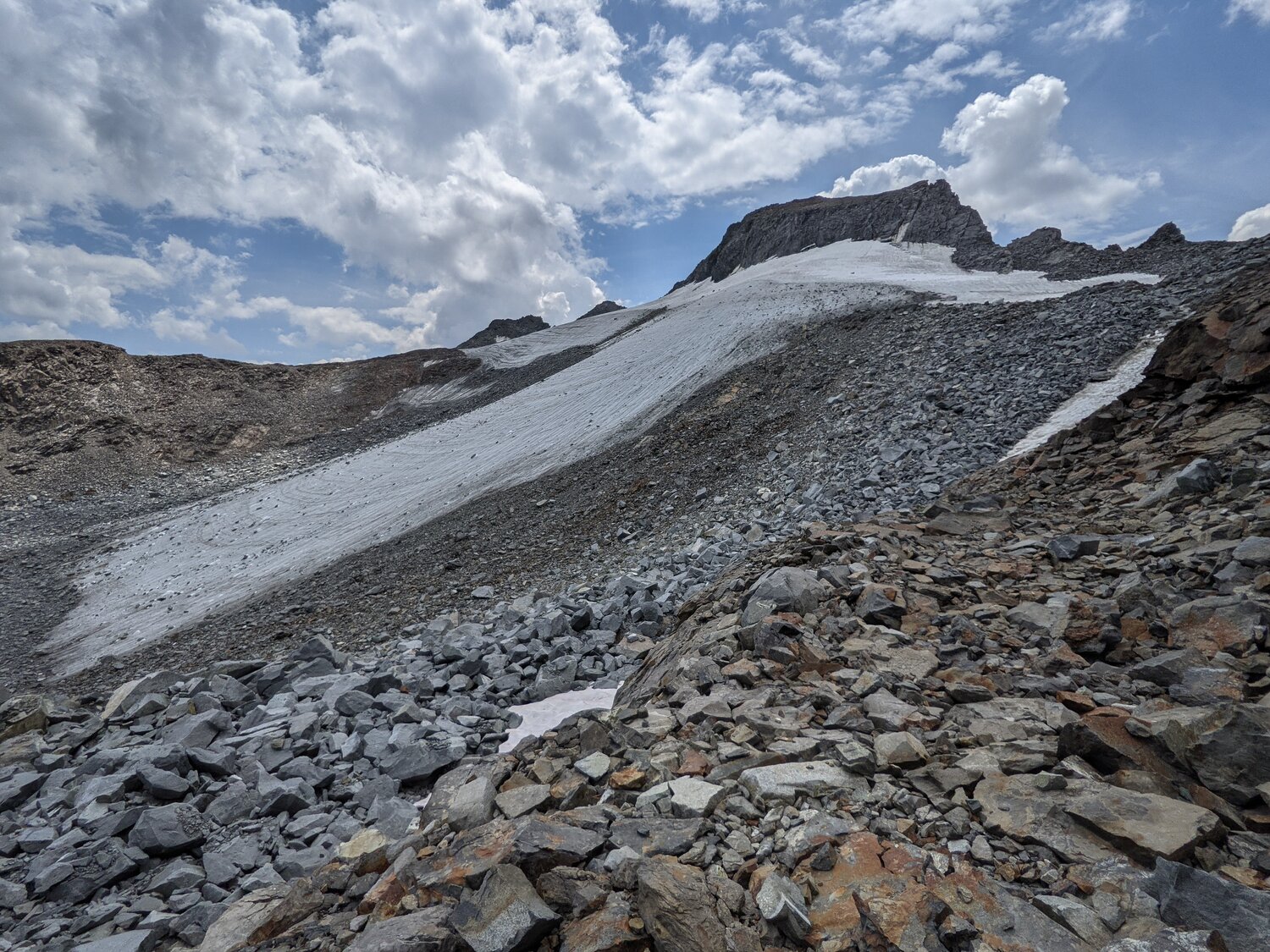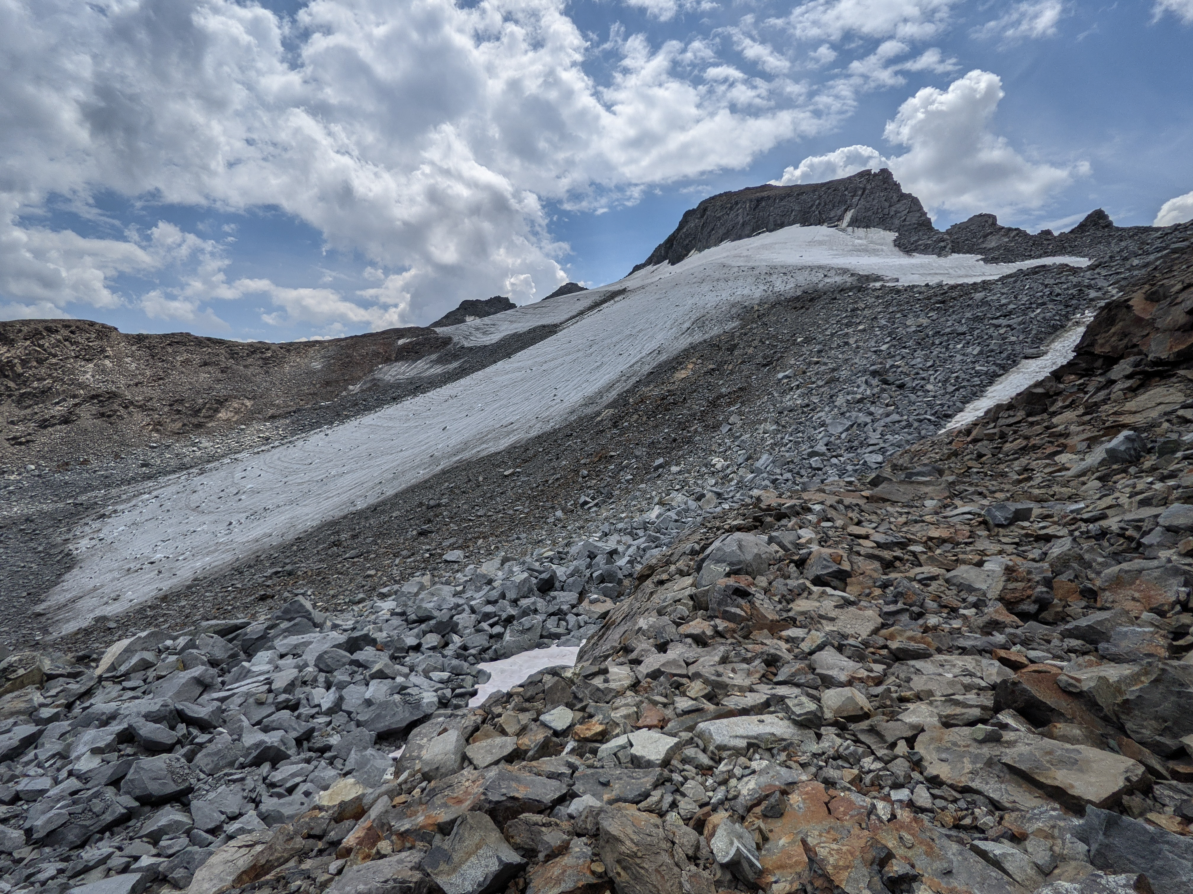 As we neared the Col, we faced a decision. We could stick to the rocks, crossing a couple of short sections of snow and climb directly to the col, then take a hard left and scramble up the rocks. Or we could climb up the snow for a little while before climbing onto the rocks. We chose the latter as it was more direct.
