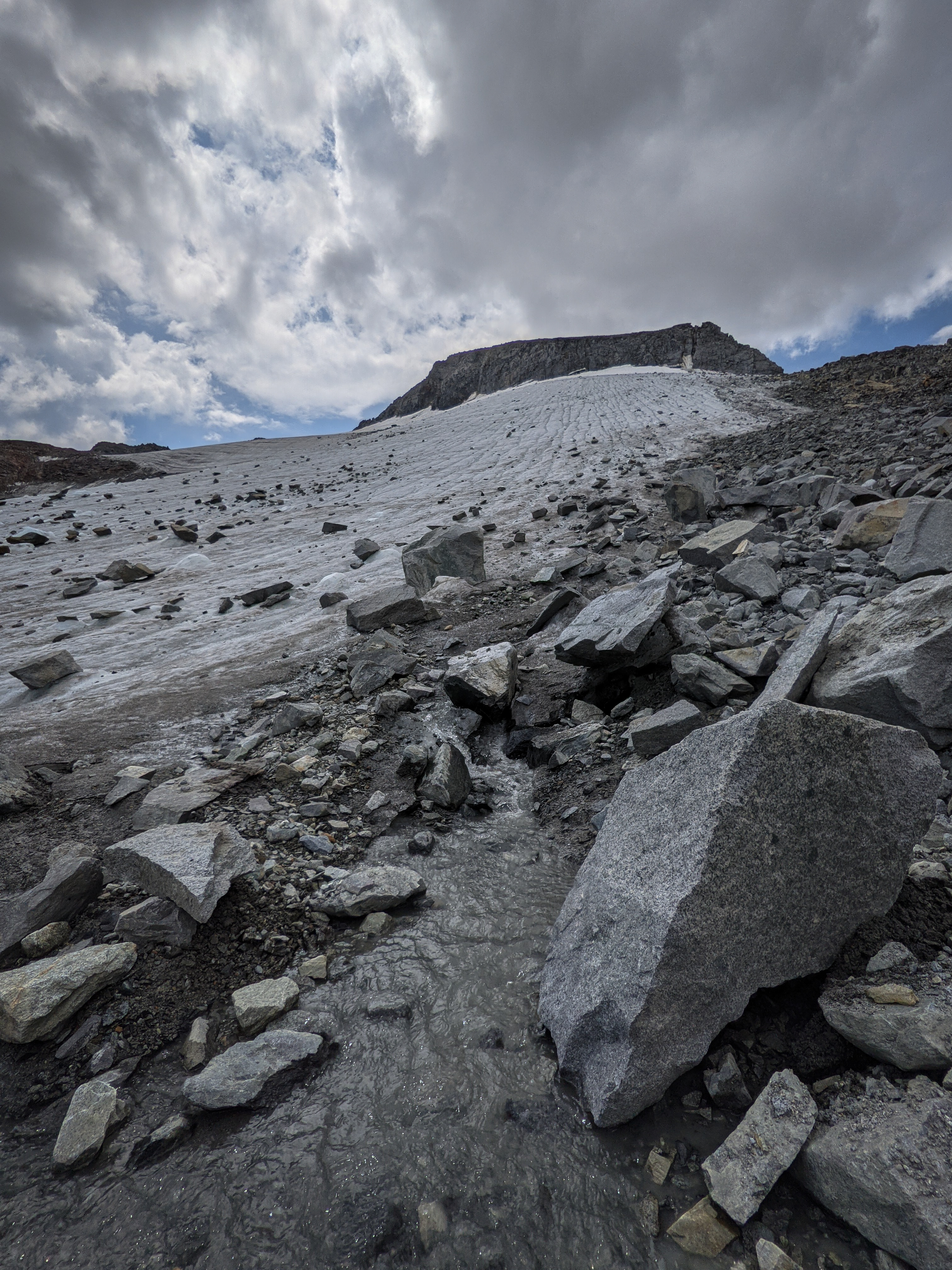 The Lyell Glacier with meltwater from below. Soon, we rock-hopped back across the moraine and found our way down the slabs back towards camp. It was much easier to find a simple route in the light, though it was still a bit steep.
