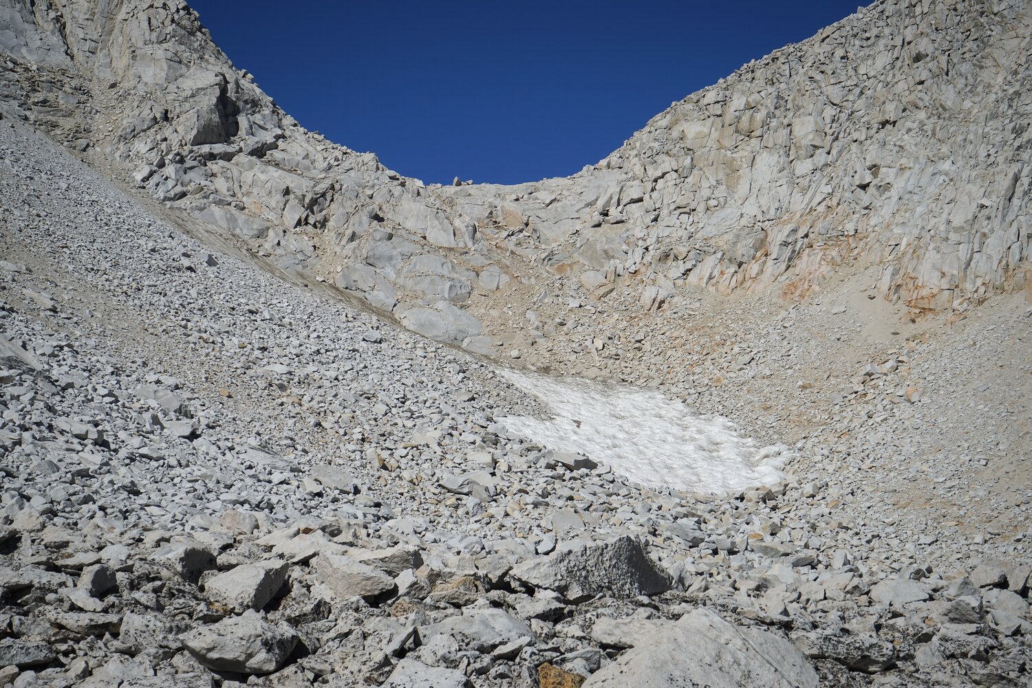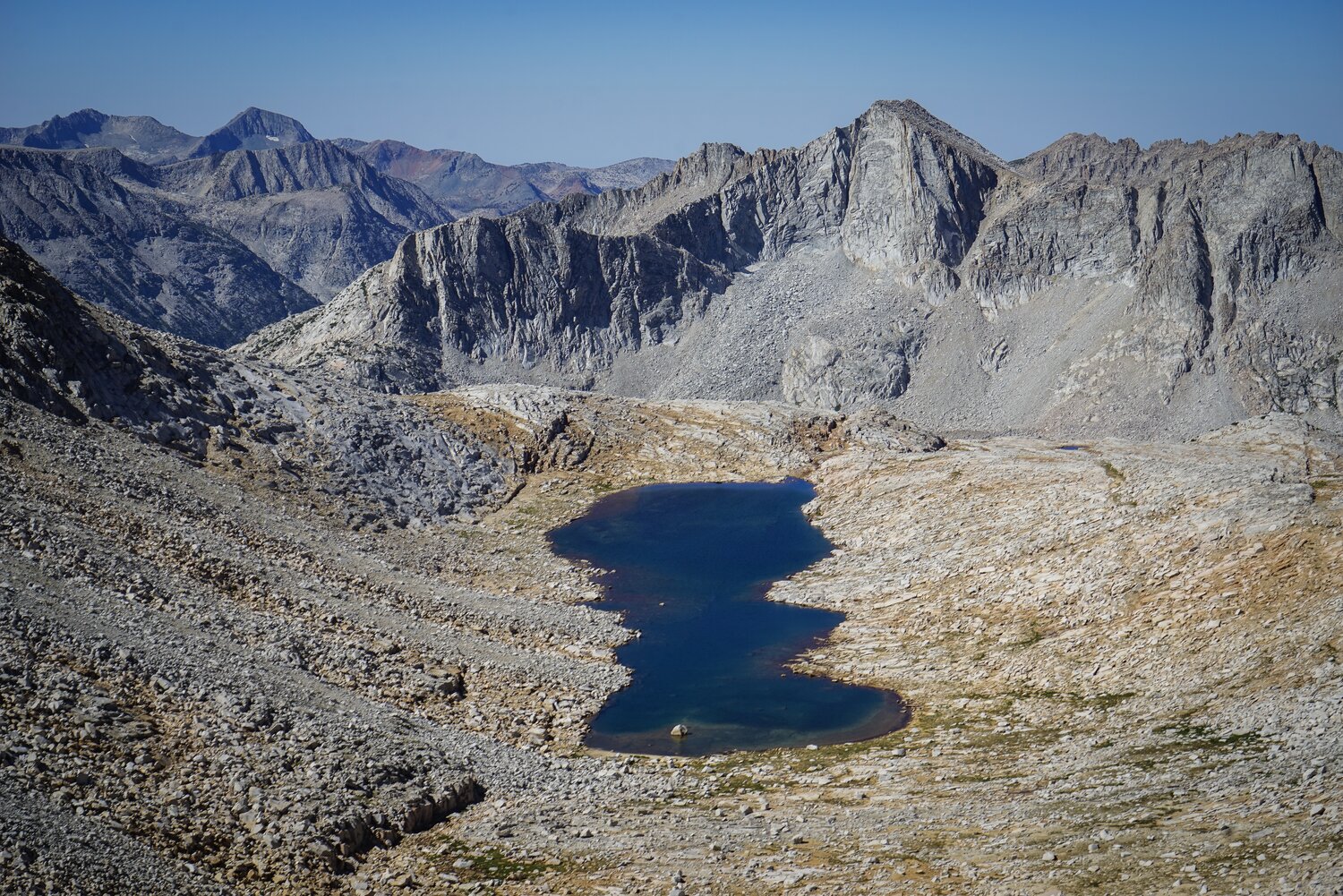 Near the top of the initial climb I ran into a family of four backpackers. I tried to negotiate a way past, but dad wanted to chat, so I obliged. They were headed across French Canyon and down Piute Pass over four or five days, so a bit more of an explorer’s pace. After some more back-and-forth, he started on a story about how he had backpacked up here many years ago and gotten caught in a snowstorm. It was becoming clear this was going to be a longer conversation than I intended, until the daughter accidentally spilled her water bottle while transferring water from one vessel to another. I took the interruption as an opportunity to continue on my way.