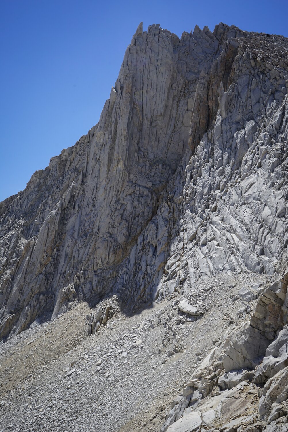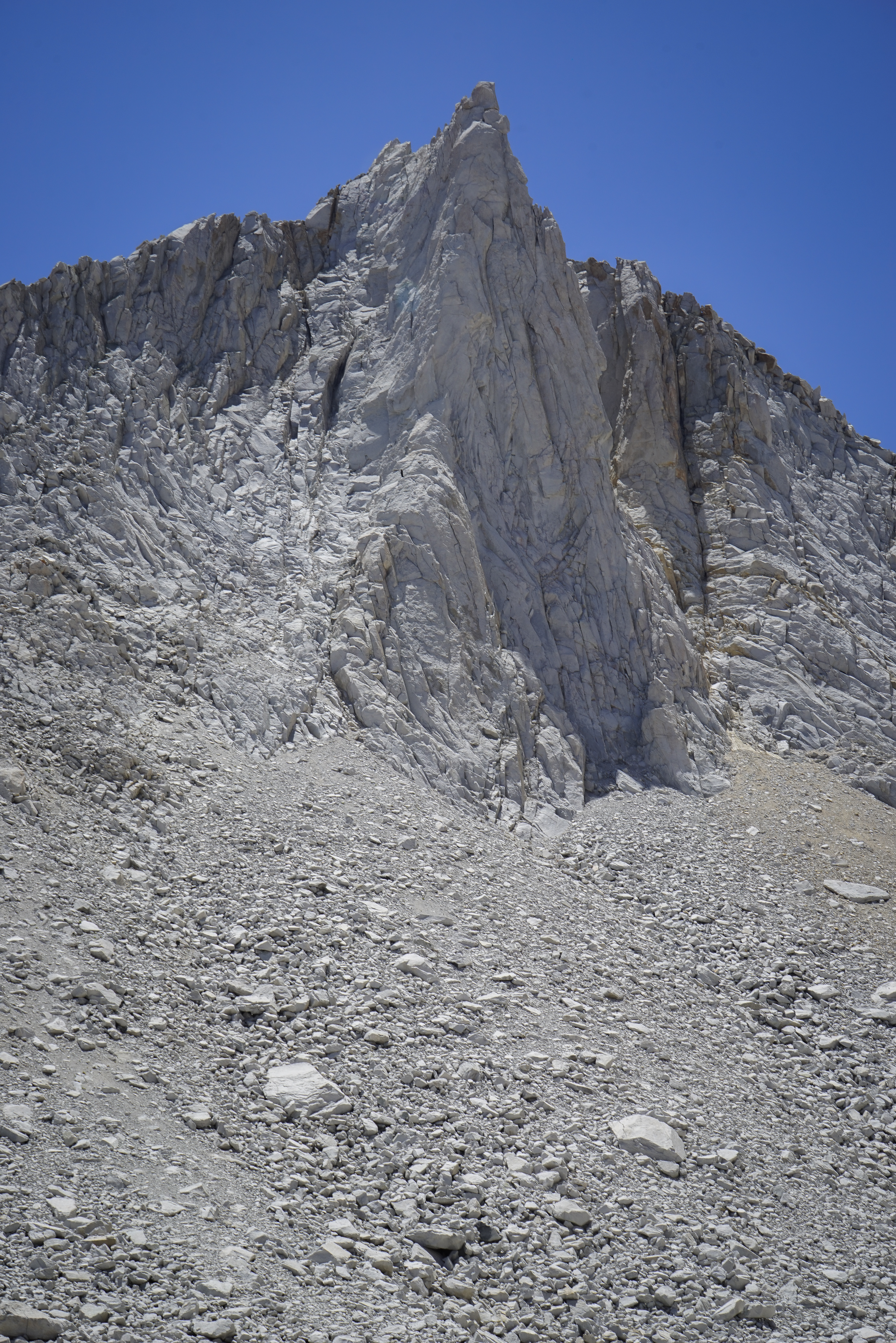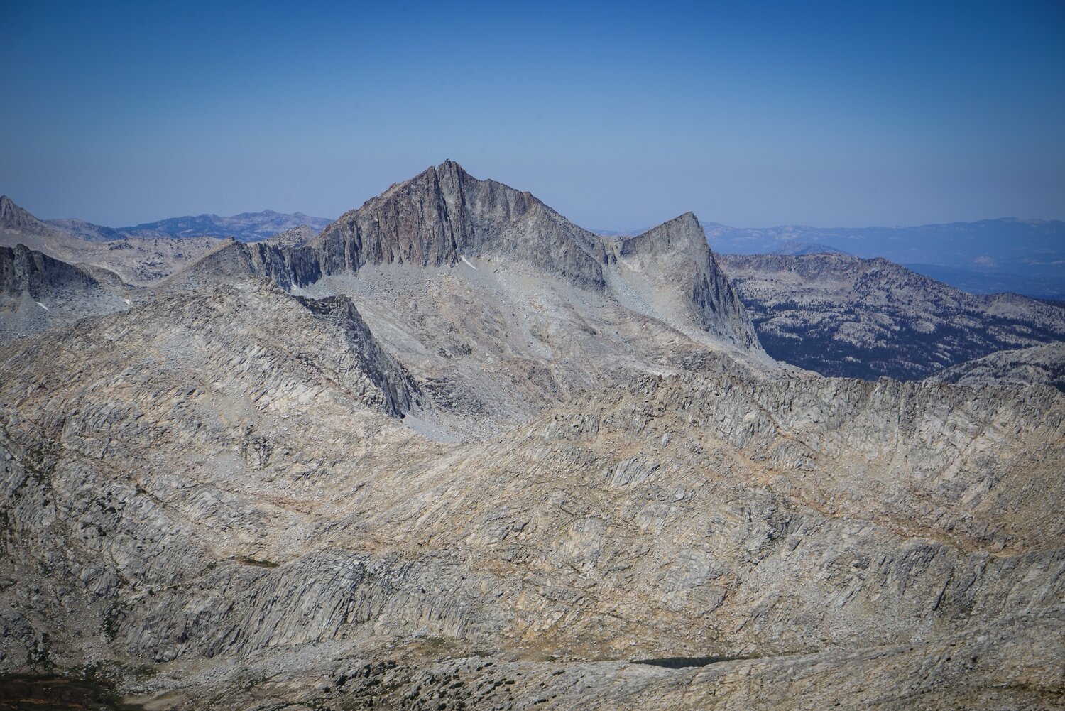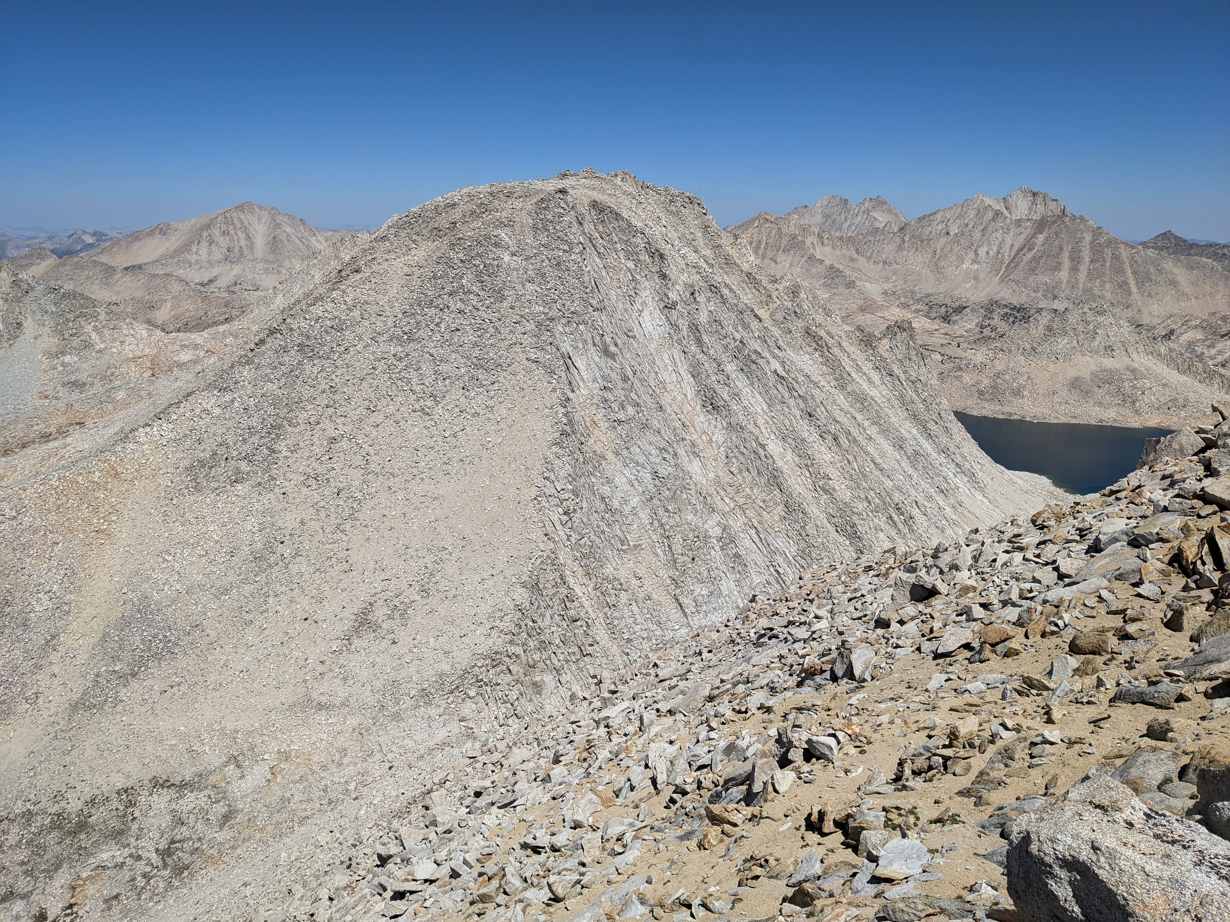 To the north, Bear Creek Spire, Mount Abbot, and Mount Gabb dominated the skyline behind Mount Julius Caesar. This is an impressive area with lots of granite and little else. After a short stay and a snack I headed south off the summit, thinking that with the good weather and not-so-tired legs I’d be able to easily climb Merriam Peak as well. The descent off of the summit was straightforward.