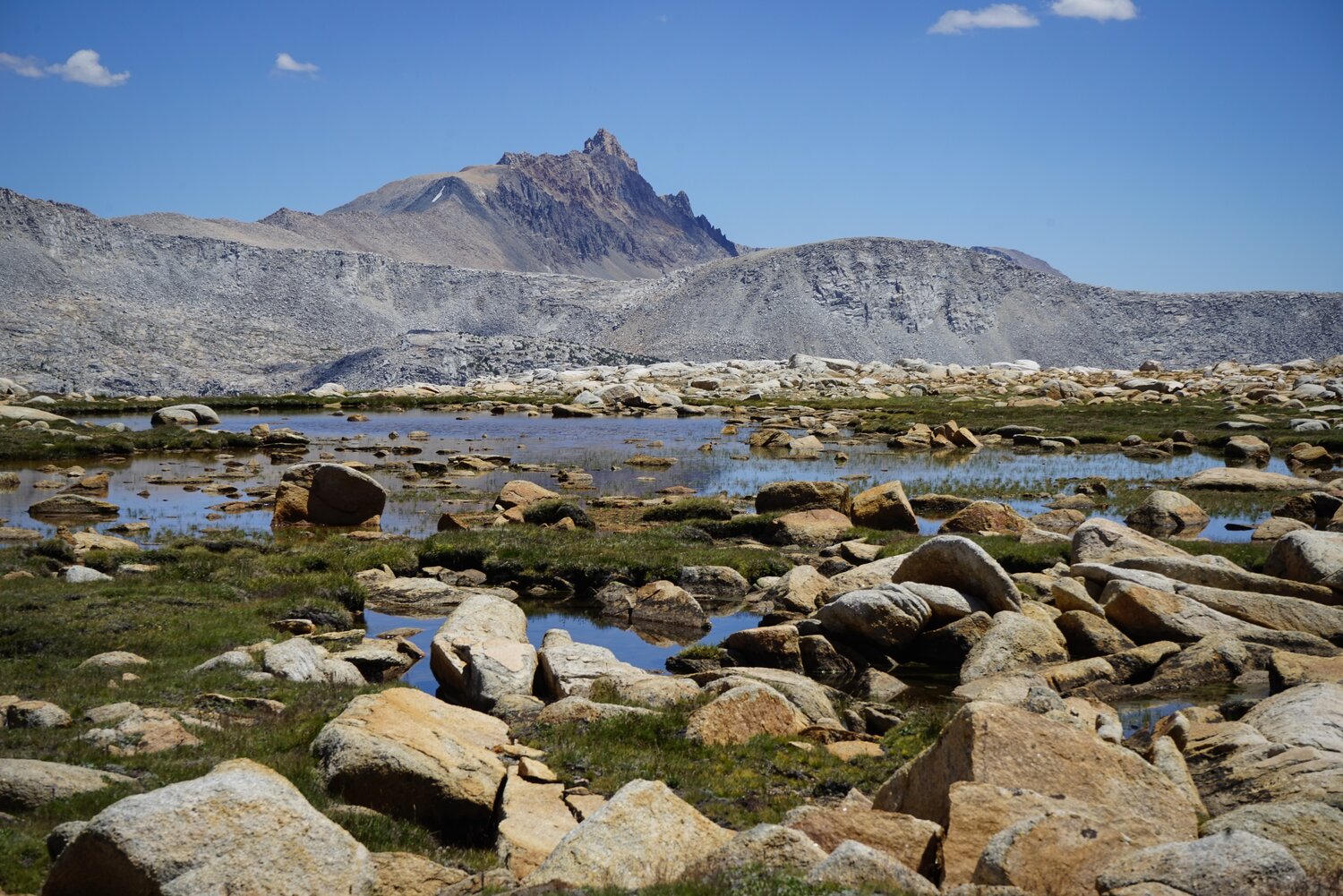 From Pine Creek Pass I left the trail, headed for the Royce Lakes. I expected most of the rest of the route to be slow going over talus, but was pleasantly surprised to find mostly open grassy benches. The travel was barely any more difficult than on the trail and I kept moving quickly.