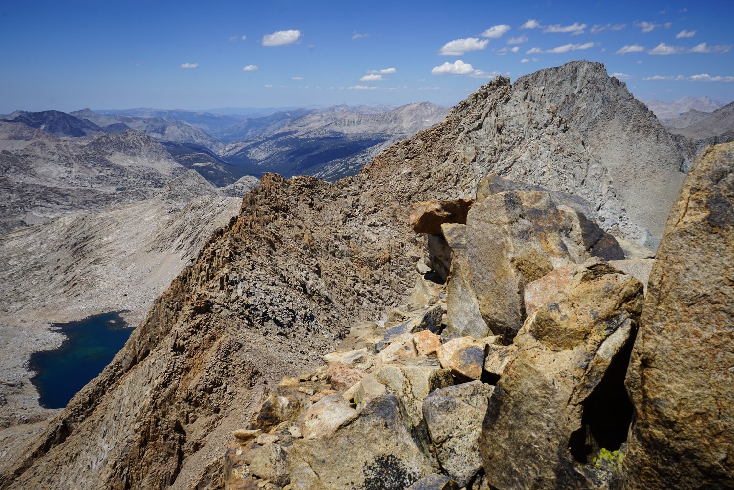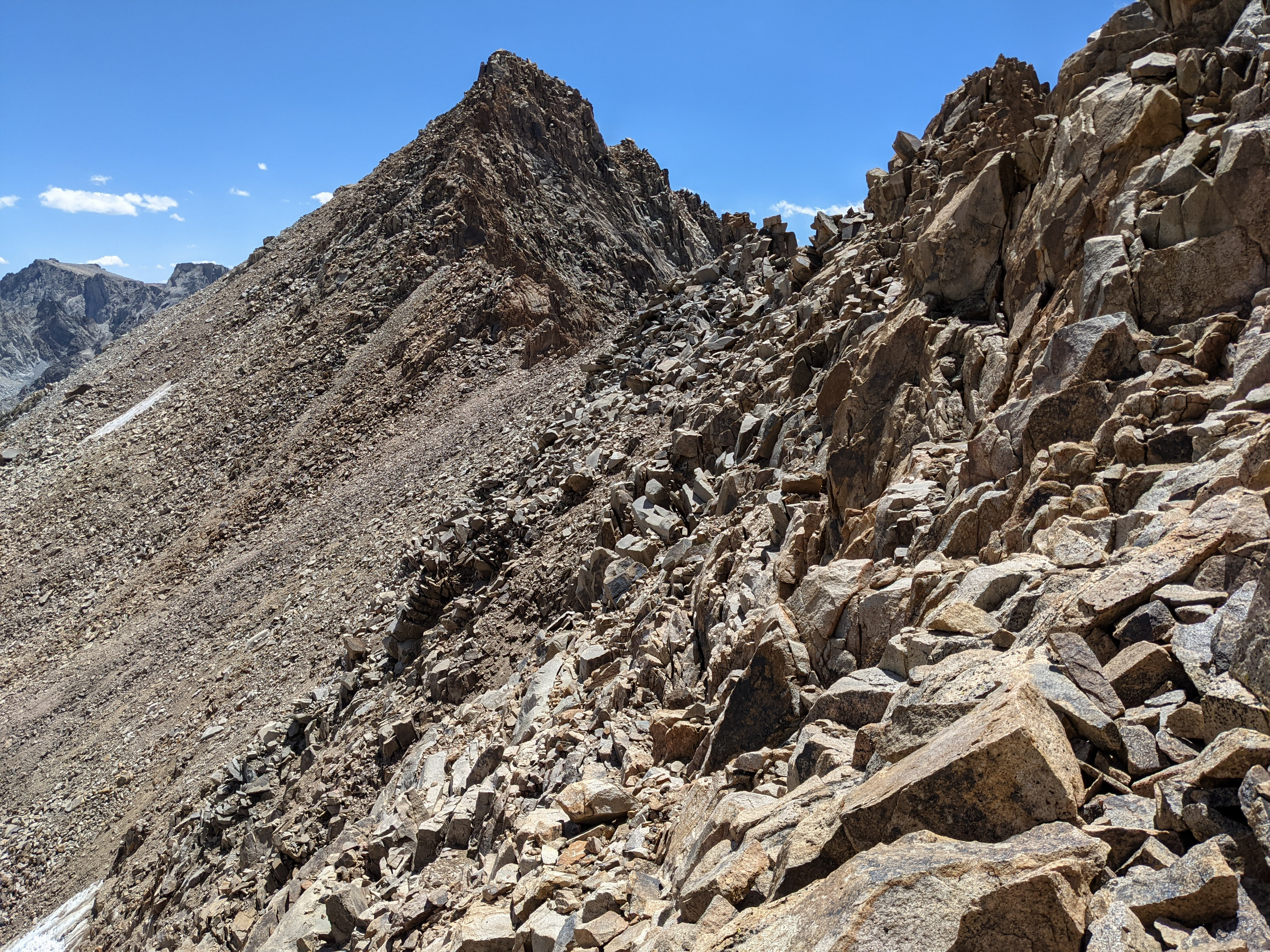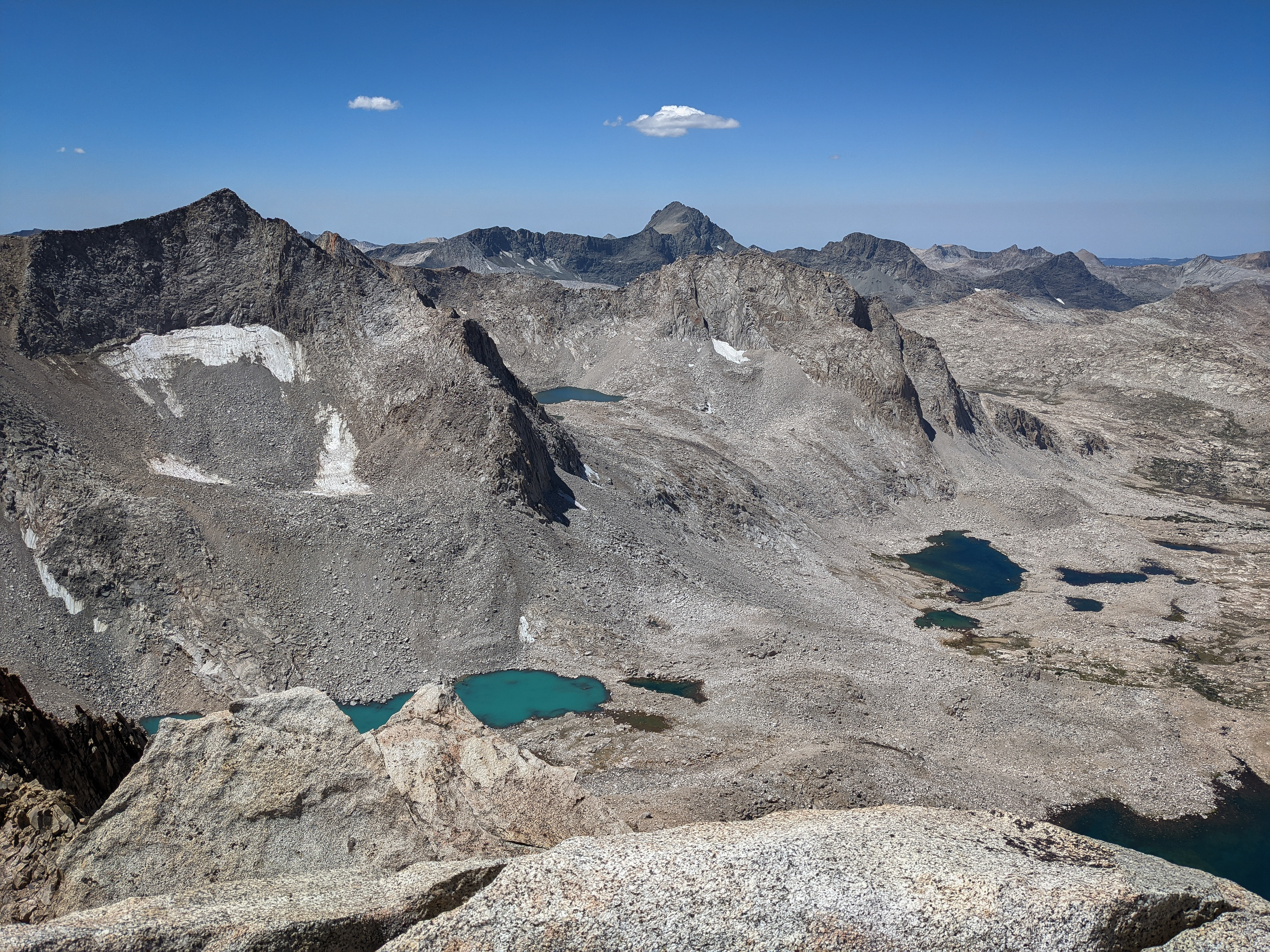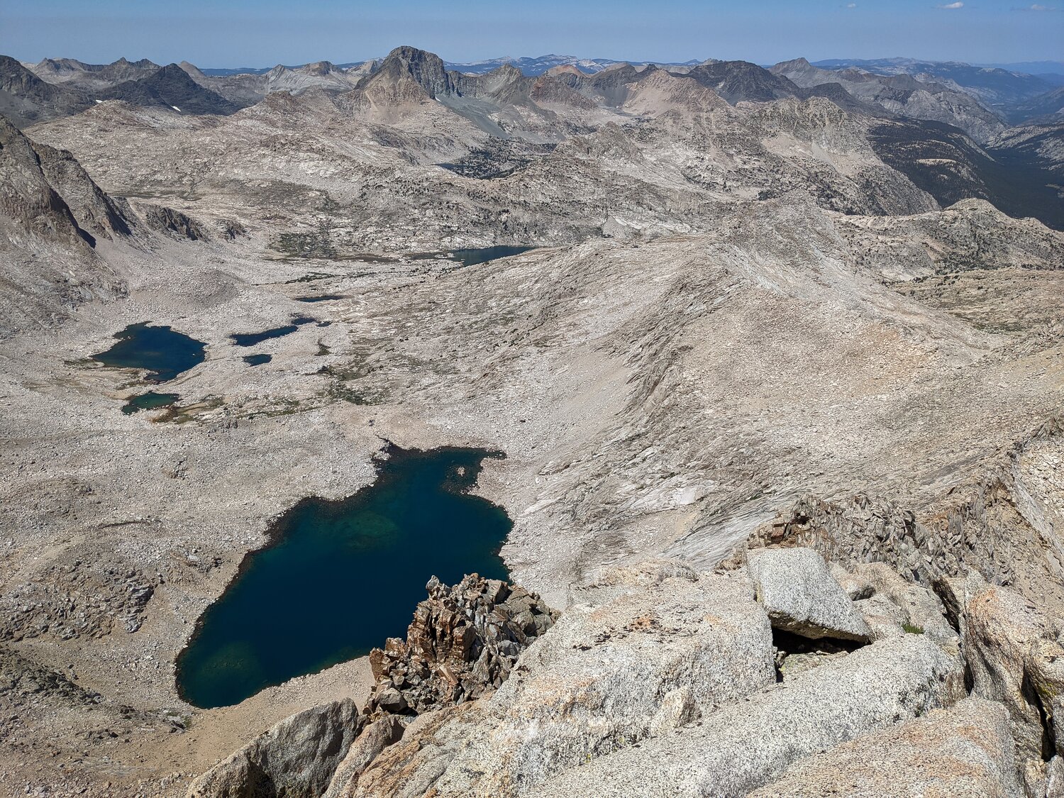 Searching for a way up to the summit rocks of Mount Wallace, and enjoying impressive views of the Evolution Lakes. I tried to stick to the crest, but the way was blocked by difficult rocks, so I had to cut across the east face about 50 vertical feet below the summit and climb up past a couple of chockstones to gain the summit. Here, there were two rocks sitting in a L shape. The summit register was on the lower part, but the vertical part of the L was obviously the summit. It was difficult to climb, though, requiring a foot smear and beached-whale mantle move. But I did it, not content to just be “close enough,” before carefully reversing the move and sitting down to enjoy the view.