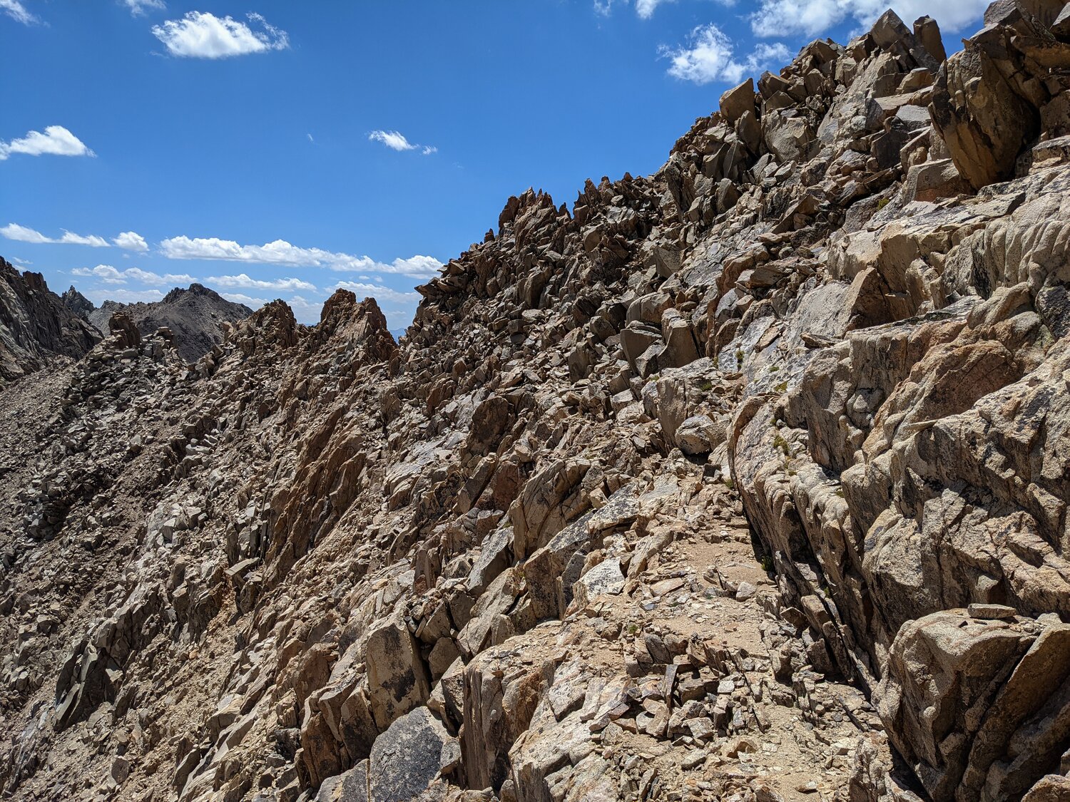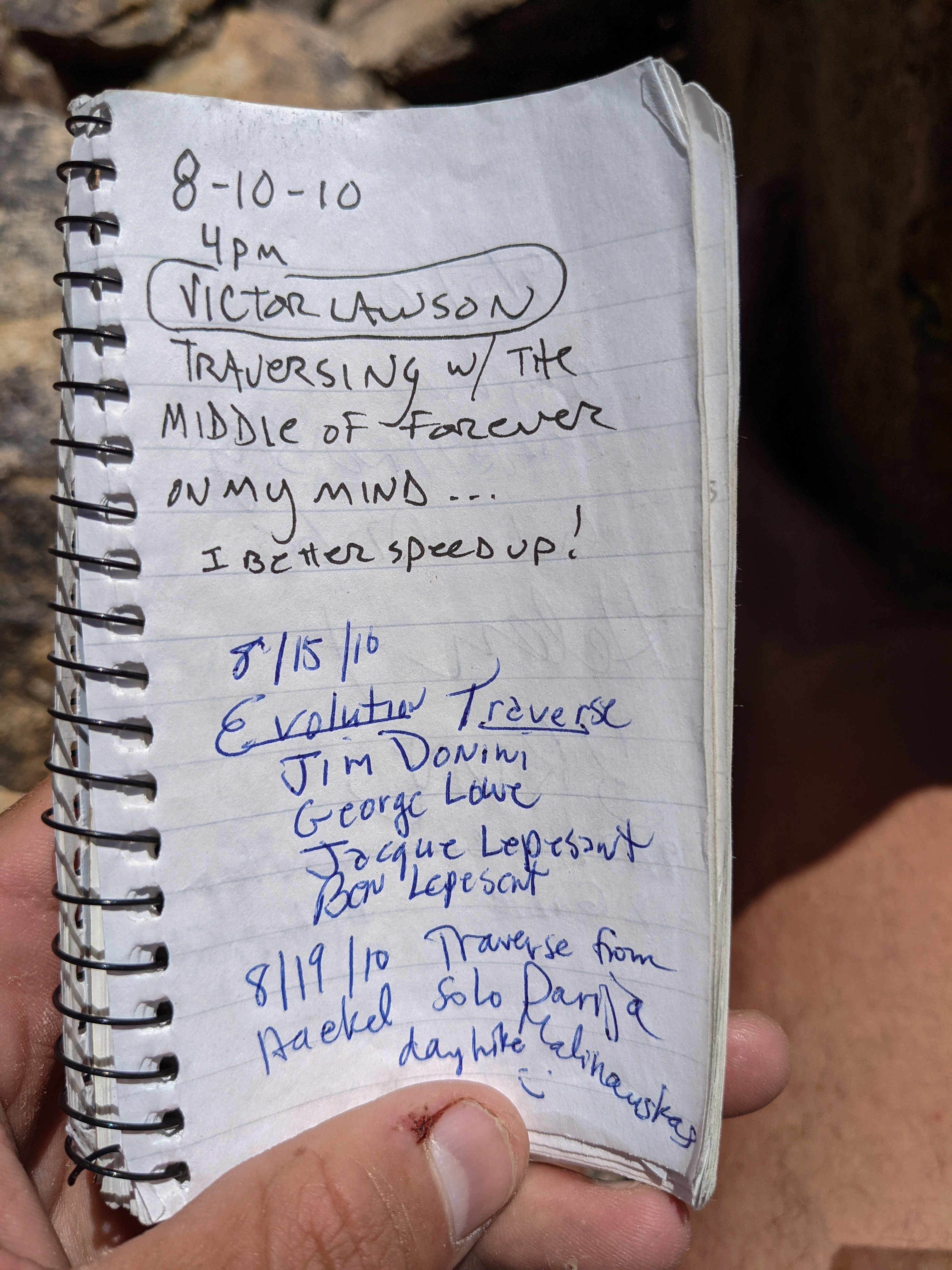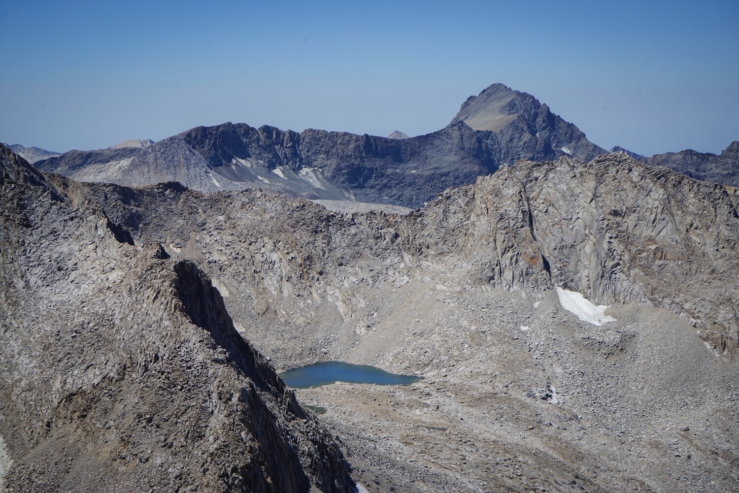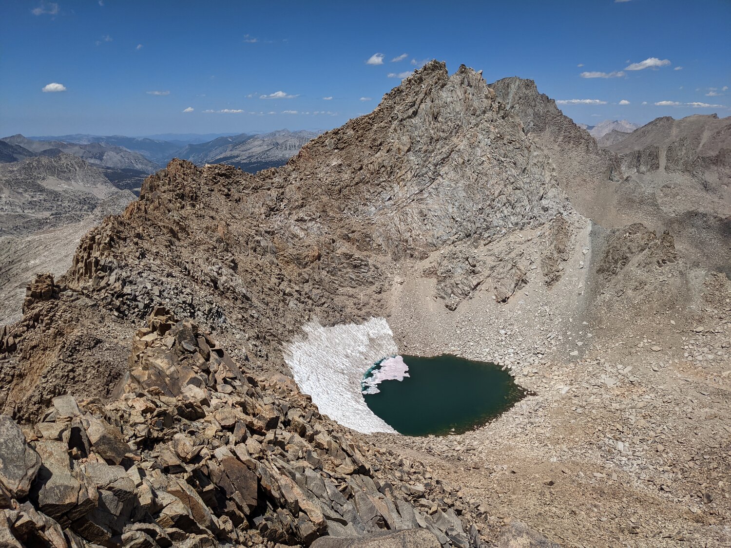 There were a bunch of entries from folks doing the Evolution Traverse, a lot more than I expected. I added my name to this little piece of history before setting off back down. I climbed down the slightly more direct Southeast Slope route, which required traversing south off of the peak and finding a suitable chute for descending. The rock on this part of the mountain was awful, which may explain why the next peak to the south is called “Crumbly Spire.” I took care to pick the least steep chute to descend, but I was knocking down small avalanches of rocks with each step. The steep upper 400’ of the descent was quite an adventure and very slow. But soon enough I reached the less steep section around 12,500’and it was just loose and not-so-steep. I sped up a bit and reached the small tarn above Echo Lake before rejoining the path I had taken up through the talus and hiked down to Echo Lake.