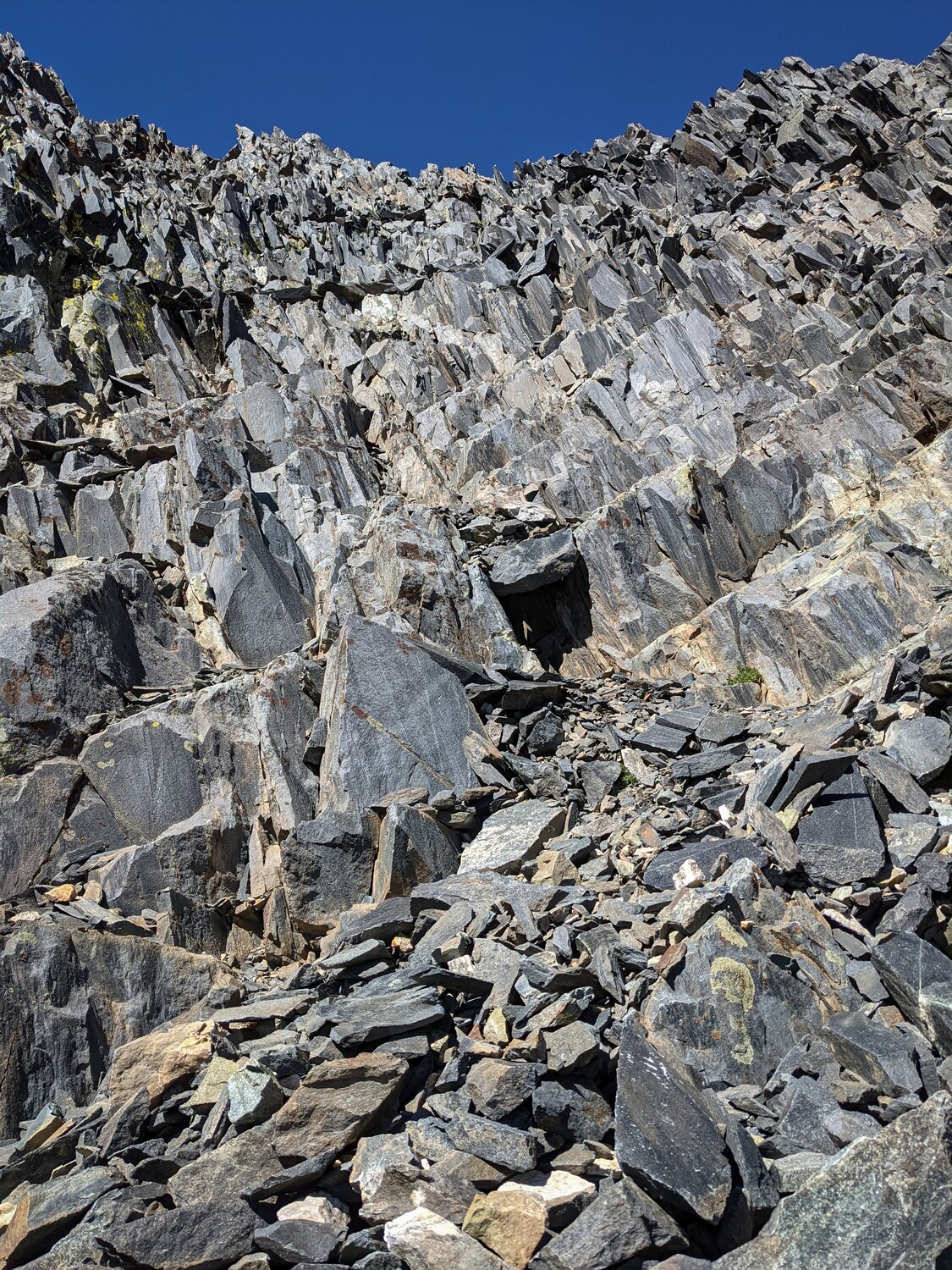 The wind was blowing pretty good on the crest, so I donned some warmer clothes and started traversing across the broken slate-like rocks along the ridge. It was loose and crumbly, but not at all steep or difficult to get over to the base of the peak.