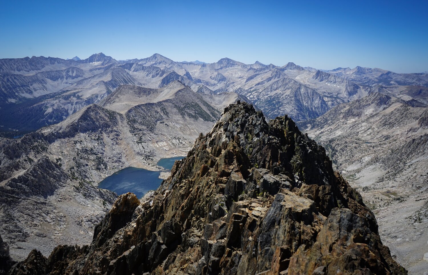 Looking out over Big McGee Lake and Mount Stanford and Mount Morgan. The traverse back across the ridge was a bit trickier than on the way up, sometimes it’s harder to go down things like that, especially if there’s loose rock. But I survived it and after reaching the summit of Peak