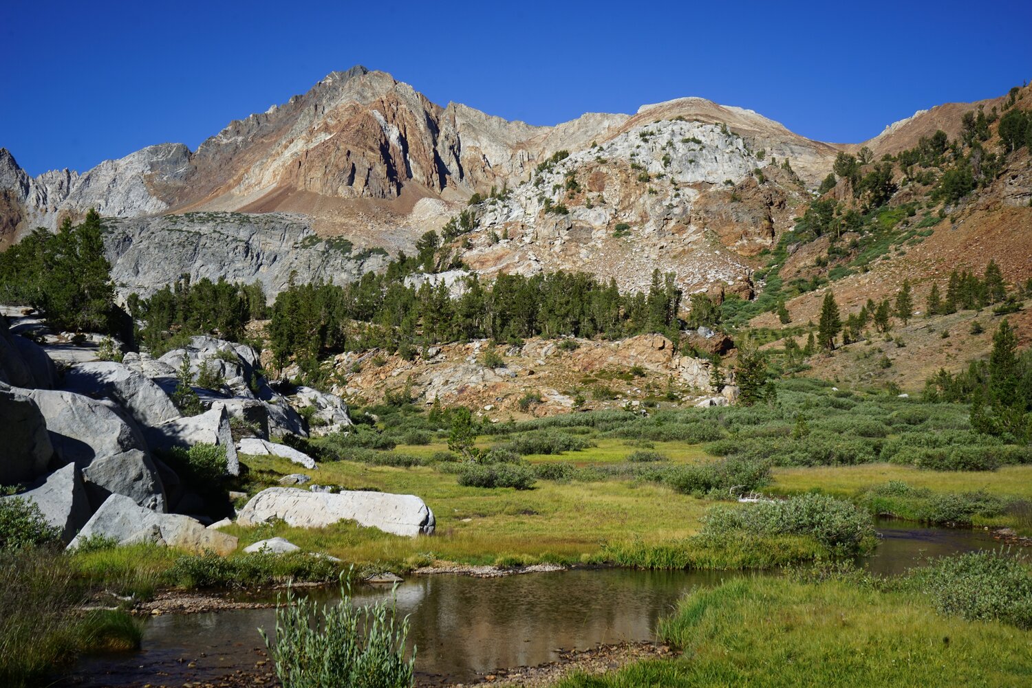 The view up McGee Canyon past all of the fragrant sagebrush. It was a quiet Thursday and I had the trail all to myself. I hiked up to the meadow below Big McGee Lake only stopping once or twice for water and a snack. I stopped and chatted with one solo backpacker heading out, but made good time up to the lake.