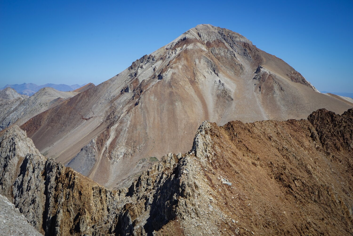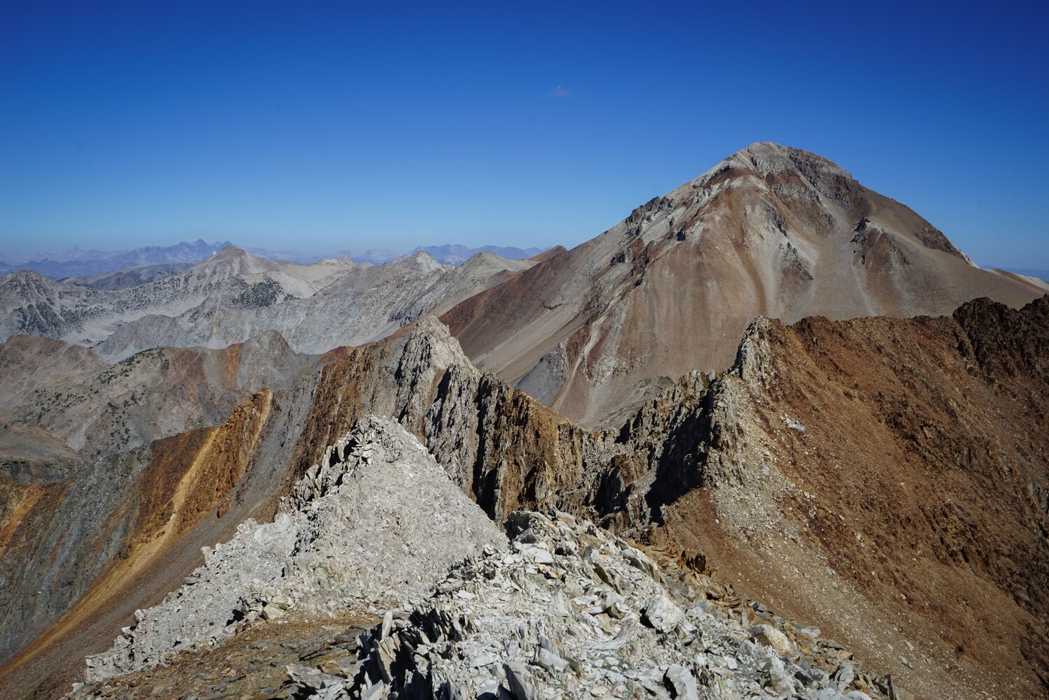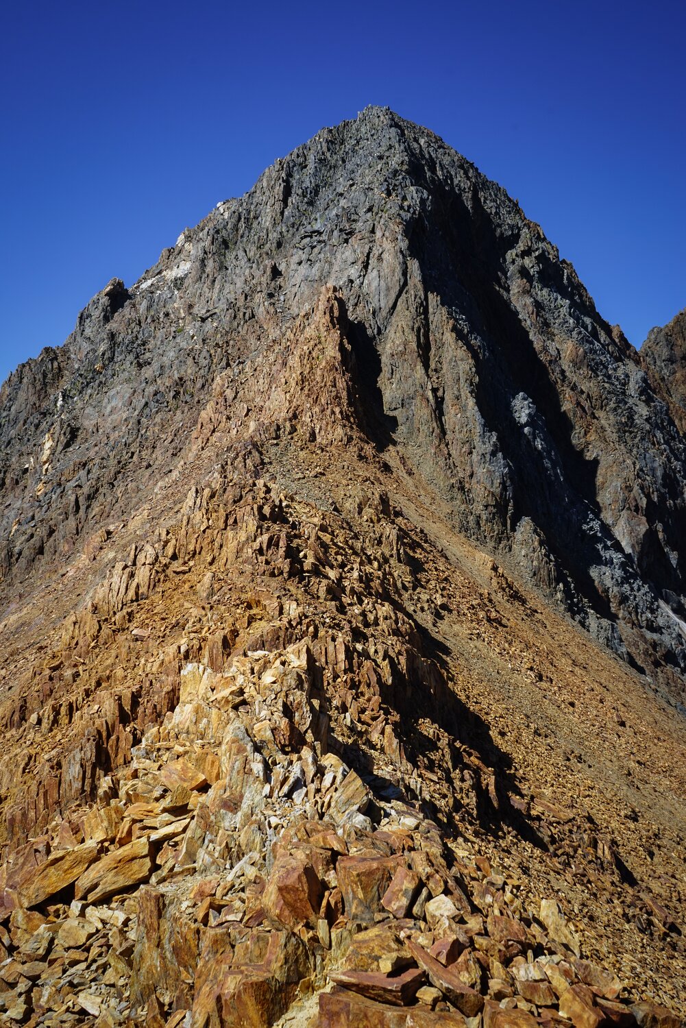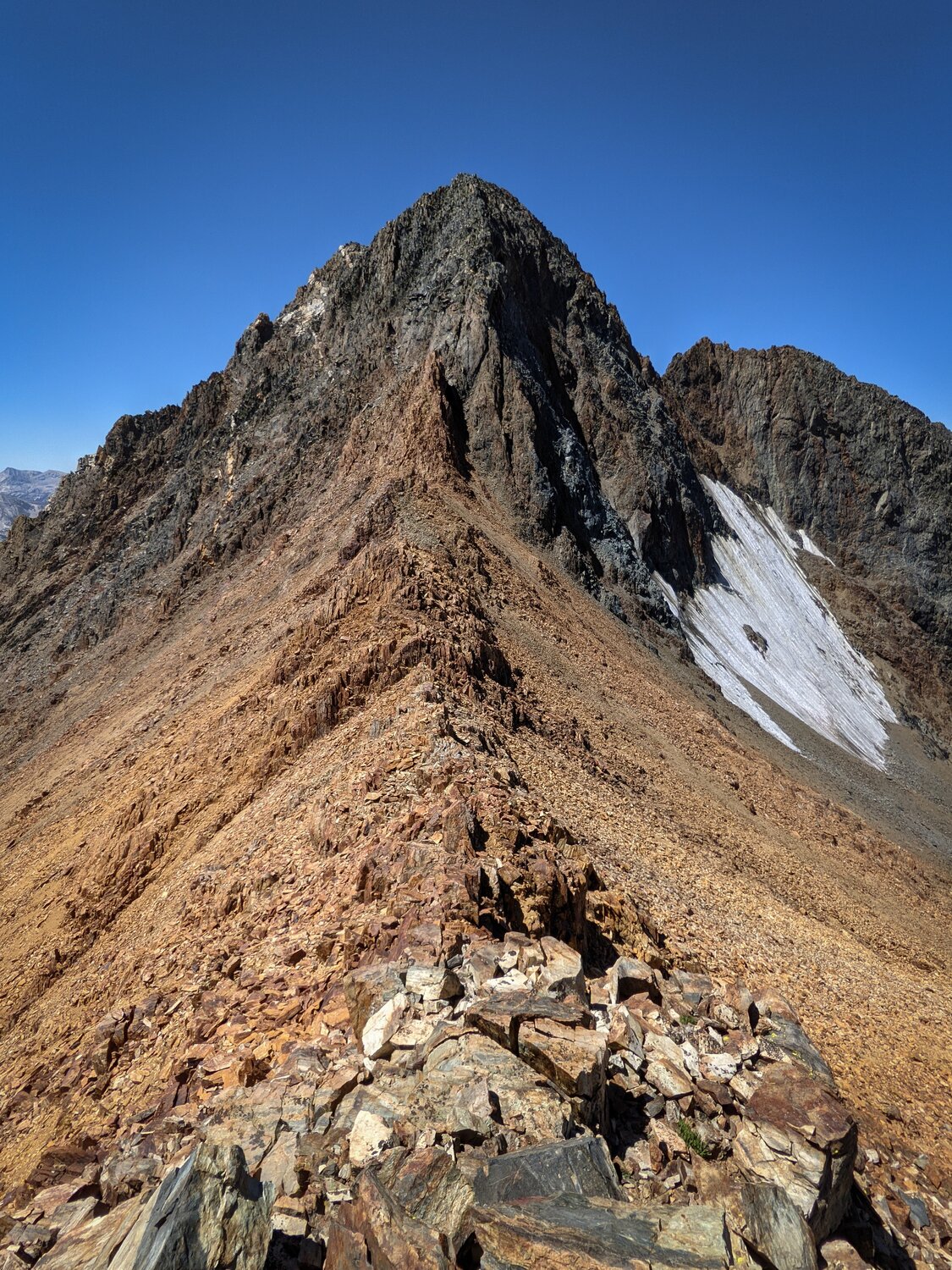 After criss-crossing some small spires along the ridgeline and cutting climber’s left when the going got difficult, this broad chute appeared about 100’ left of the ridgeline. It was steep, but solidly class 3. And while there was loose rock littered everywhere, the rock underneath was solid for the most part. There was 300’ or so of this actually somewhat enjoyable climbing up to the summit.