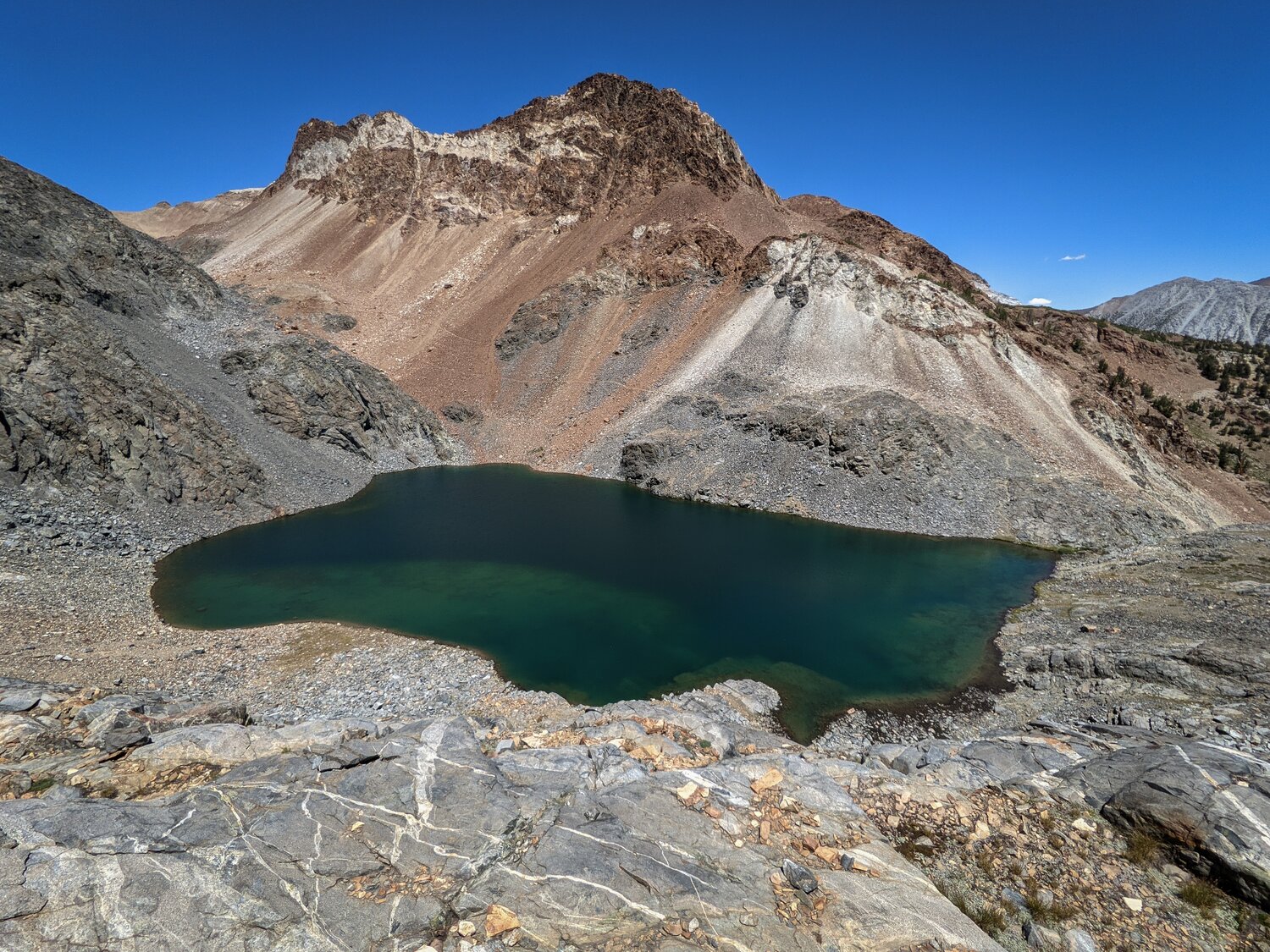 After a couple of successful outings the past two days, I identified Red and White Mountain as my goal for today’s outing. I had attempted to climb this mountain a couple of weeks earlier, but was turned around near Little McGee Lake by an early round of afternoon thunderstorms. I hadn’t even gotten up to the tricky section either. See, this peak has some rather disparaging route descriptions in Secor and on SummitPost. Secor says that the Northeast Ridge route is the best on this mountain simply because it has less loose rock, and the <a href=”https://www.summitpost.org/northeast-ridge/162778”>SummitPost route description</a> is similarly uninspiring.