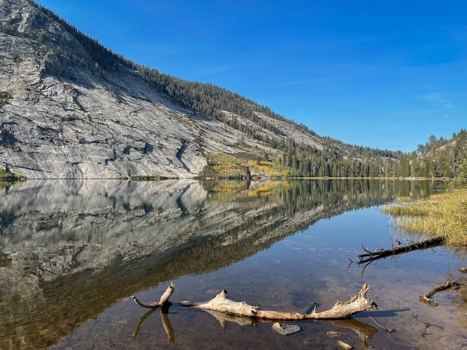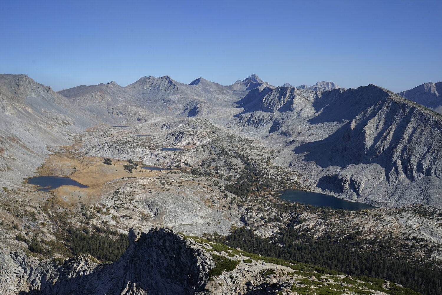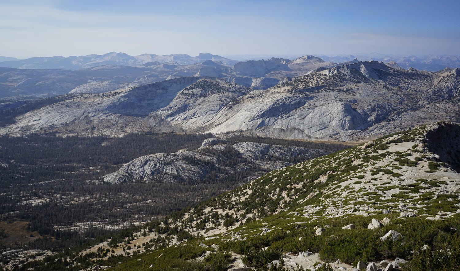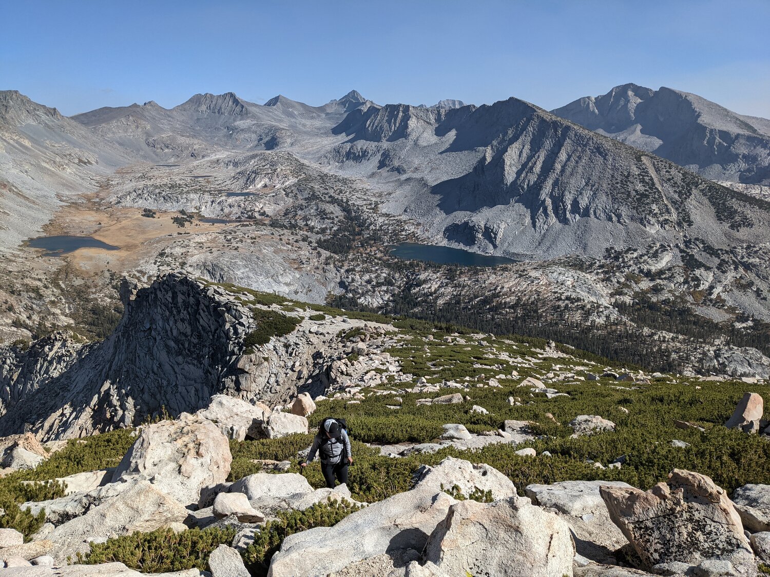 Southeast towards Bernice Lake and Mount Maclure. There was no summit register on Vogelsang Peak. But there was faint cell phone reception, so we downloaded a fresh forecast from the National Weather Service. It called for the cold front to arrive this afternoon, which we could already feel and see in the air, and then for temperatures to plummet into the mid-teens for the next couple of nights, much colder than we expected, before a gradual return to the previous day’s conditions by the weekend. That all seemed to line up with our expectation that the smoke would clear and it would get very cold for a couple of days, but we expected that the smoke would make a gradual return by the end of our trip. So, we figured we’d go ahead with our plan.