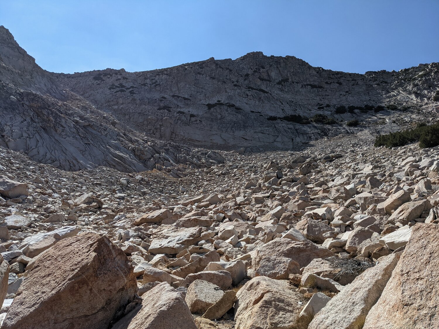 When we crested the gully on to the slope of Vogelsang Peak we were greeted with lots of scrubby little pines that grew in every sandy area along the slope. It made for quite a chore to make upwards progress between the large boulders and pine trees. After a couple hundred vertical feet or so we reached the class 3 rocks of the summit and scrambled up to a little perch.