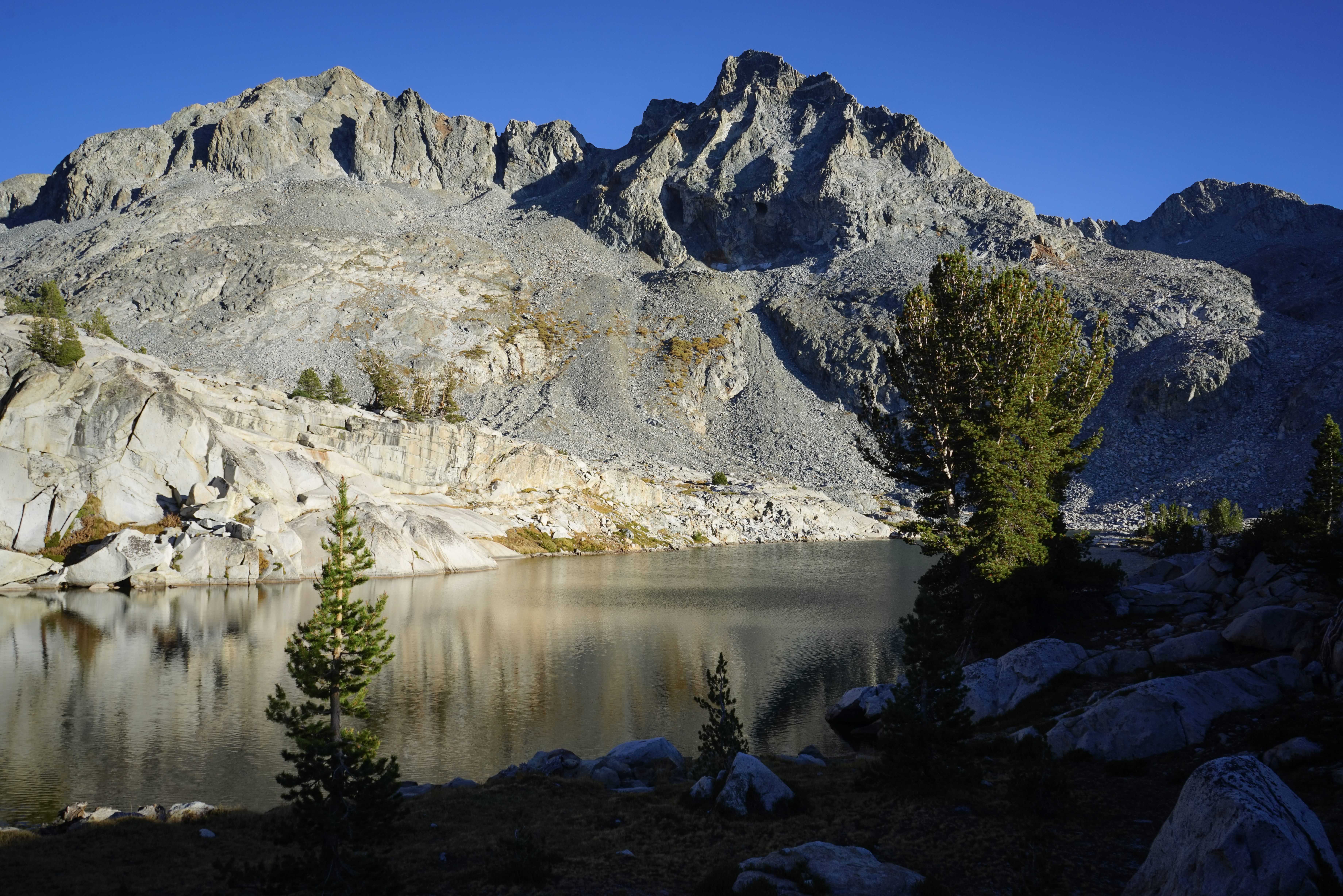 After negotiating one tricky section, we wrapped around the north side of Lake 10217 and began searching for a campsite in some small pines on the west shore. Soon enough we found something that would do the trick for a night or two and set up camp.