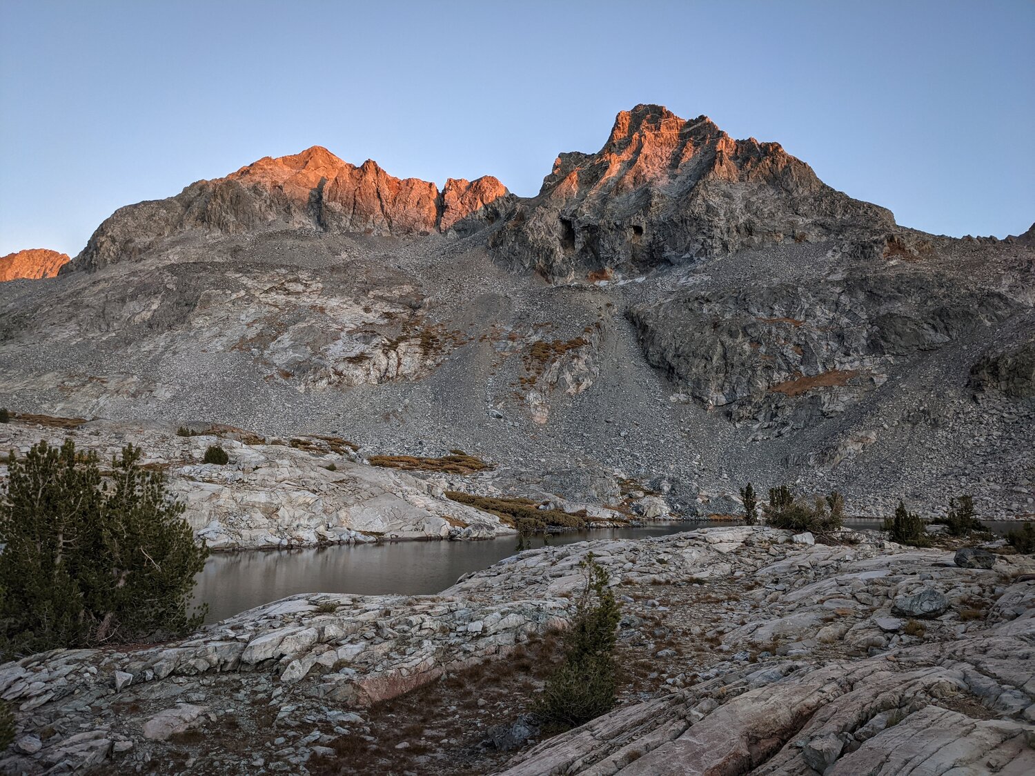 The last evening light on Mount Ansel Adams. We planned to take a zero day the next day to climb nearby Electra Peak, which we had some trouble picking out on the ridgeline above us due to its somewhat low prominence. We figured it must still be on the SPS list for some reason anyways. With fewer preparations for the weather, we tucked into bed and enjoyed a podcast before sleeping.